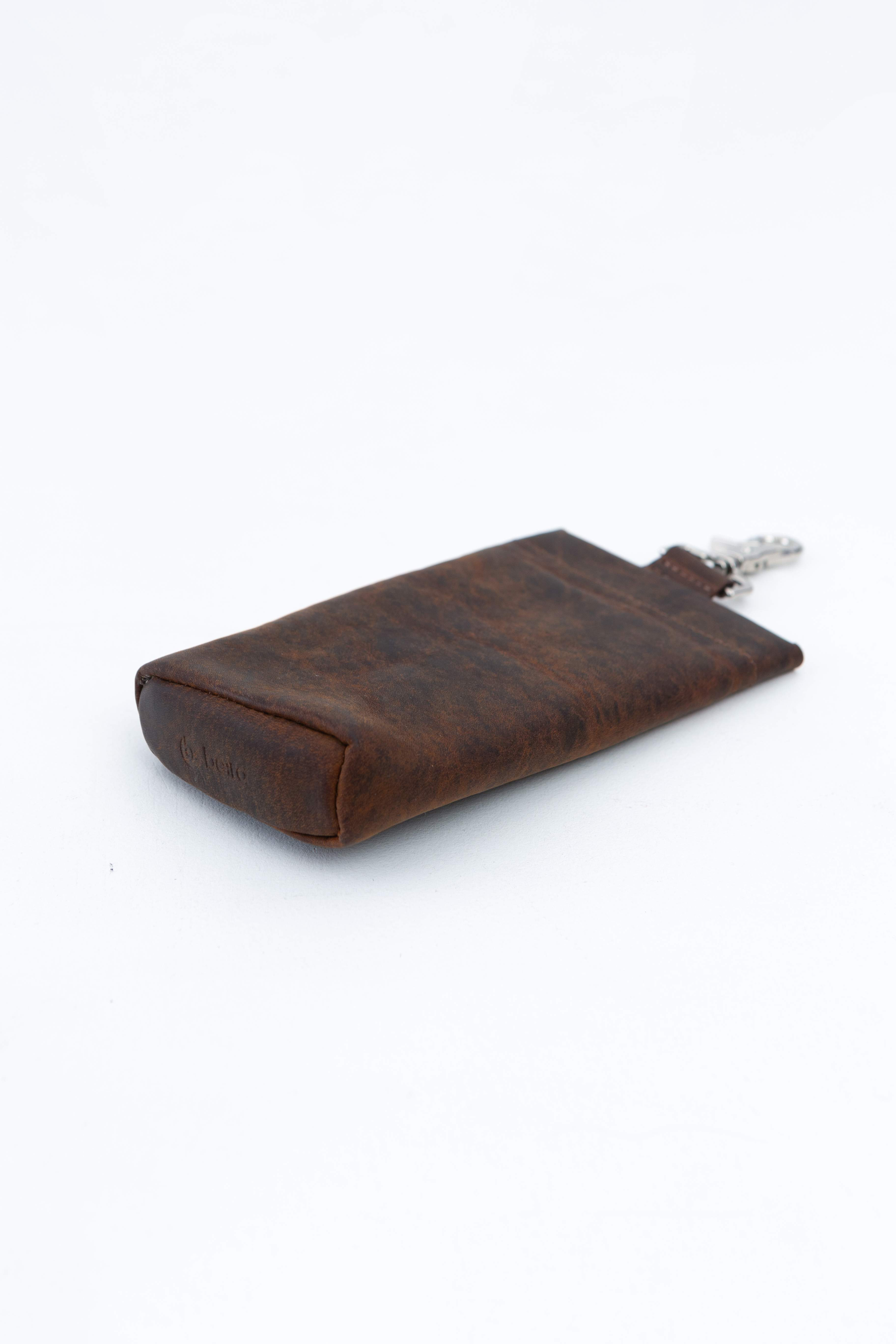 Металлический карабин с кольцевым захватом и кнопка, обтянутая кожей в цвет изделия