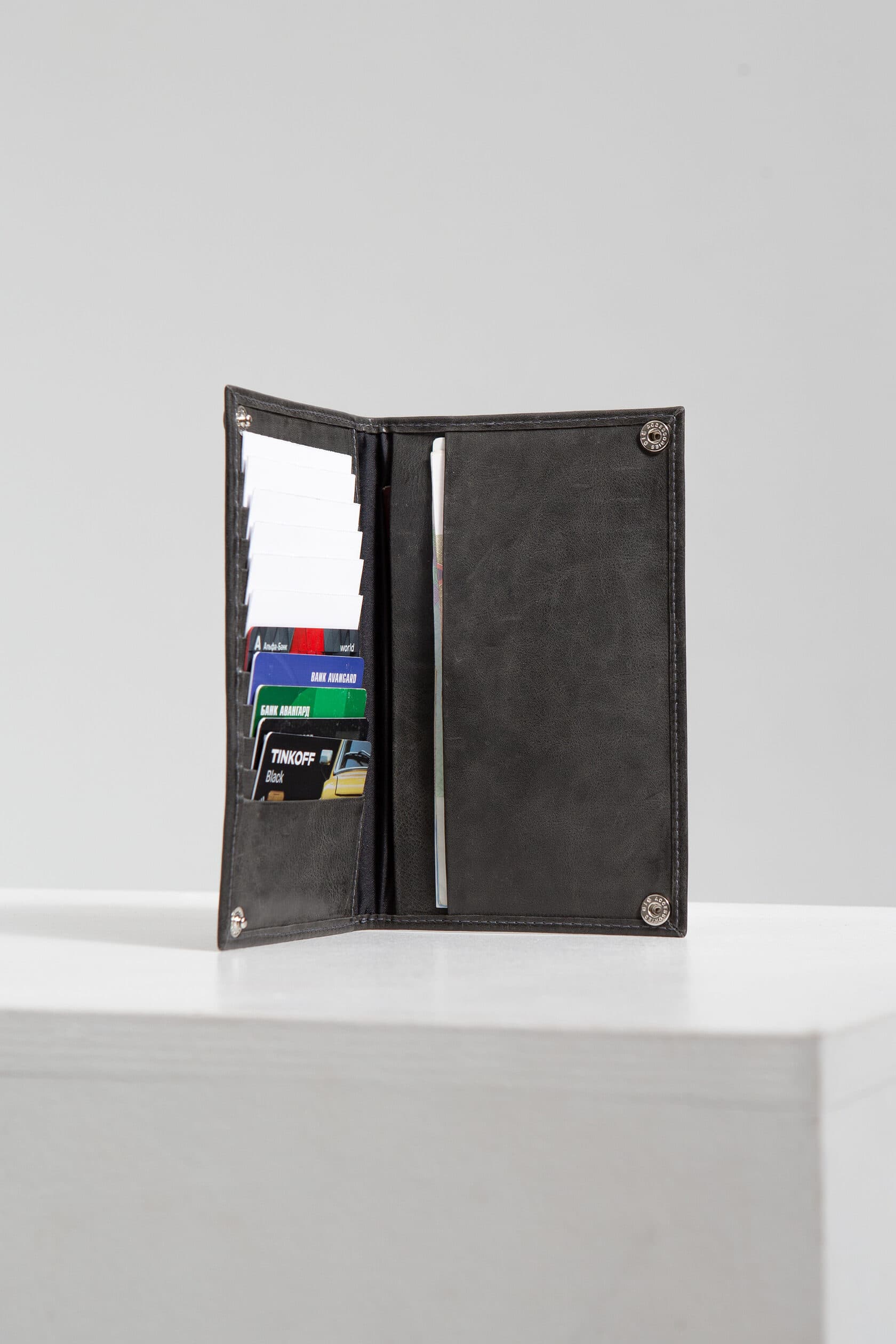 Внутри — планшет с 12 карманами для карт. Карманы расположены лесенкой, все карты видны и легко достаются.