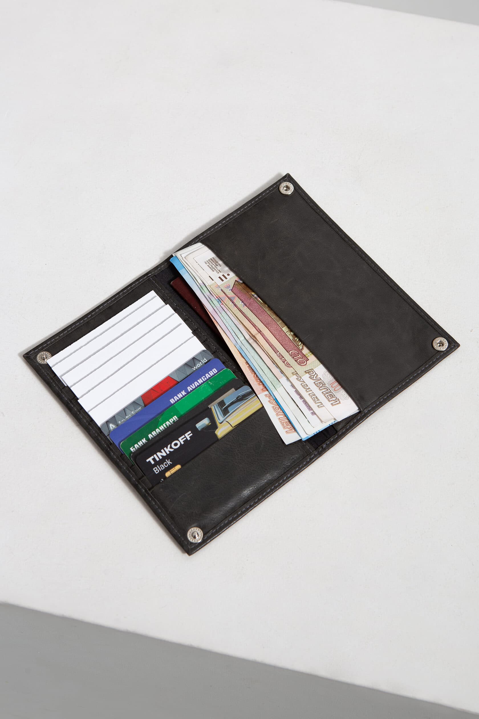 В портмоне легко влезают не только купюры, но и паспорт. Оно закрывается на кнопки.