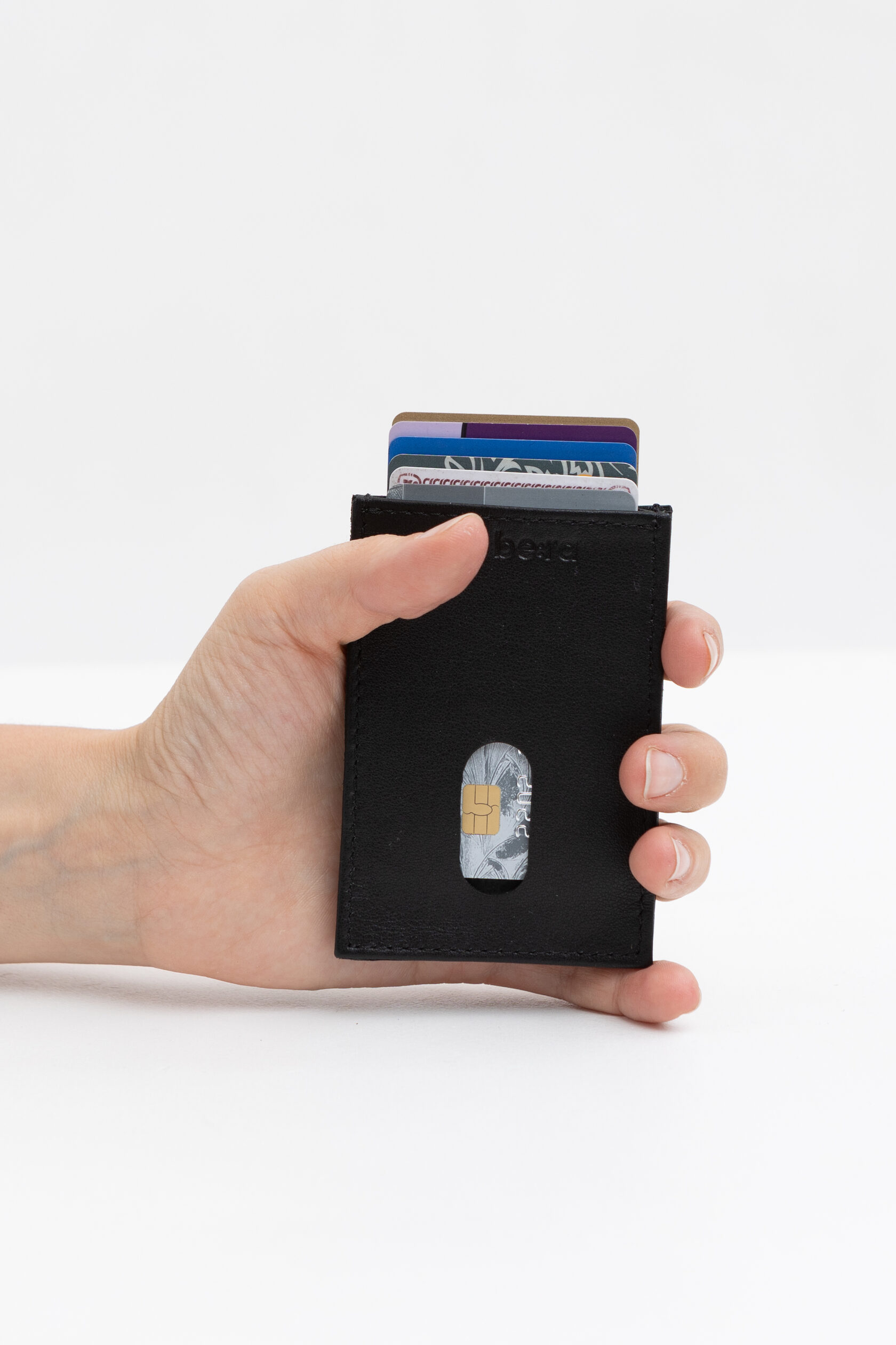 Кожаный кардхолдер состоит из двух карманов. В каждом кармане помещается до 5 карточек.