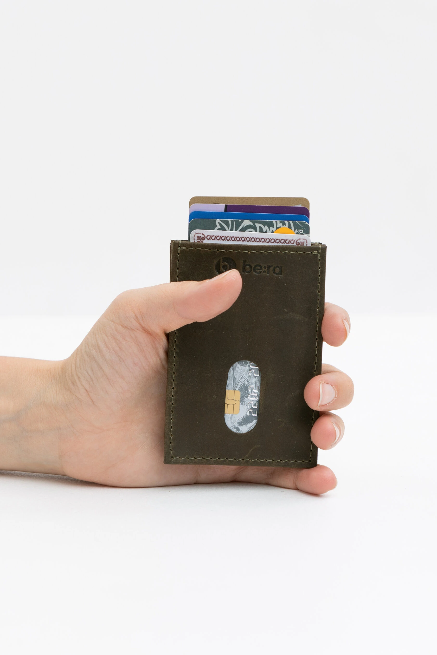 Кожаный кардхолдер состоит из двух карманов. В каждом кармане помещается до 5 карточек.