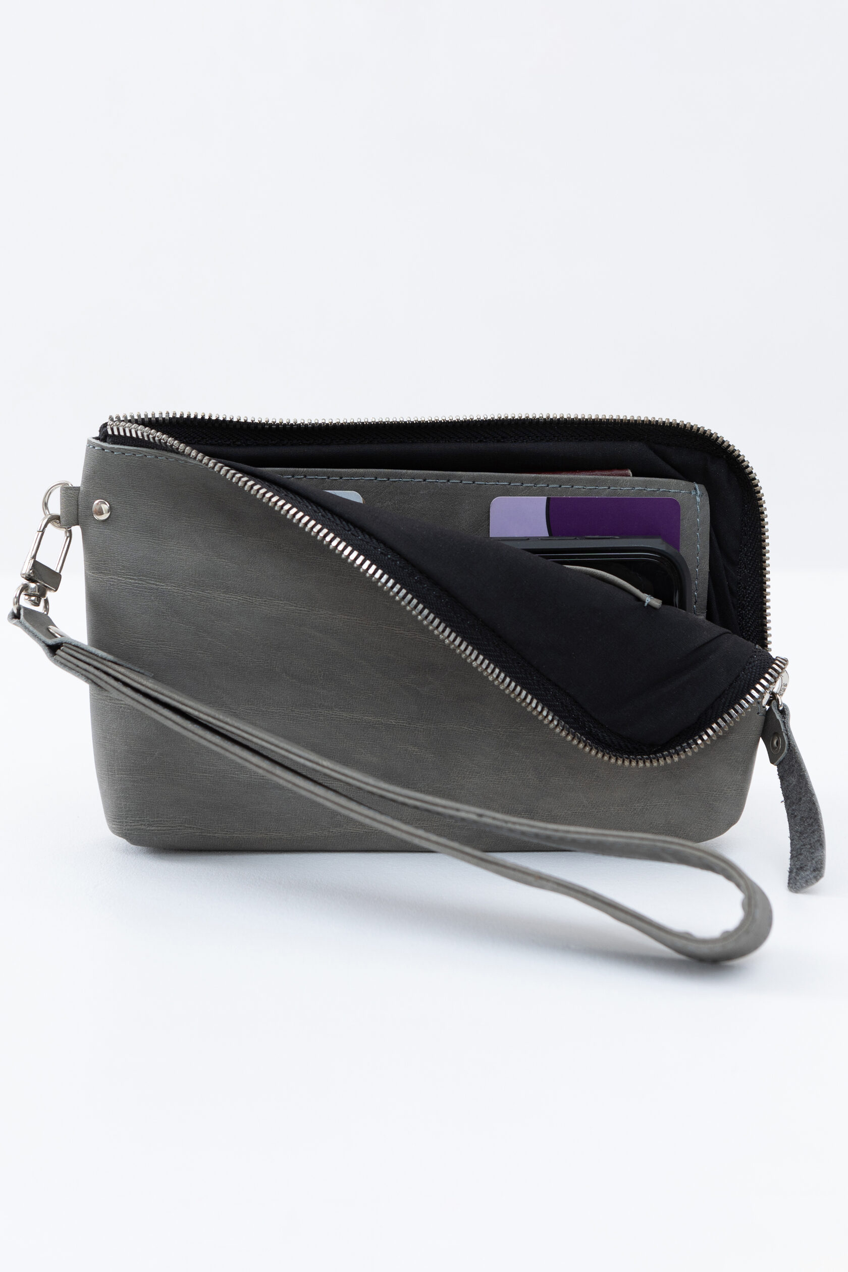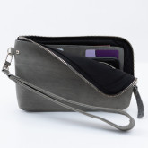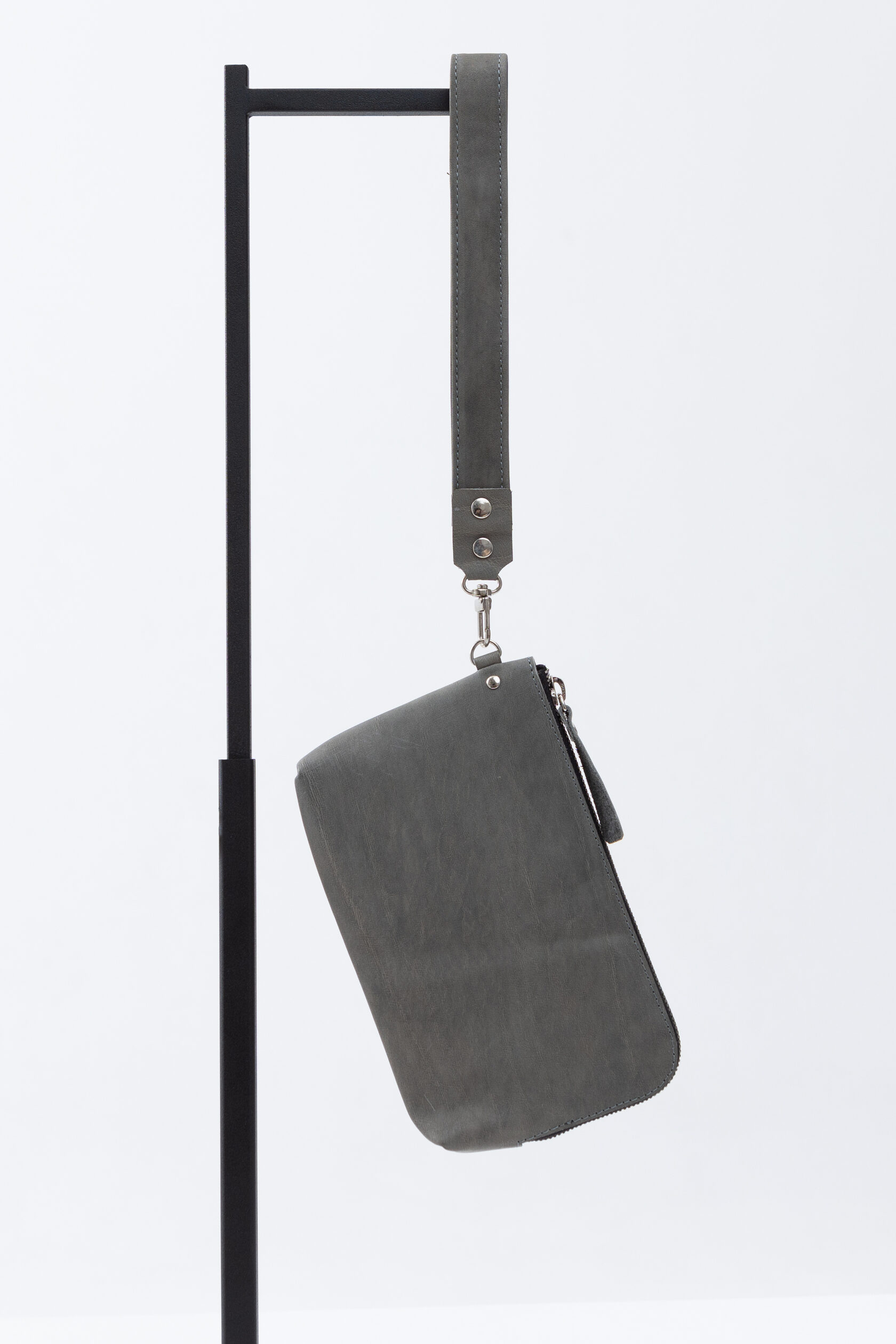 Сумка прямоугольной формы на молнии, с наручной петлёй, пристёгивающейся на карабине.