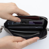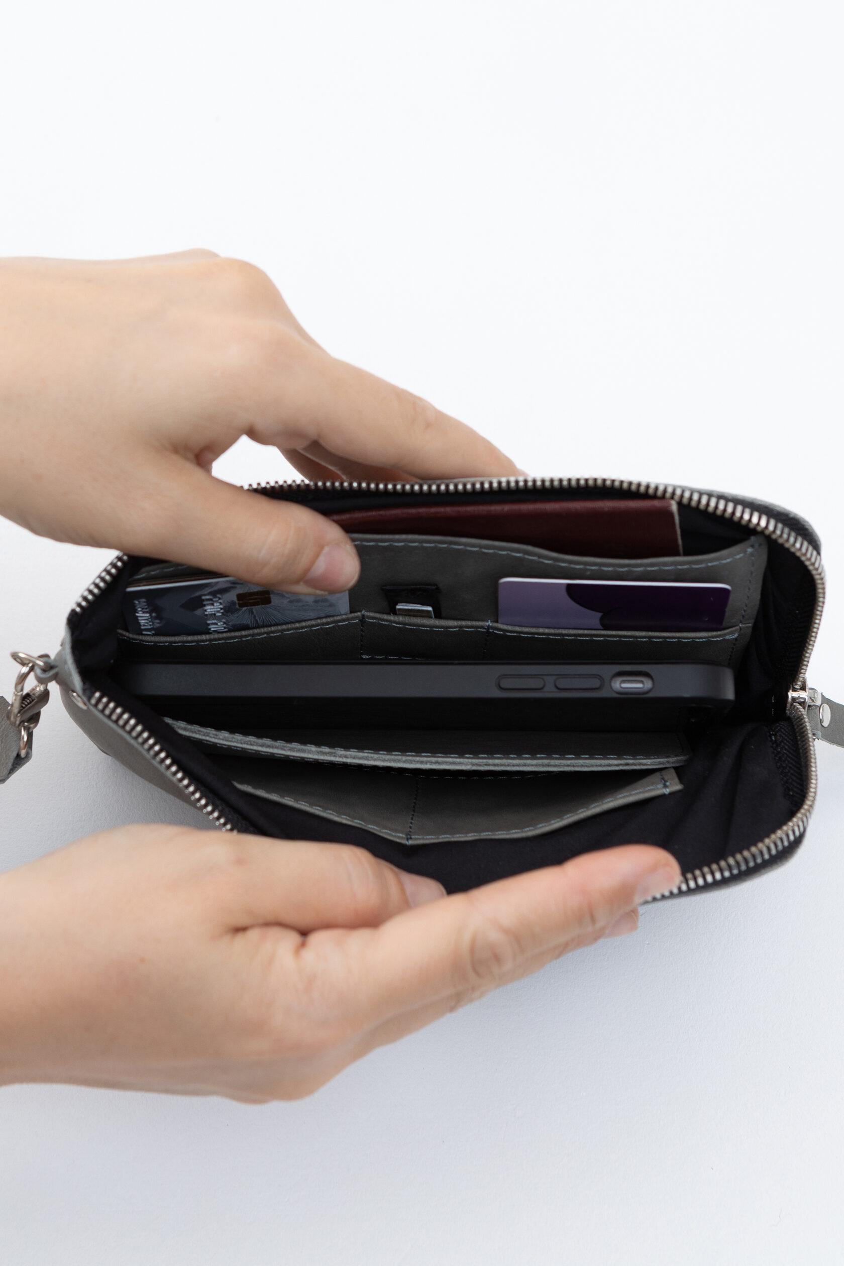 Внутри сумки сделана жёсткая, но подвижная перегородка. Она разделяет купюры и телефон, если они лежат вместе, — чтобы они не цеплялись друг за друга и не вылетали, когда не надо.