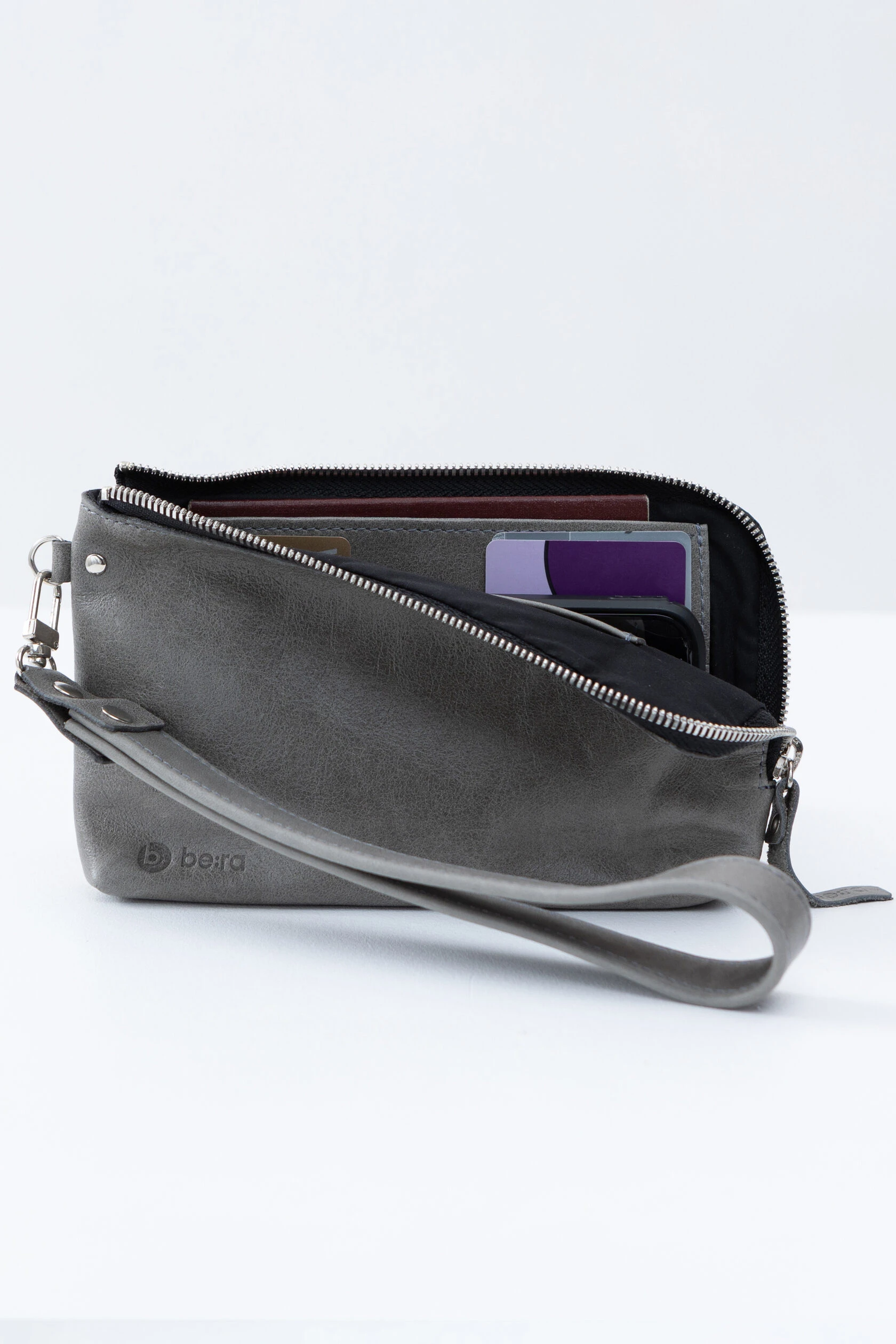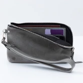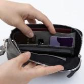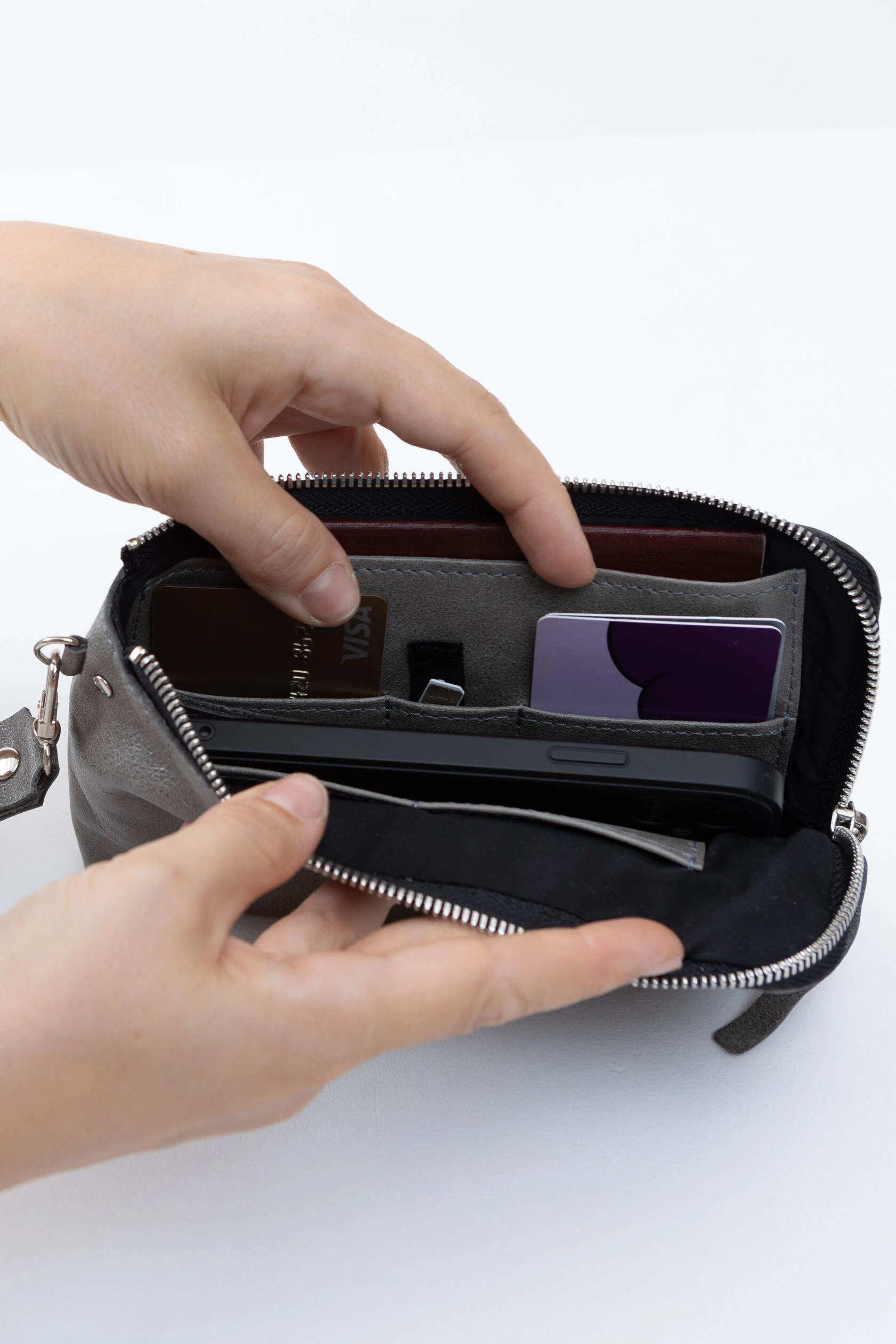 Внутри сумки сделана жёсткая, но подвижная перегородка. Она разделяет купюры и телефон, если они лежат вместе, — чтобы они не цеплялись друг за друга и не вылетали, когда не надо.