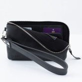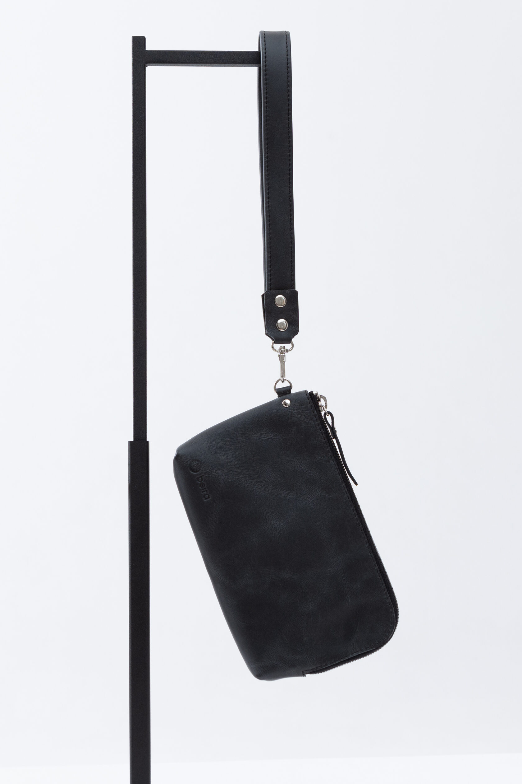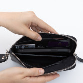 Сумка прямоугольной формы на молнии, с наручной петлёй, пристёгивающейся на карабине.