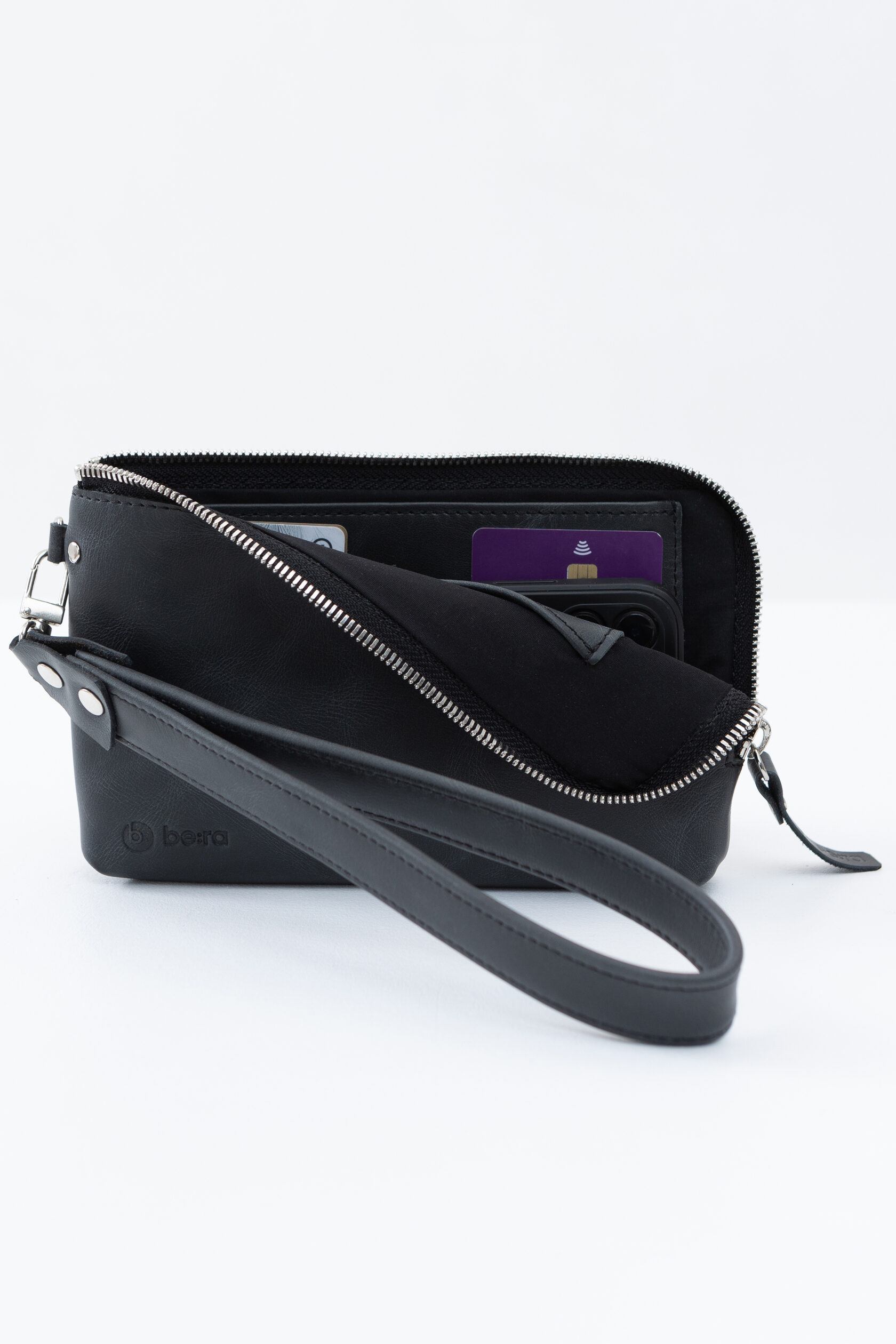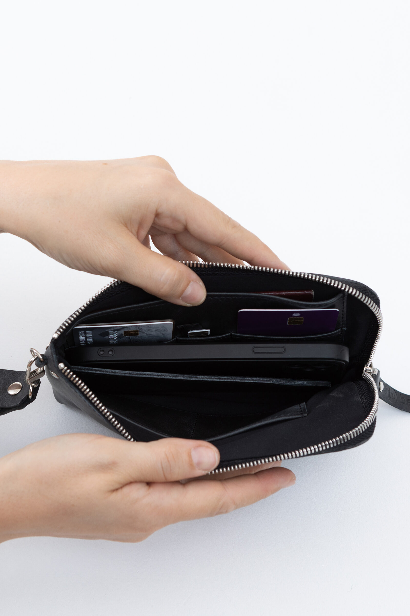 Внутри сумки сделана жёсткая, но подвижная перегородка. Она разделяет купюры и телефон, если они лежат вместе, — чтобы они не цеплялись друг за друга и не вылетали, когда не надо.