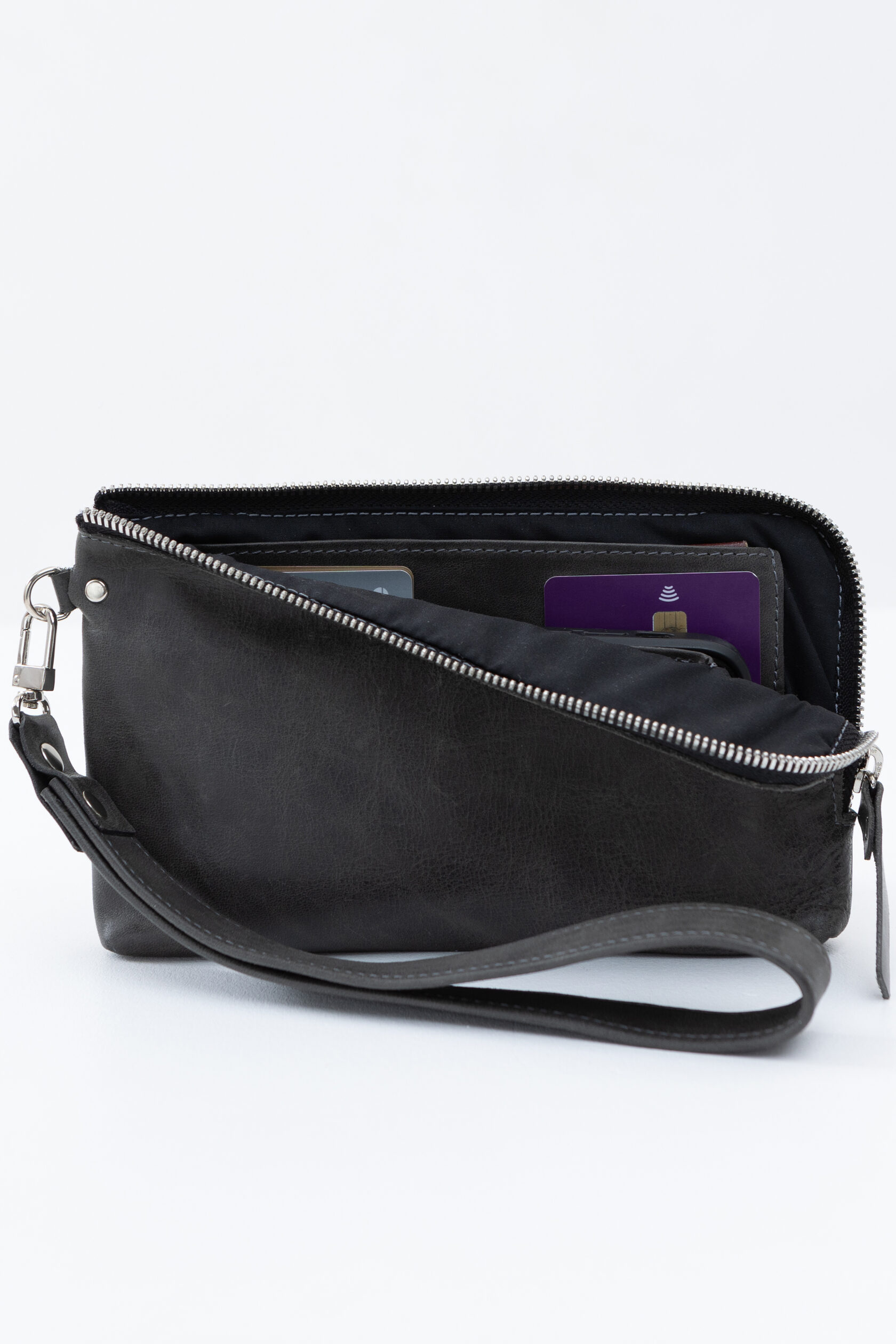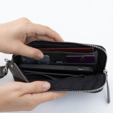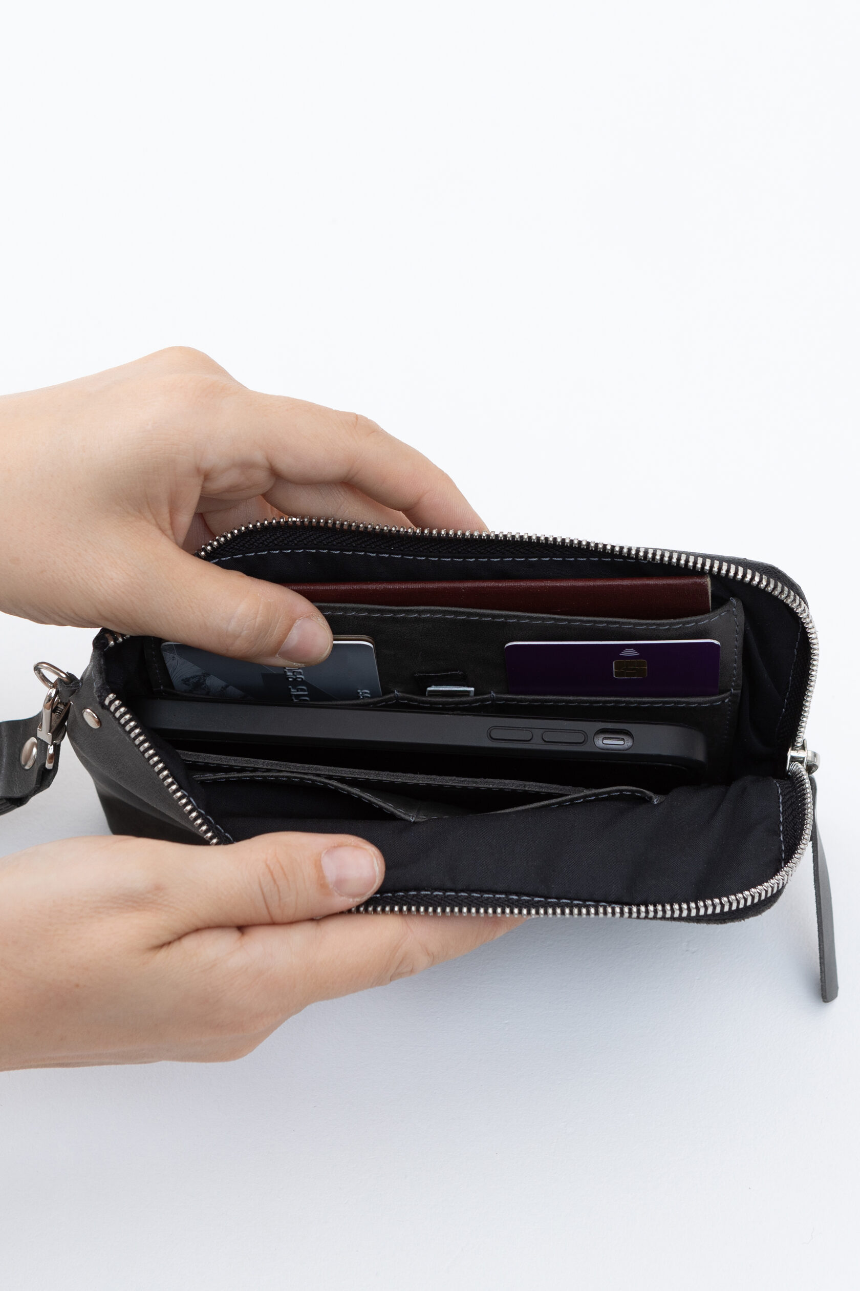 Внутри сумки сделана жёсткая, но подвижная перегородка. Она разделяет купюры и телефон, если они лежат вместе, — чтобы они не цеплялись друг за друга и не вылетали, когда не надо.