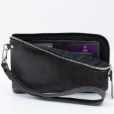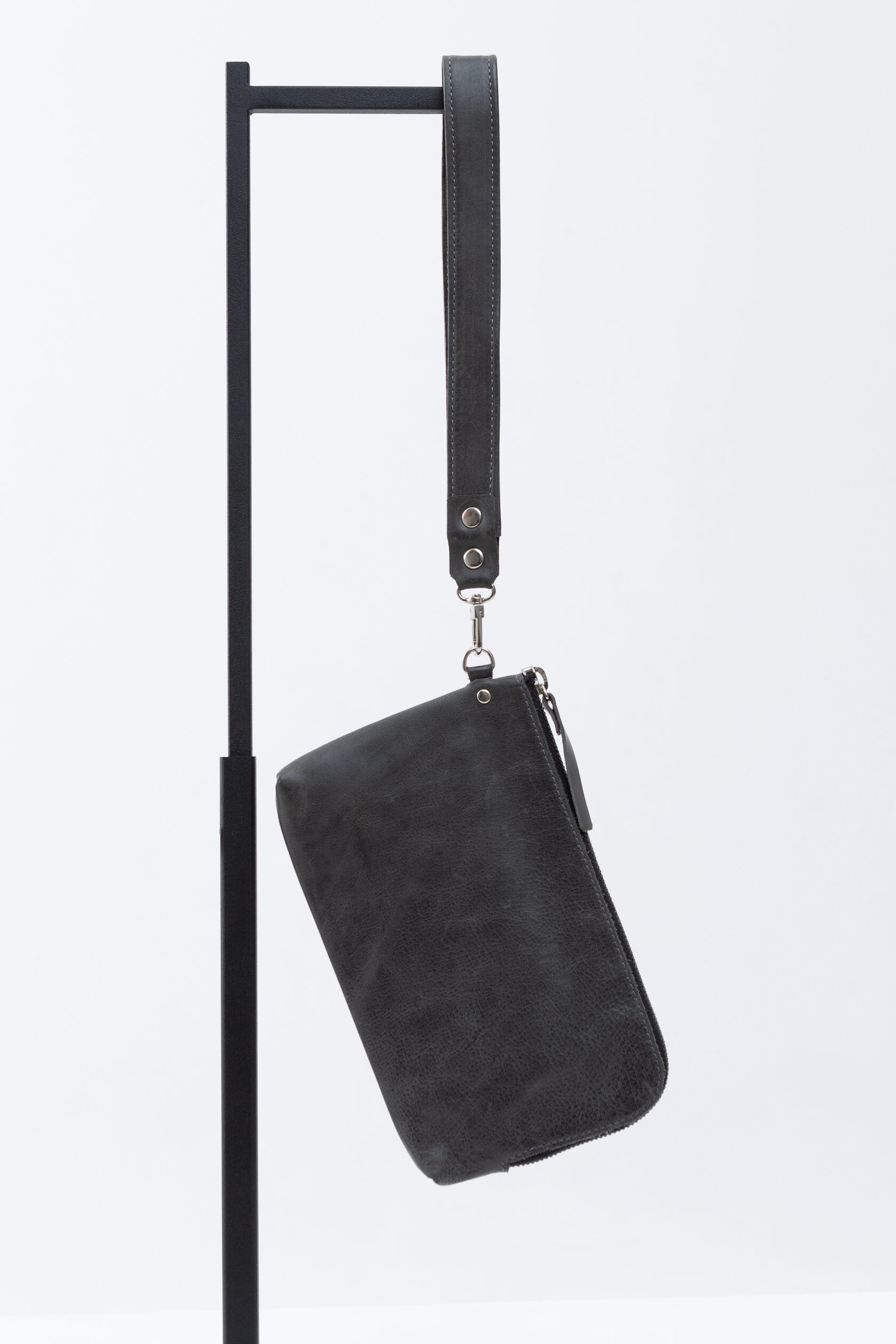 Сумка прямоугольной формы на молнии, с наручной петлёй, пристёгивающейся на карабине.