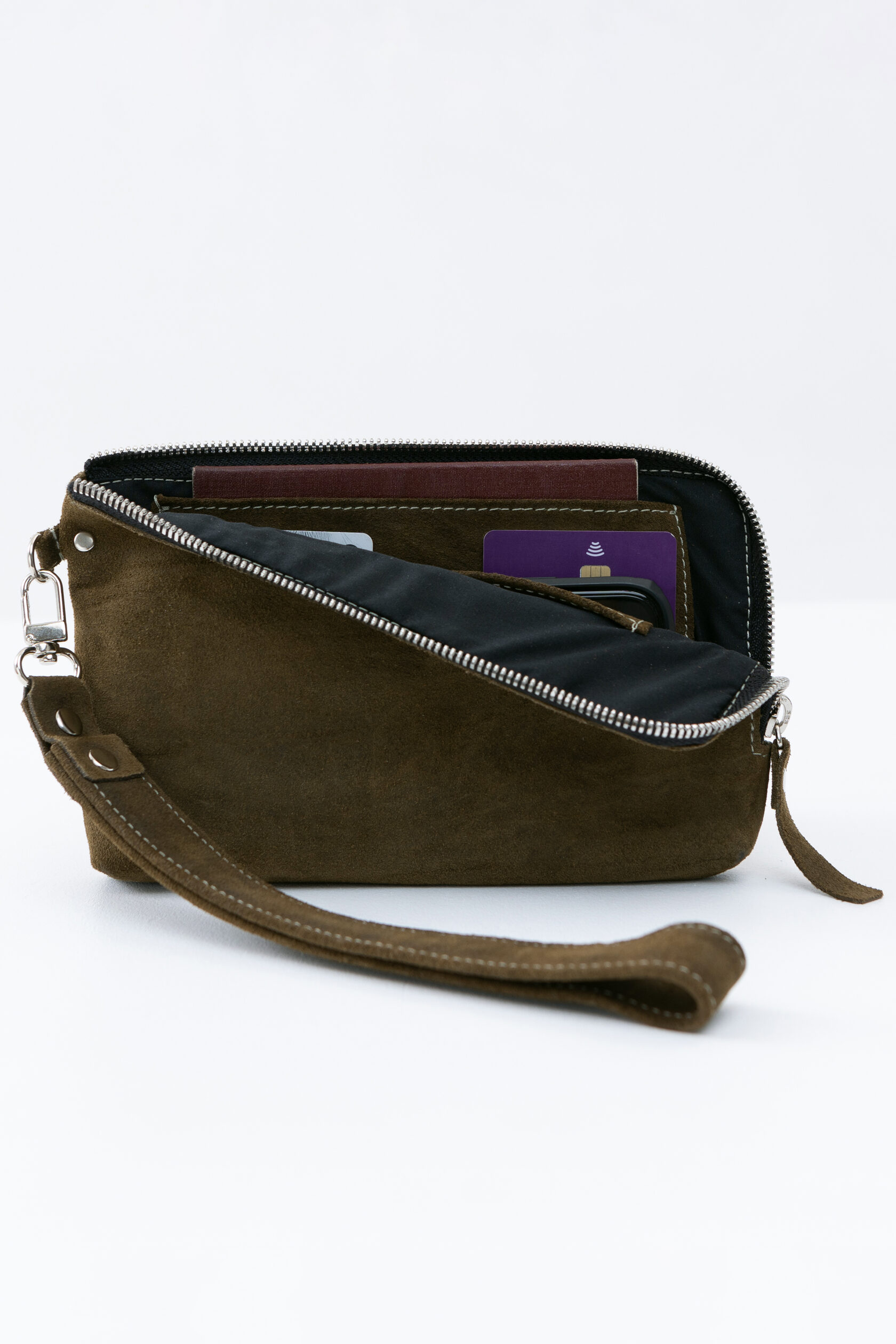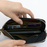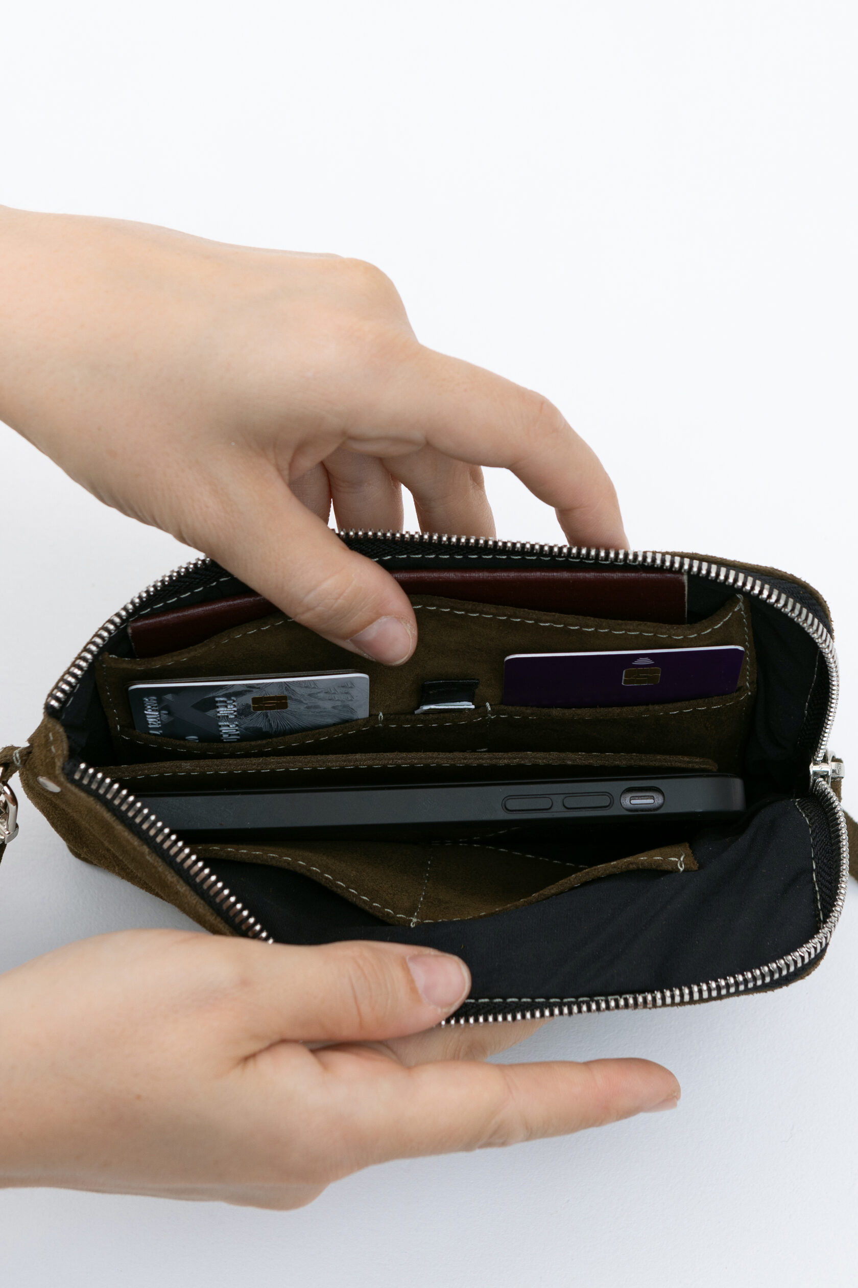 Внутри сумки сделана жёсткая, но подвижная перегородка. Она разделяет купюры и телефон, если они лежат вместе, — чтобы они не цеплялись друг за друга и не вылетали, когда не надо.