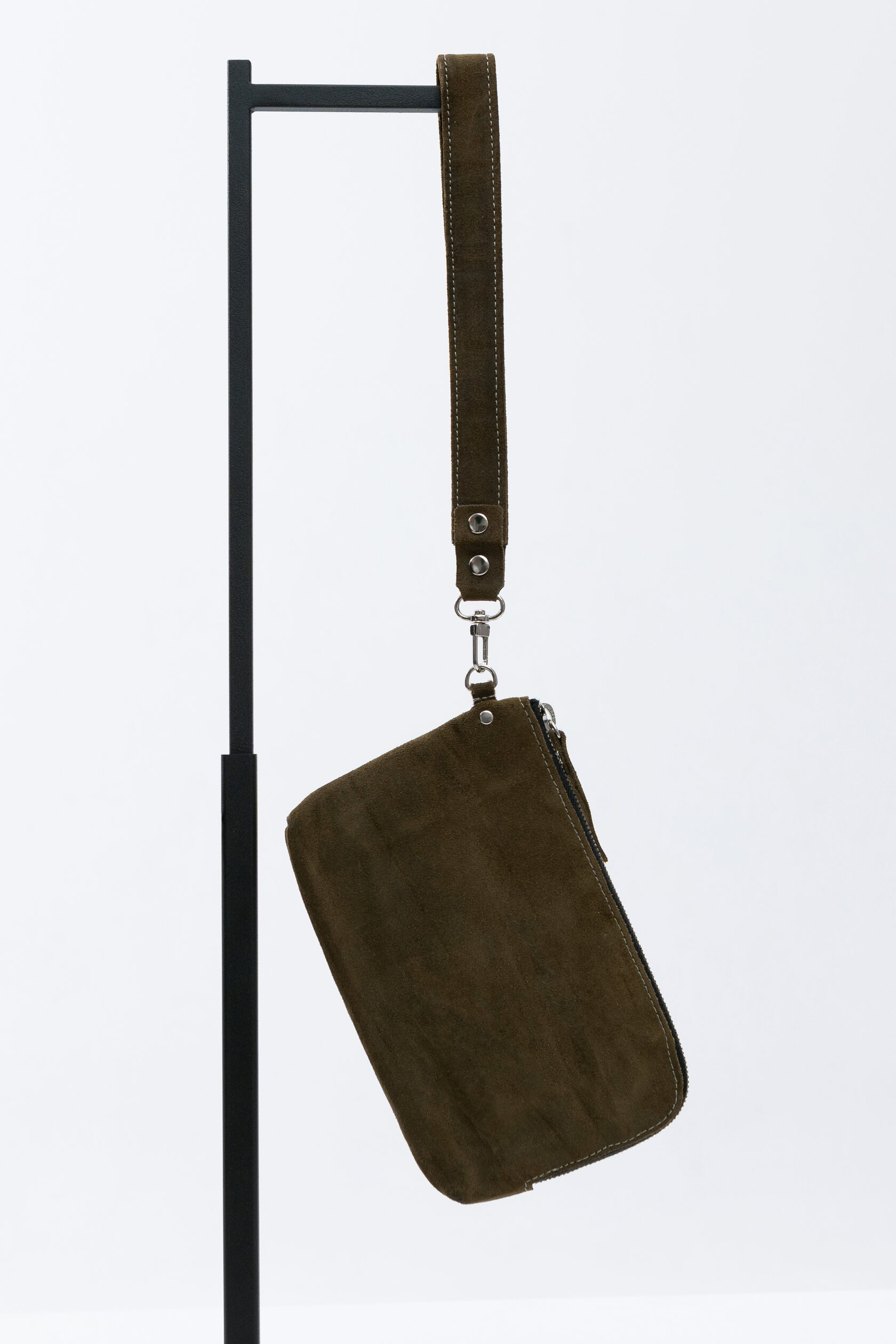 Сумка прямоугольной формы на молнии, с наручной петлёй, пристёгивающейся на карабине.
