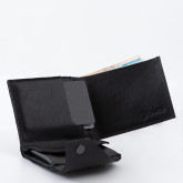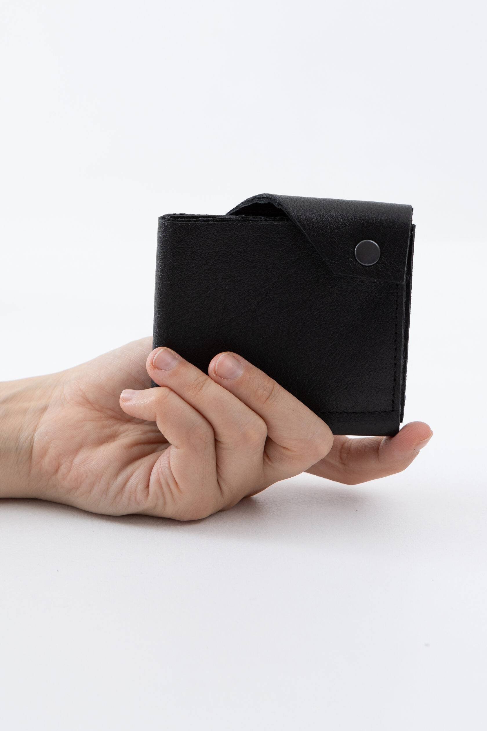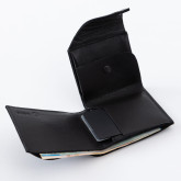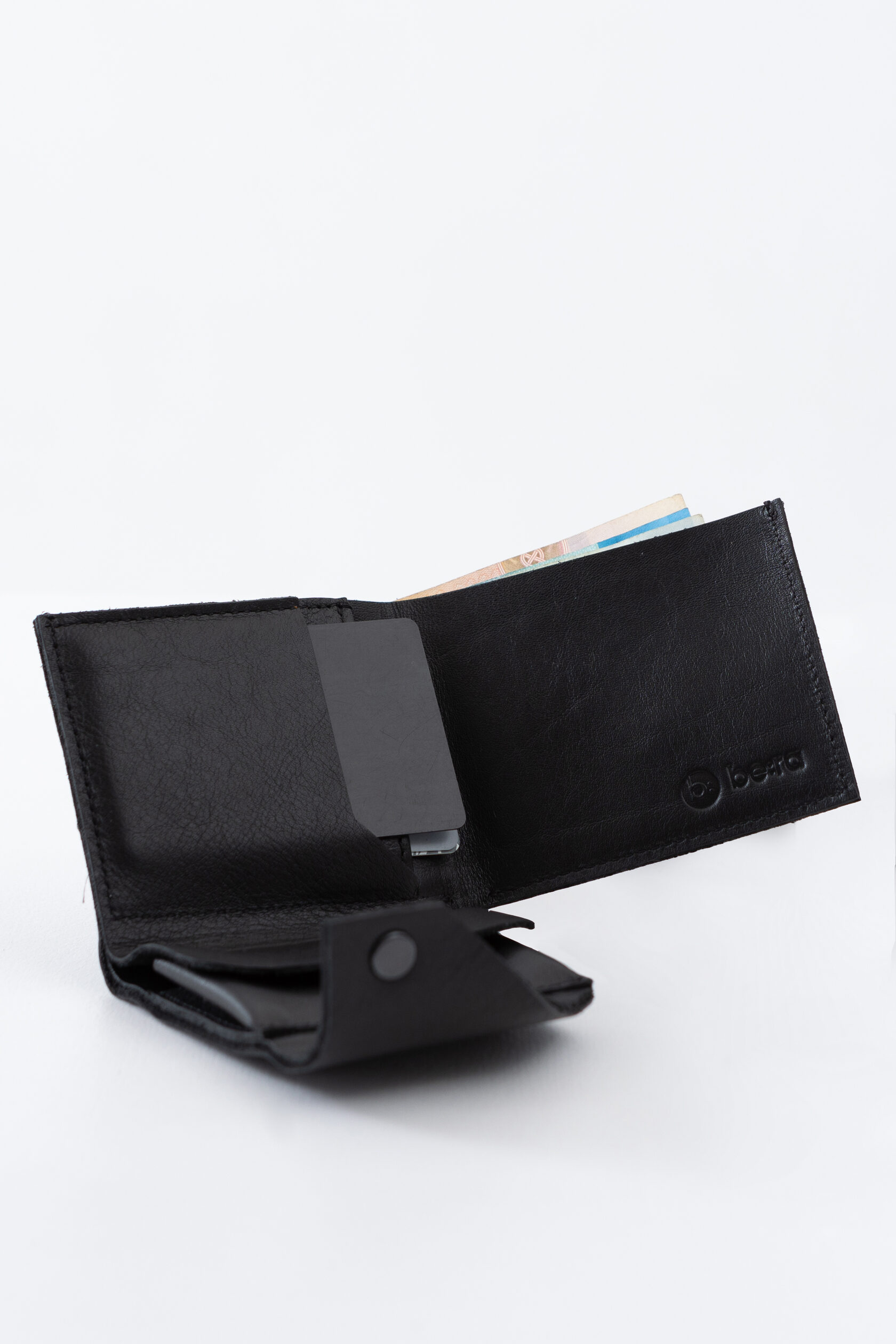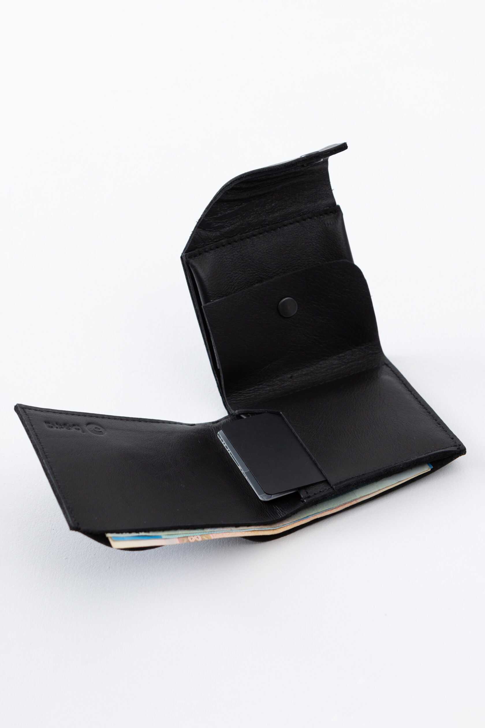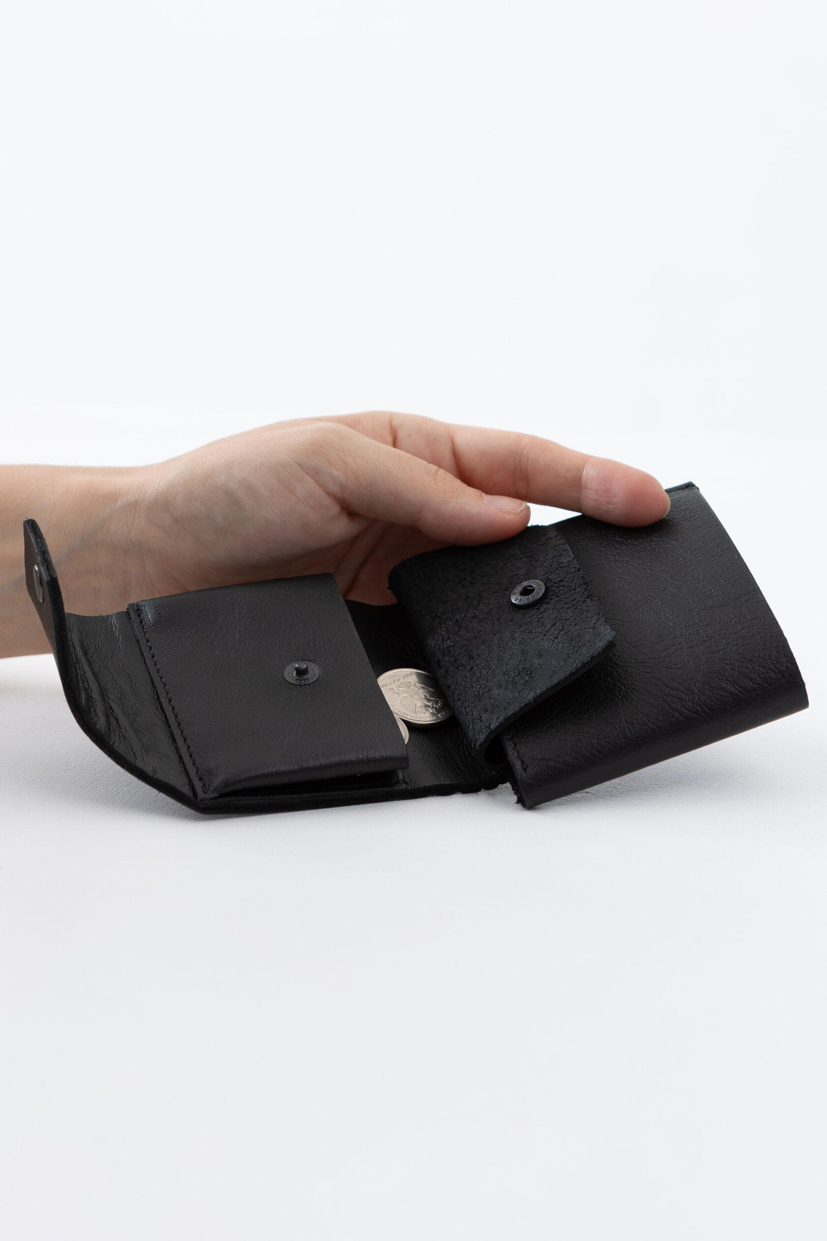 Кошелек не раскрывается весь сразу, а как будто раскручивается постепенно: первым под руку выплывает карман для мелочи, затем карманы с картами, и в самом конце, если нужно, открывается отсек с купюрами.