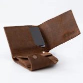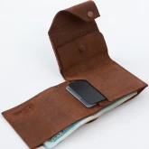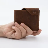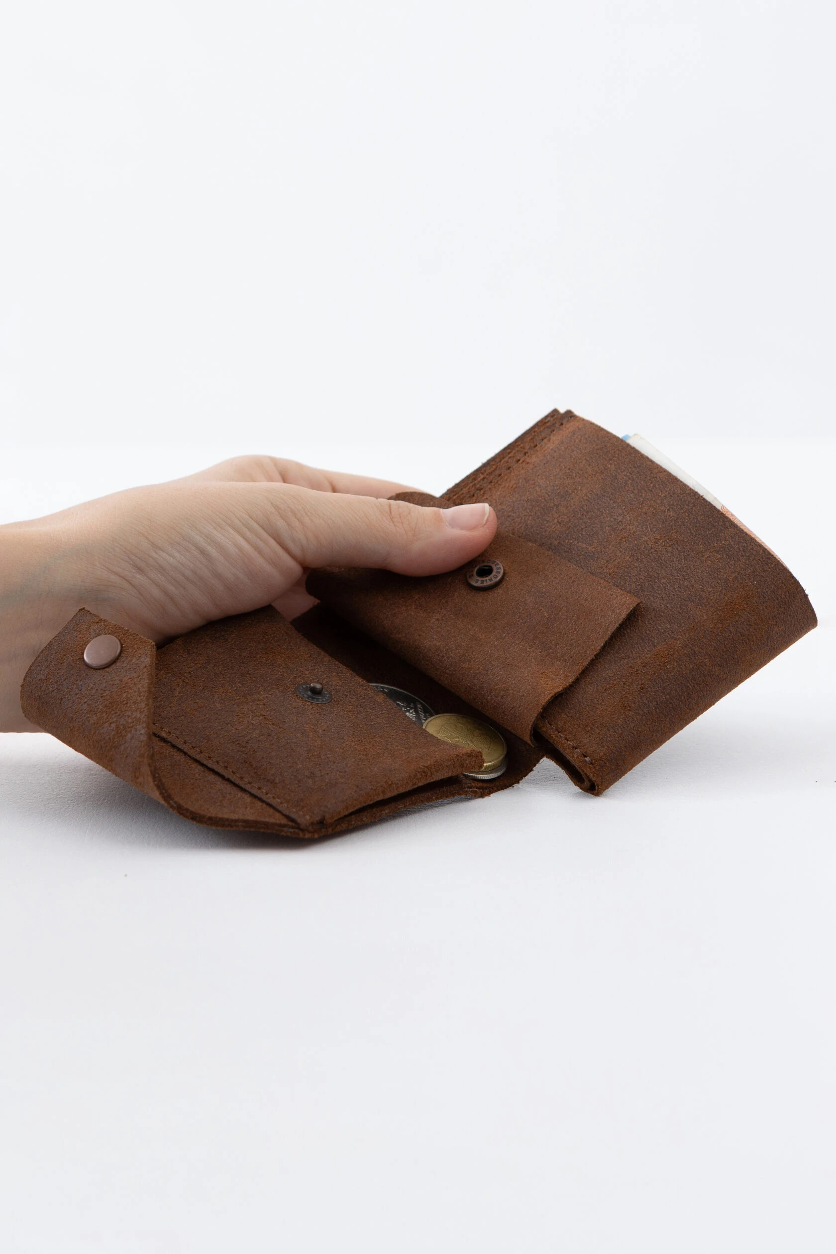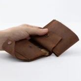Кошелек не раскрывается весь сразу, а как будто раскручивается постепенно: первым под руку выплывает карман для мелочи, затем карманы с картами, и в самом конце, если нужно, открывается отсек с купюрами.
