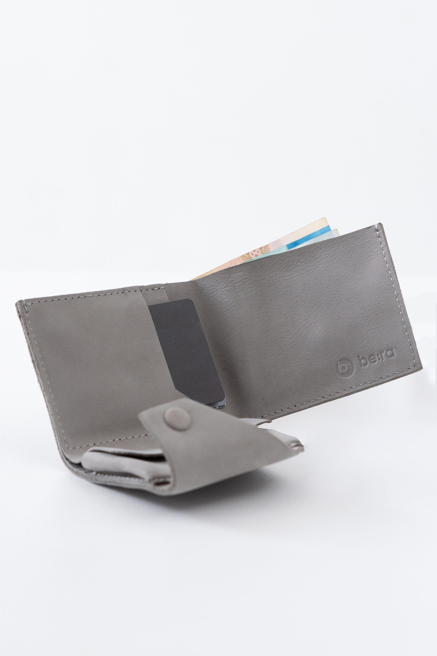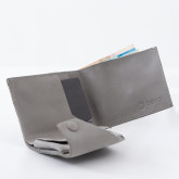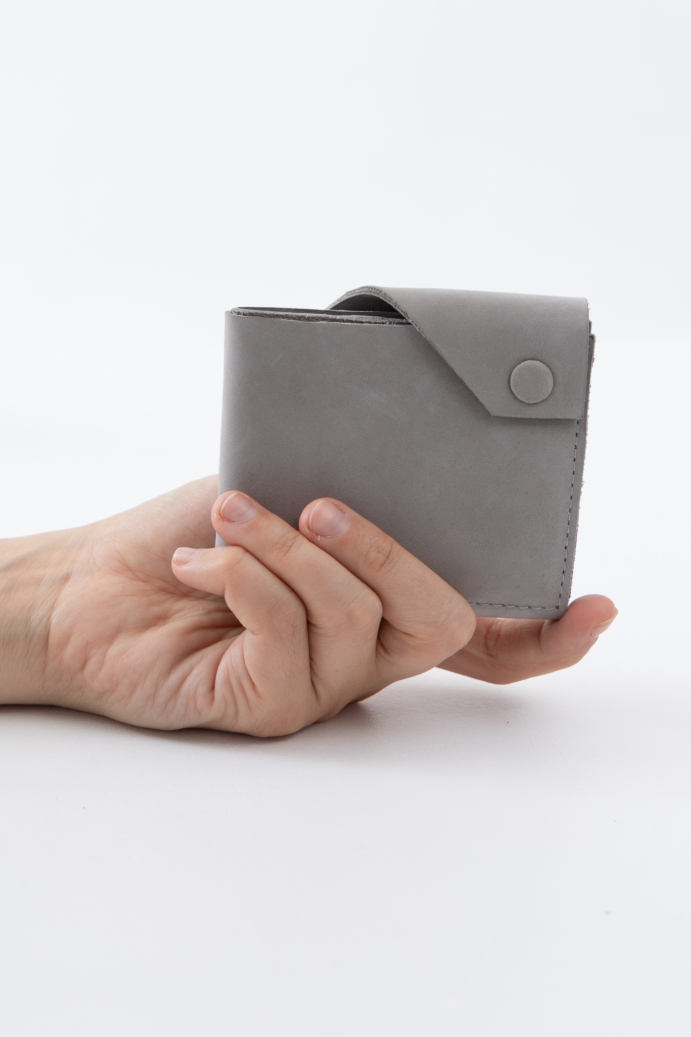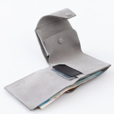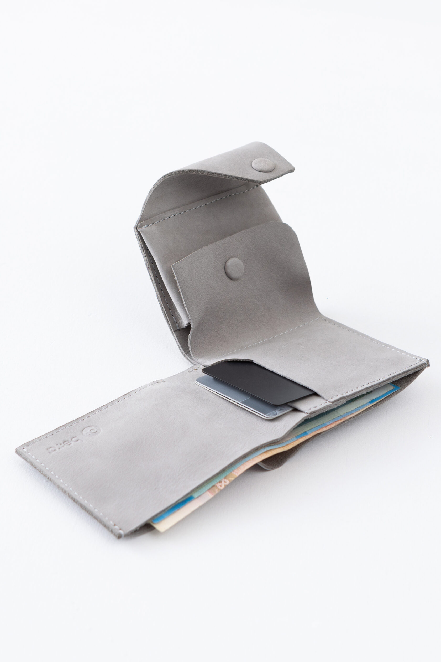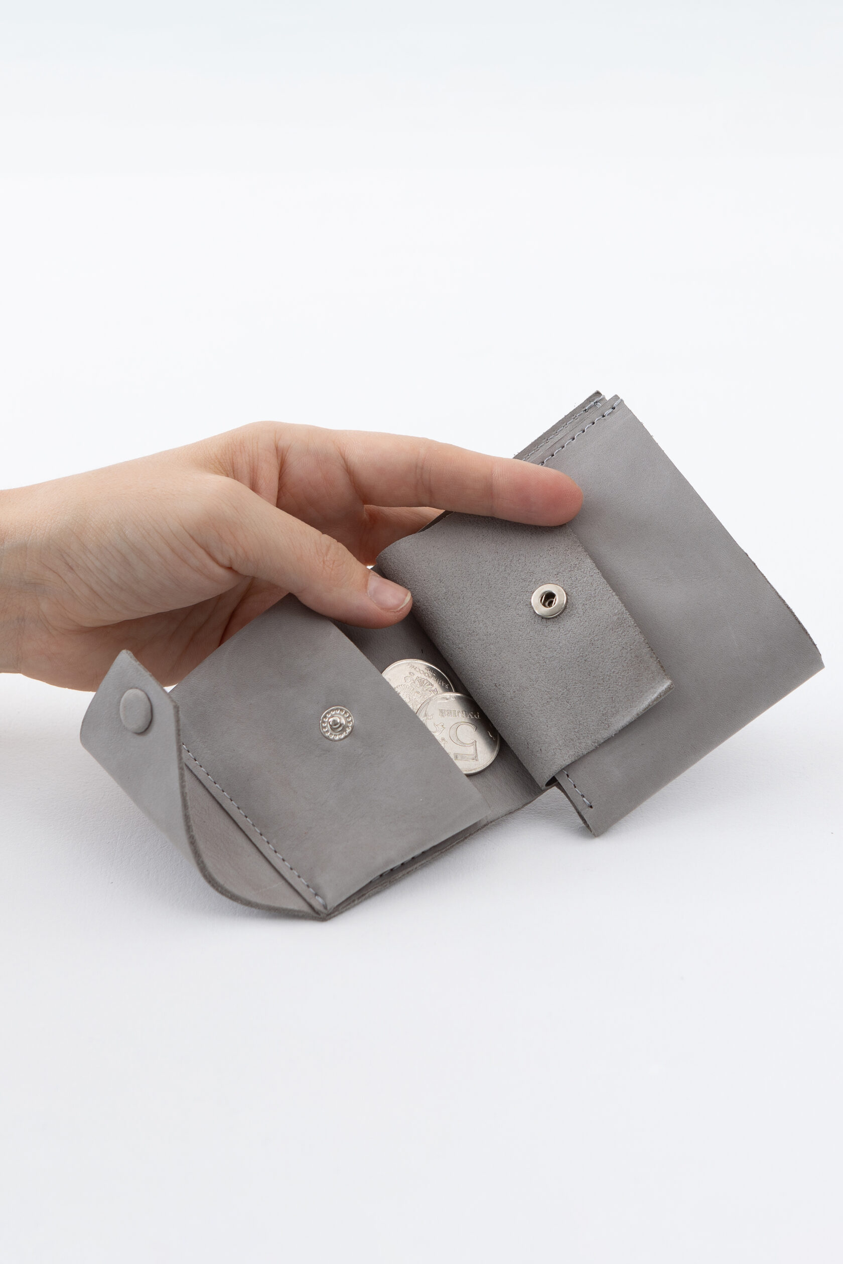 Кошелек не раскрывается весь сразу, а как будто раскручивается постепенно: первым под руку выплывает карман для мелочи, затем карманы с картами, и в самом конце, если нужно, открывается отсек с купюрами.