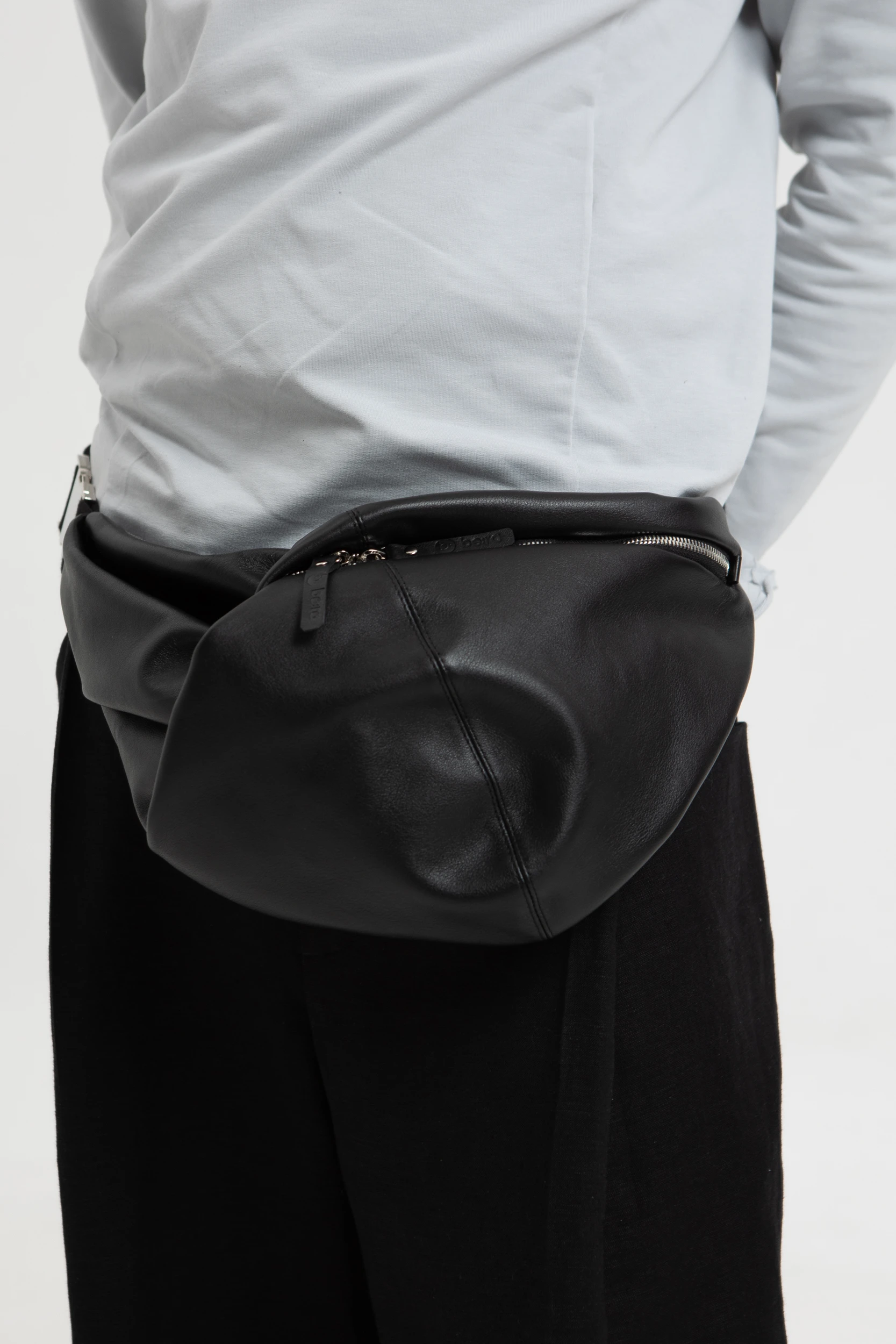 Самая завернутая из всех завернутых поясных сумок. С ходу и не скажешь, что она имеет определённую форму. Но если её перевернуть, то становится понятно, что в её основе — традиционная для поясных сумок трапециевидная форма.