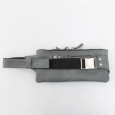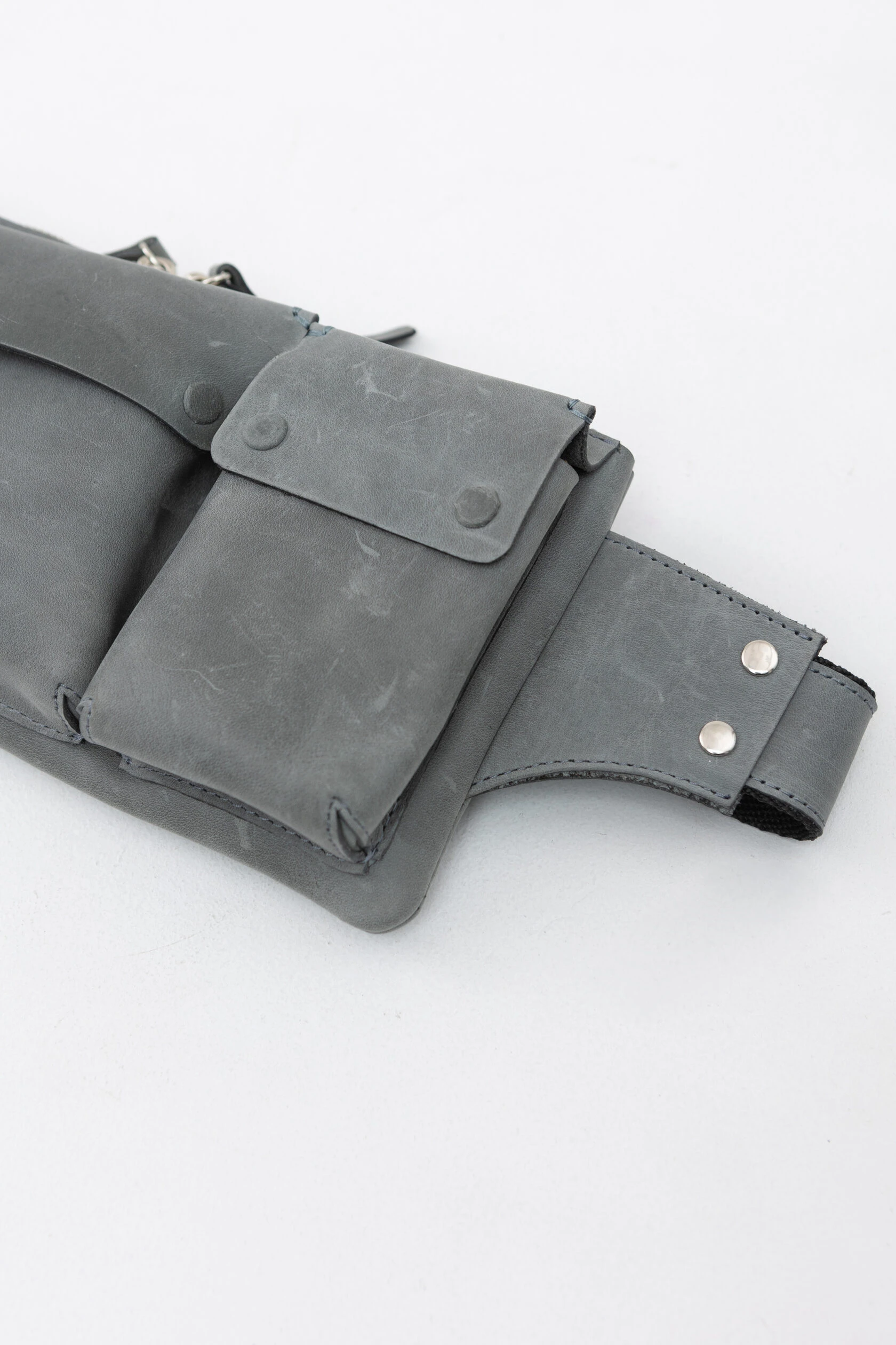 Серая кожа с винтажным эффектом (толщина 1,2–1,4 мм, плотная, с контрастными и графичными заломами. Со временем цвет, скорее всего, станет темнее, а заломы — менее контрастными)