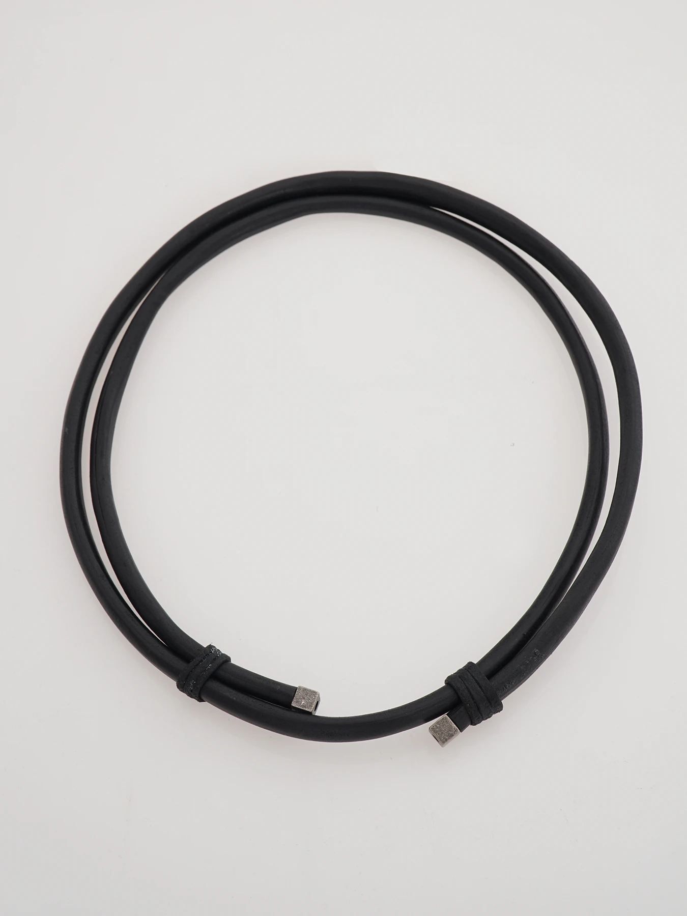 Кожаный черный шнур — лаконичный шейный аксессуар для подвесов: гладкий кожаный шнур лежит спокойно, а металлические наконечники добавляют чуть-чуть графики и «собранности» образу.