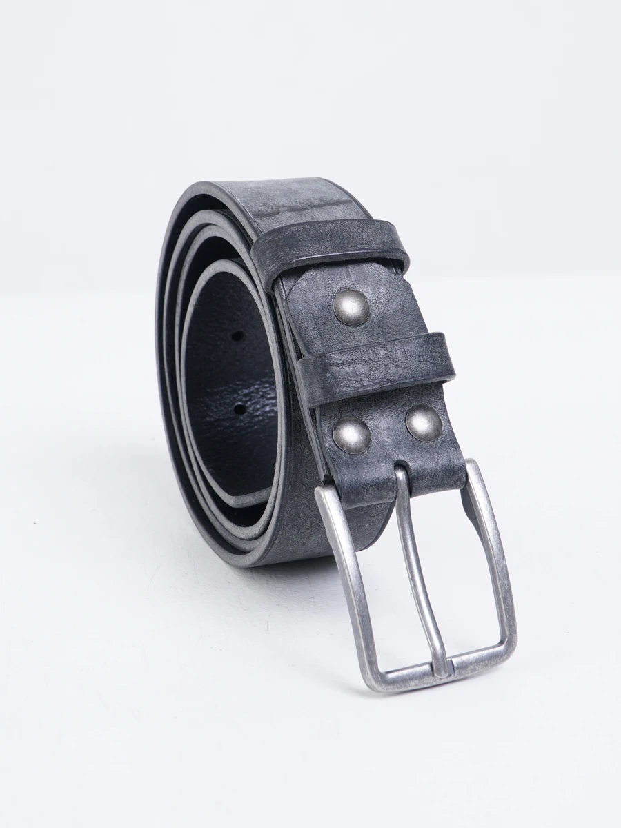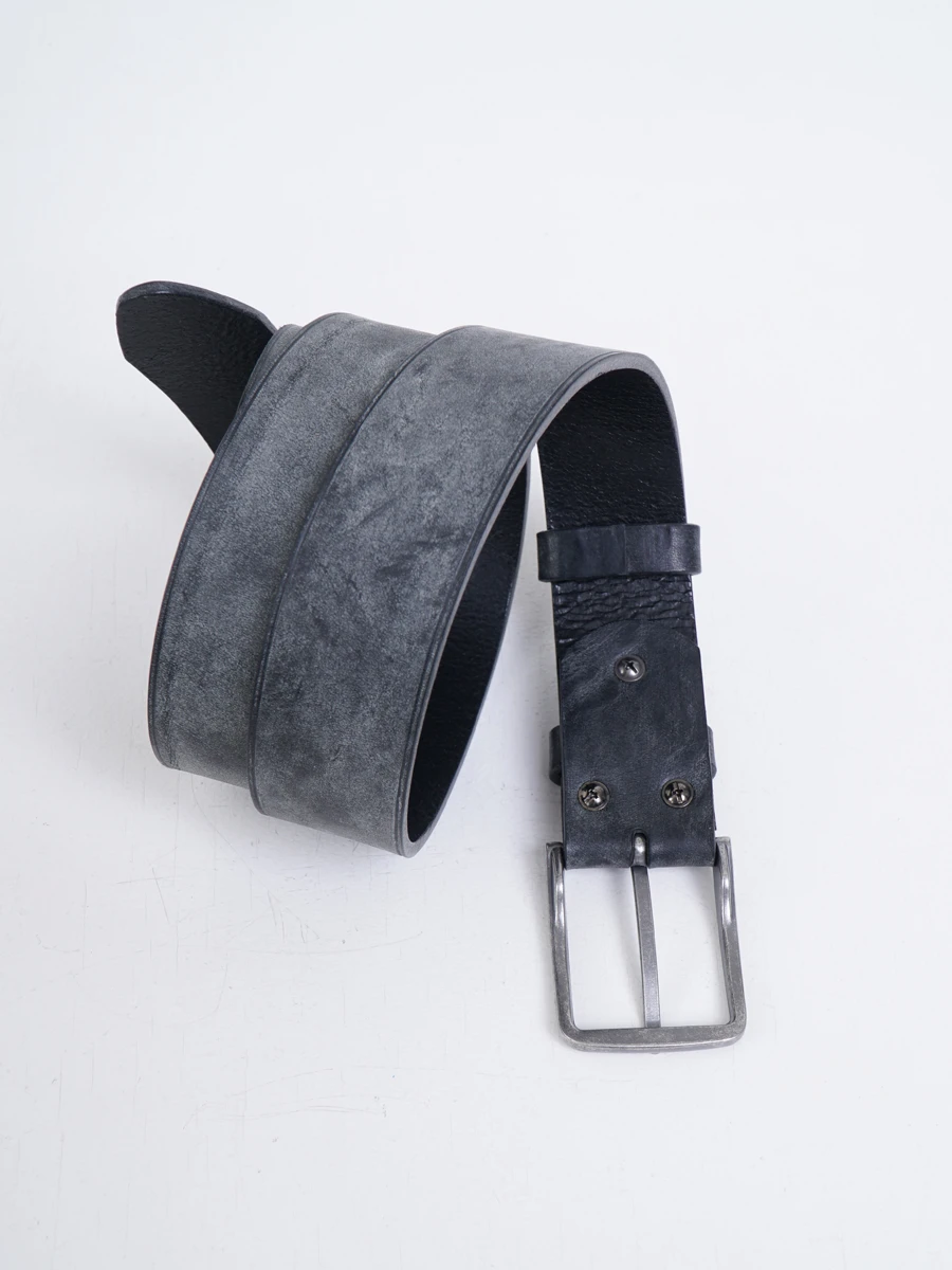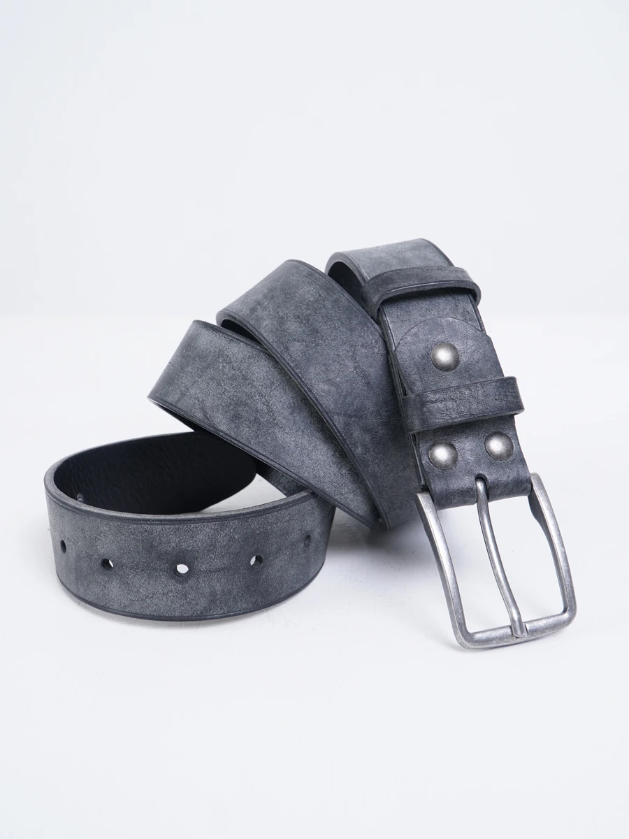 Серый кожаный ремень с винтажным эффектом — из натуральной кожи с отделкой белым воском: за счёт него поверхность выглядит чуть припудренной и матовой, без лишнего блеска. Матовая фурнитура поддерживает это настроение и делает ремень спокойным акцентом в образе.