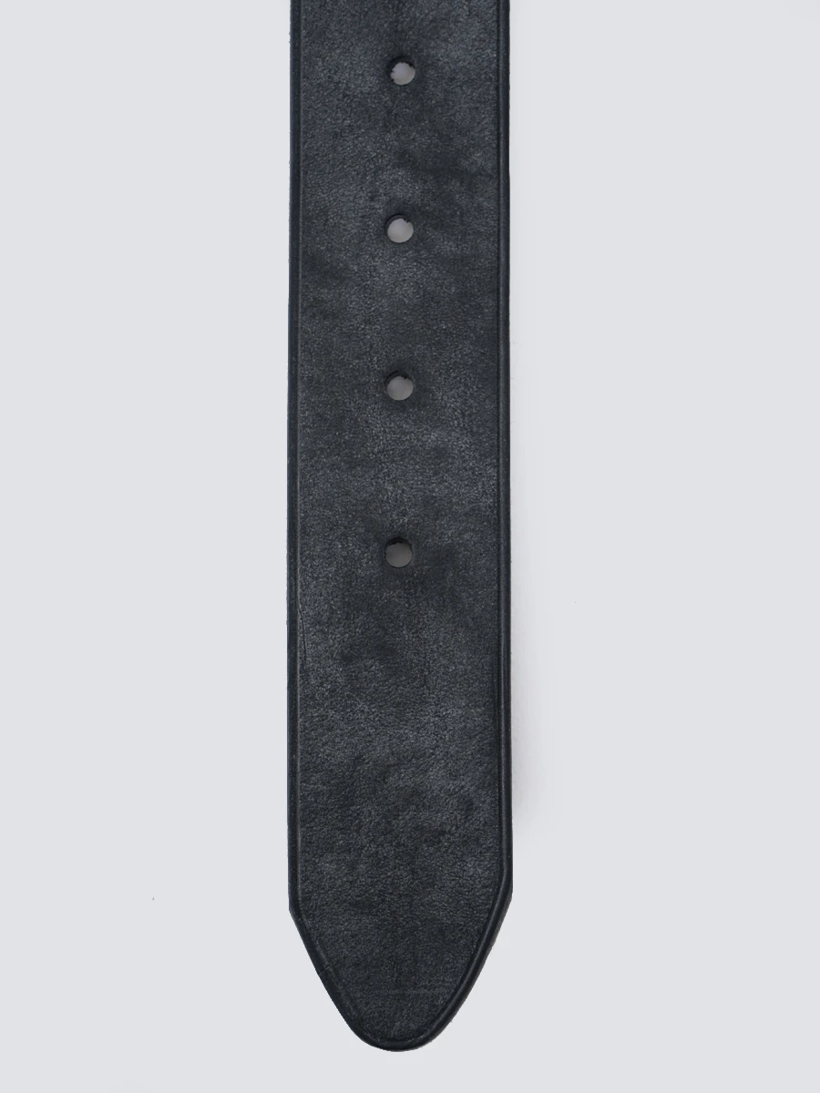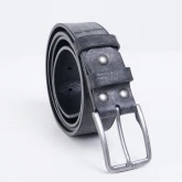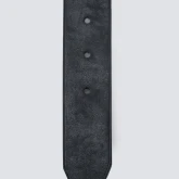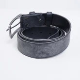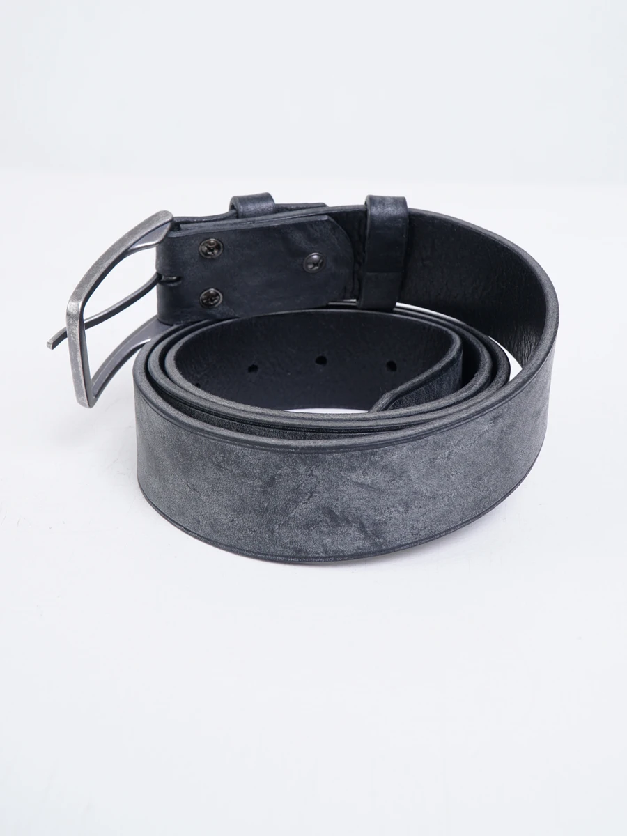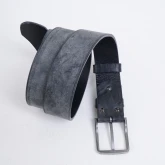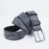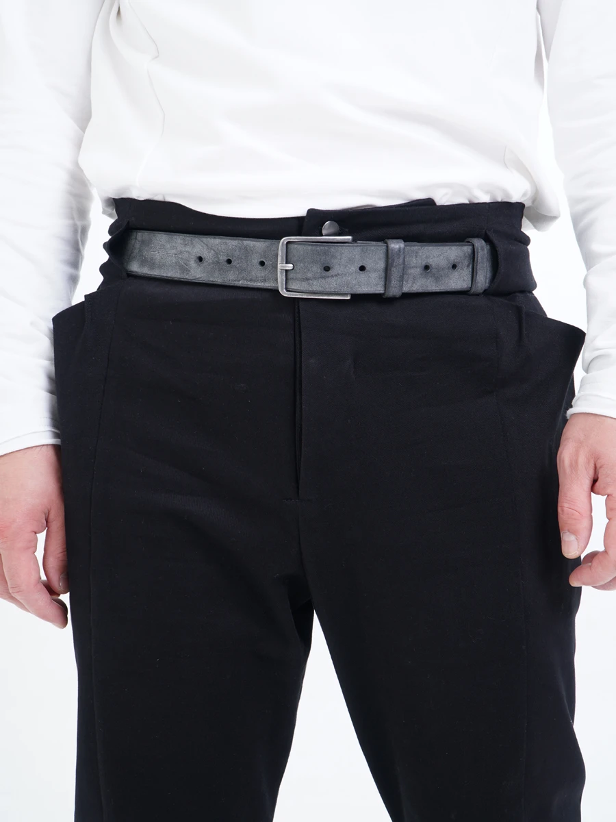 Серый кожаный ремень с винтажным эффектом — из натуральной кожи с отделкой белым воском: за счёт него поверхность выглядит чуть припудренной и матовой, без лишнего блеска. Матовая фурнитура поддерживает это настроение и делает ремень спокойным акцентом в образе.