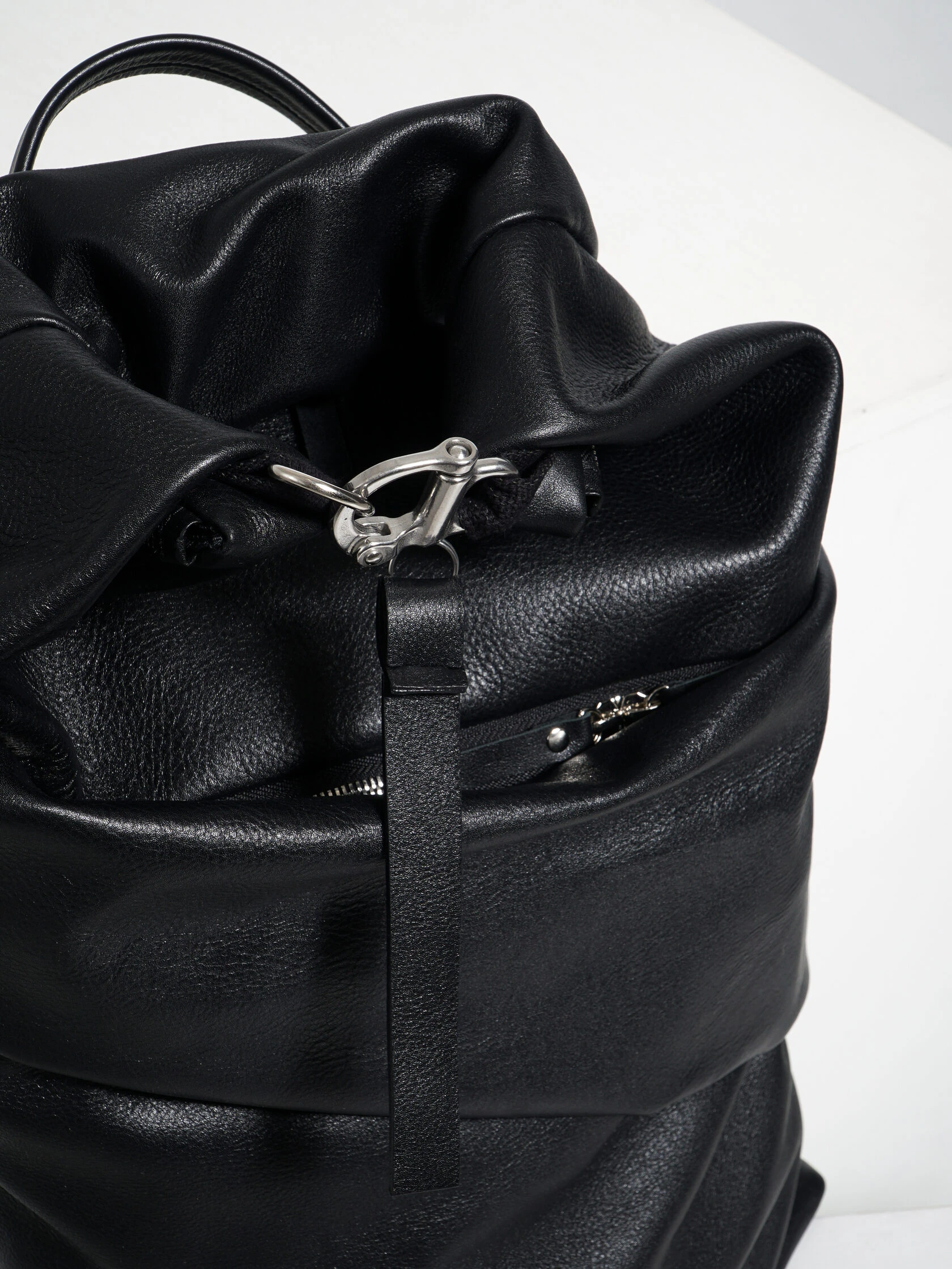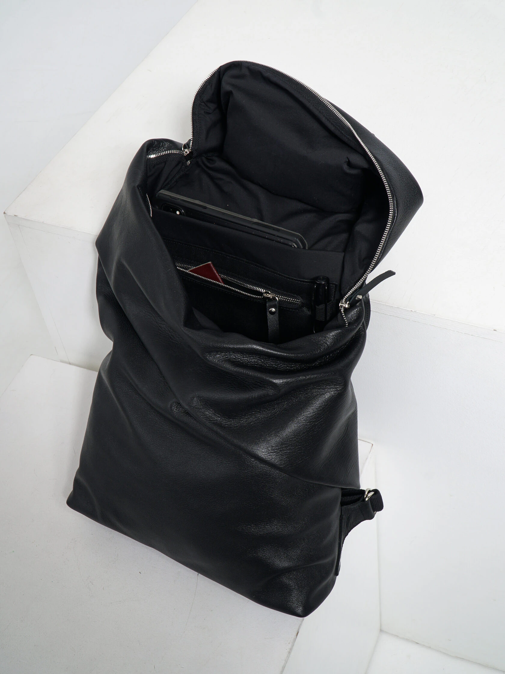 Роллтоп «по-классике» состоит из одного большого отделения. В него мы добавили карман для ноутбука до 17 дюймов и карман на молнии с петлёй для ручки или карабина. Ещё один дополнительный карман мы спрятали под складкой снаружи рюкзака.