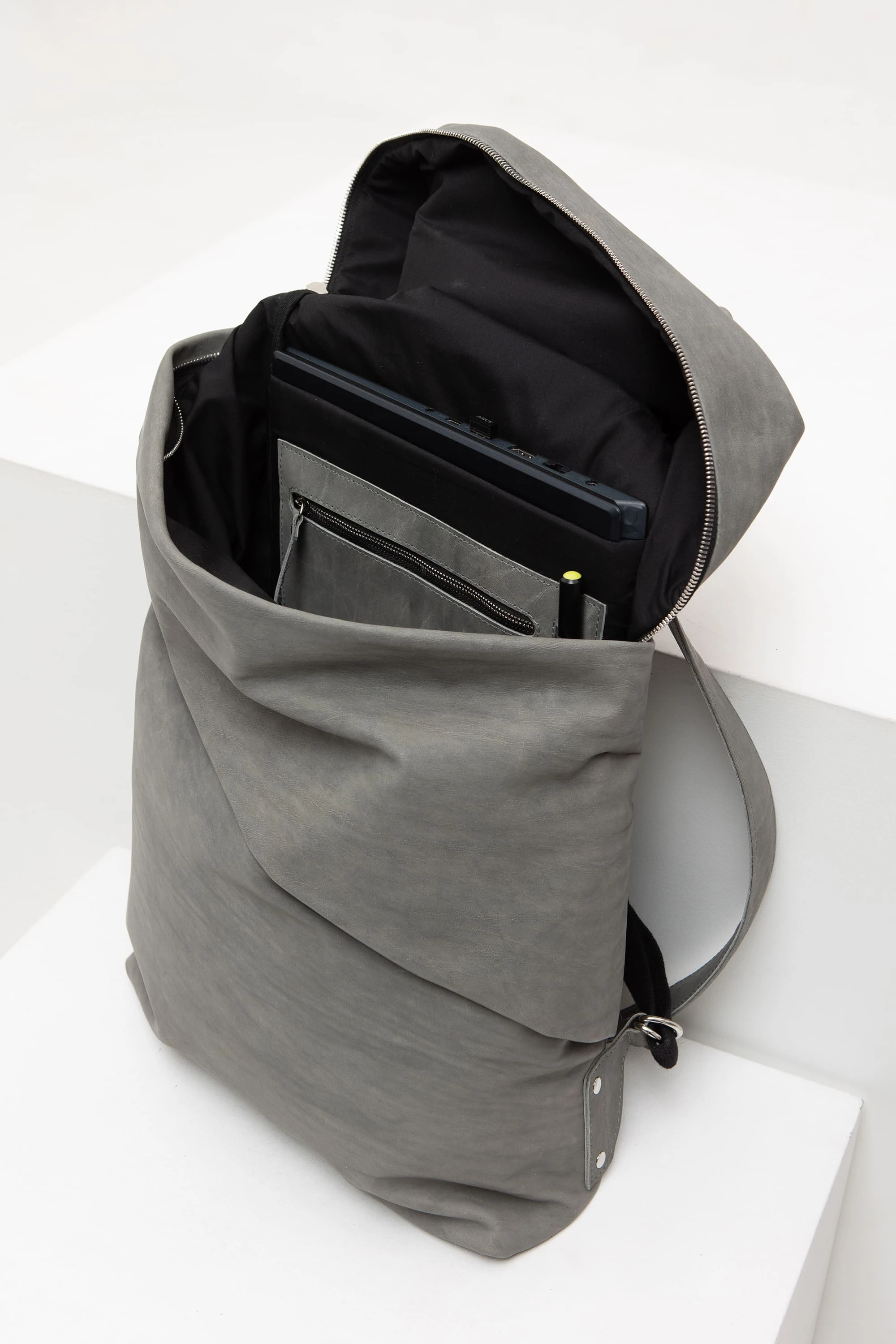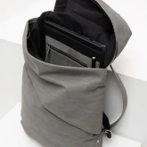 Роллтоп «по-классике» состоит из одного большого отделения. В него мы добавили карман для ноутбука до 17 дюймов и карман на молнии с петлёй для ручки или карабина. Ещё один дополнительный карман мы спрятали под складкой снаружи рюкзака.