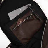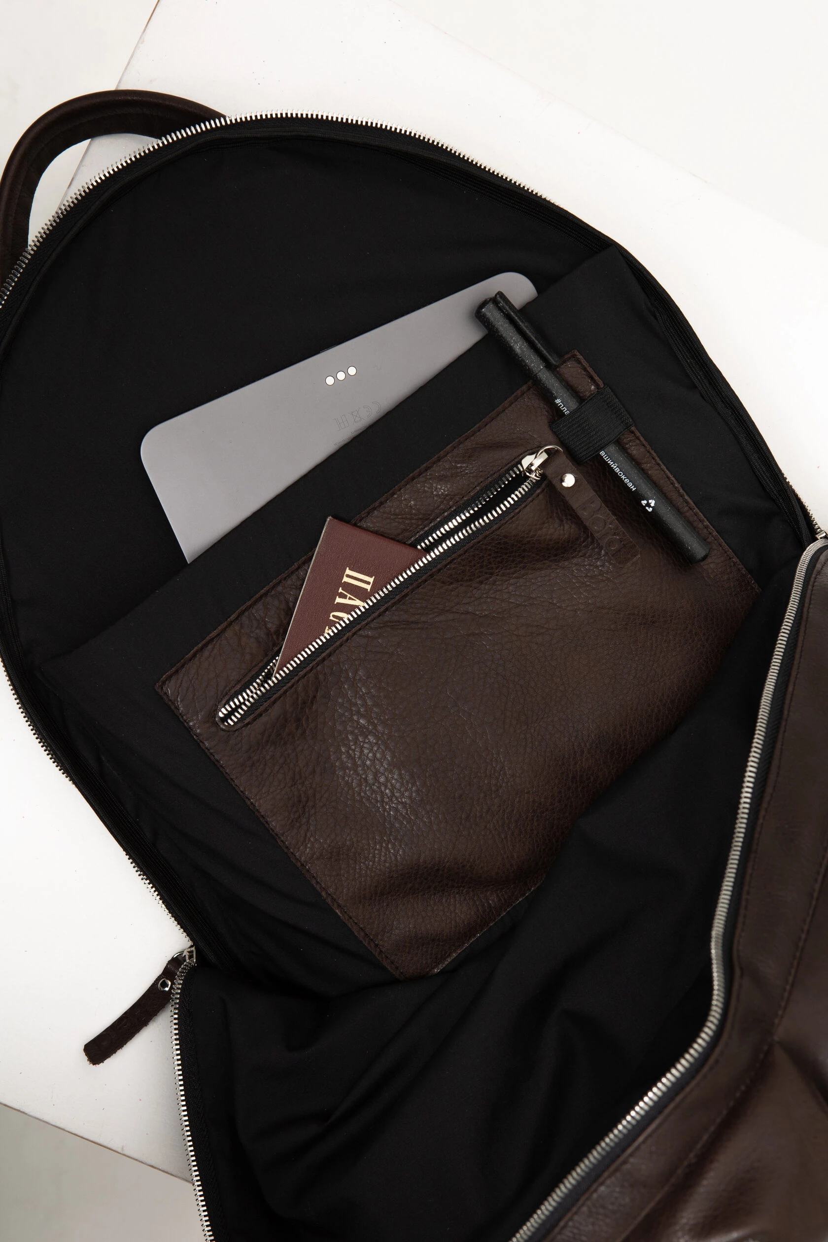 Мы уплотнили и усилили спинку и дно рюкзака. Внутри добавили карман для ноутбука до 17 дюймов и карман для мелочей с резиновой петлёй для ручки.
