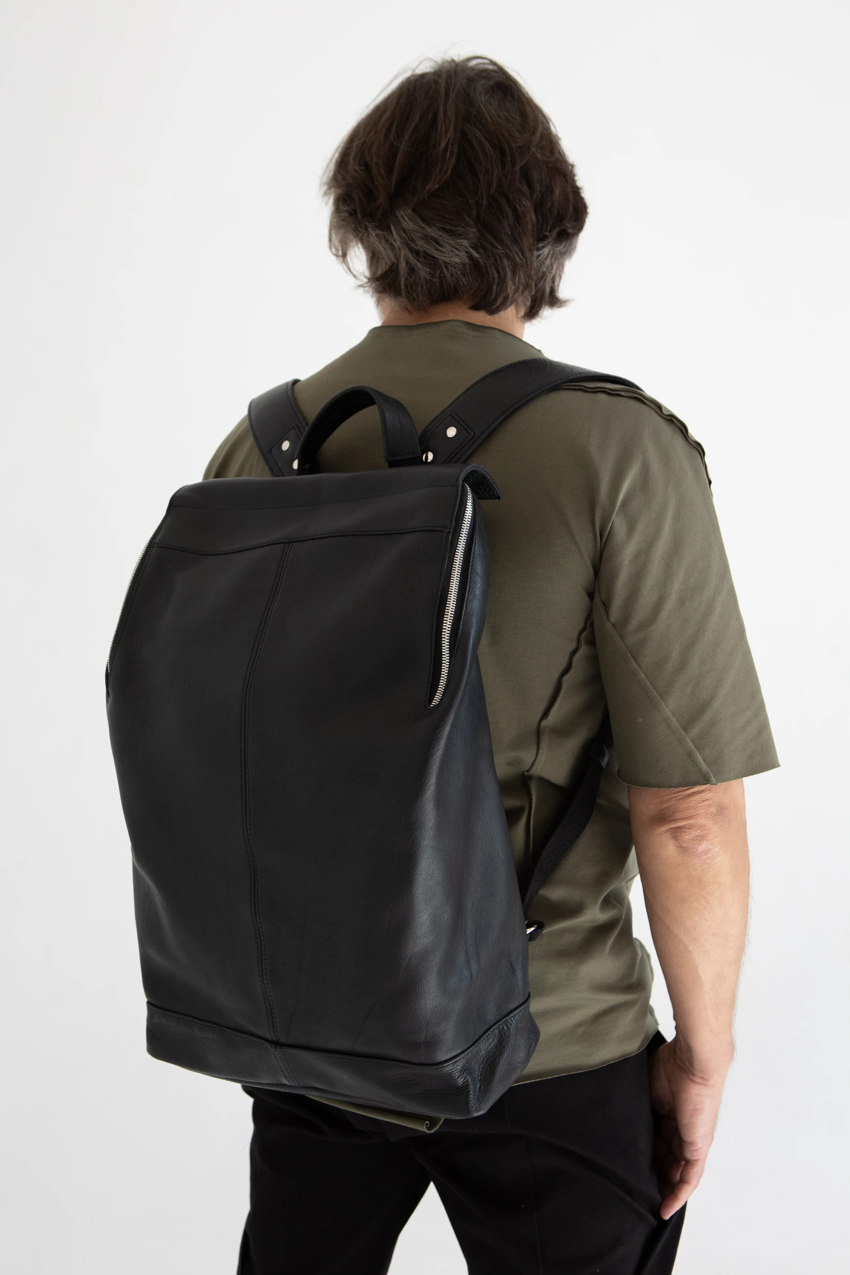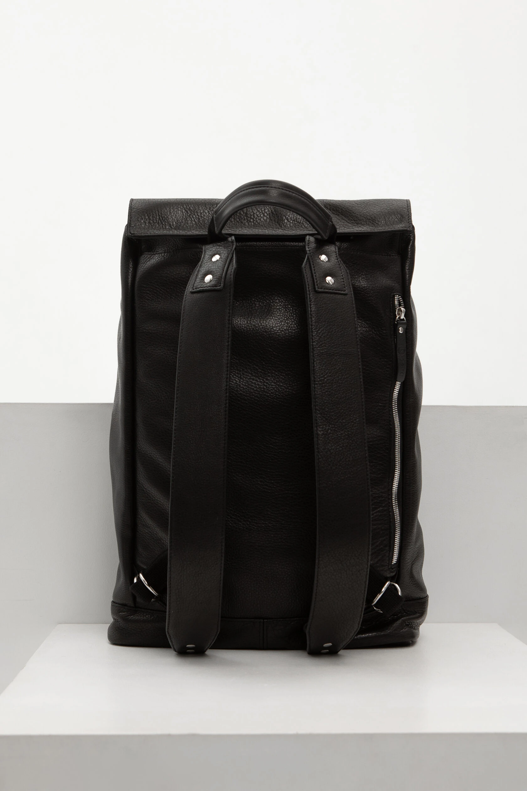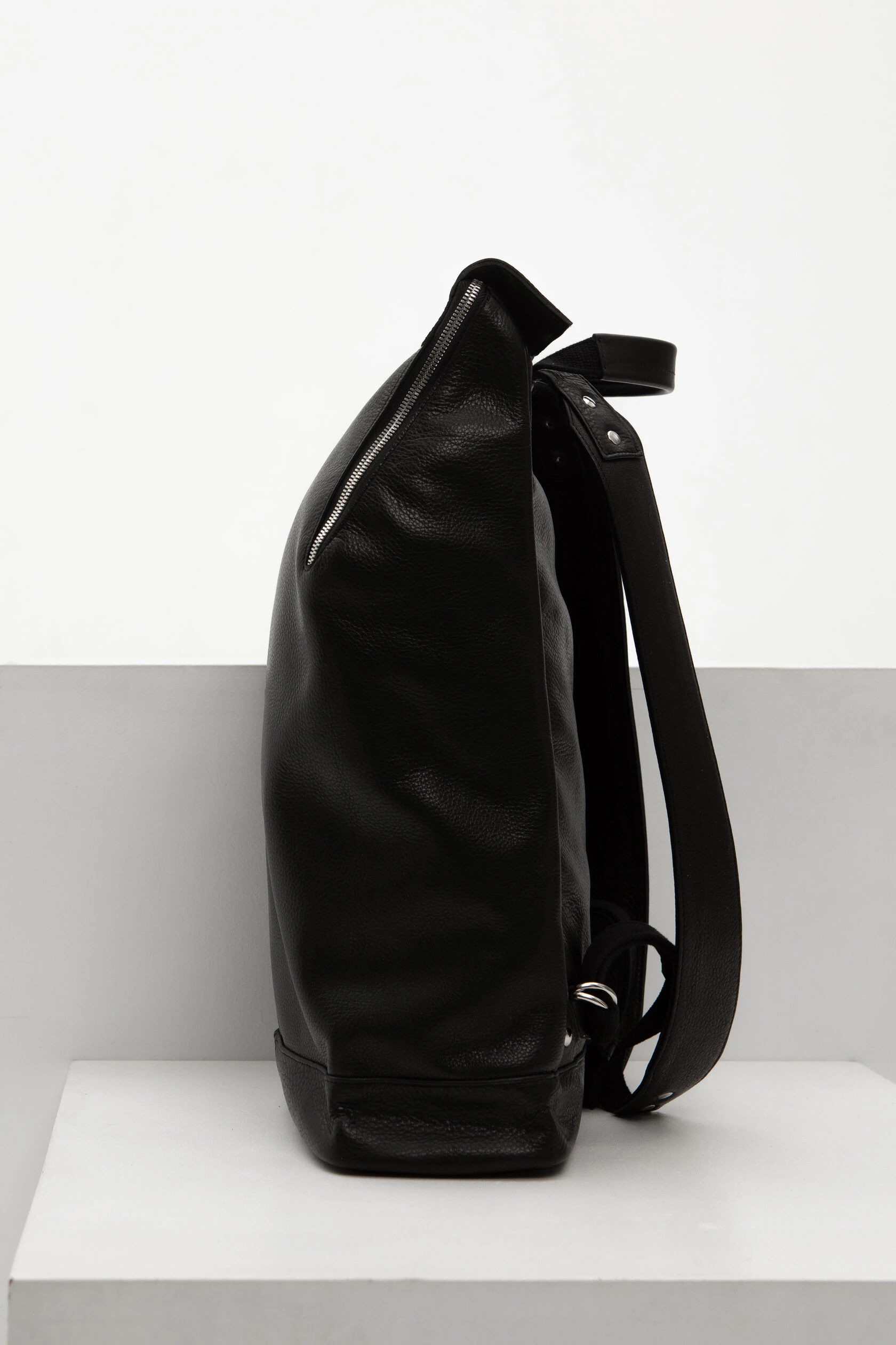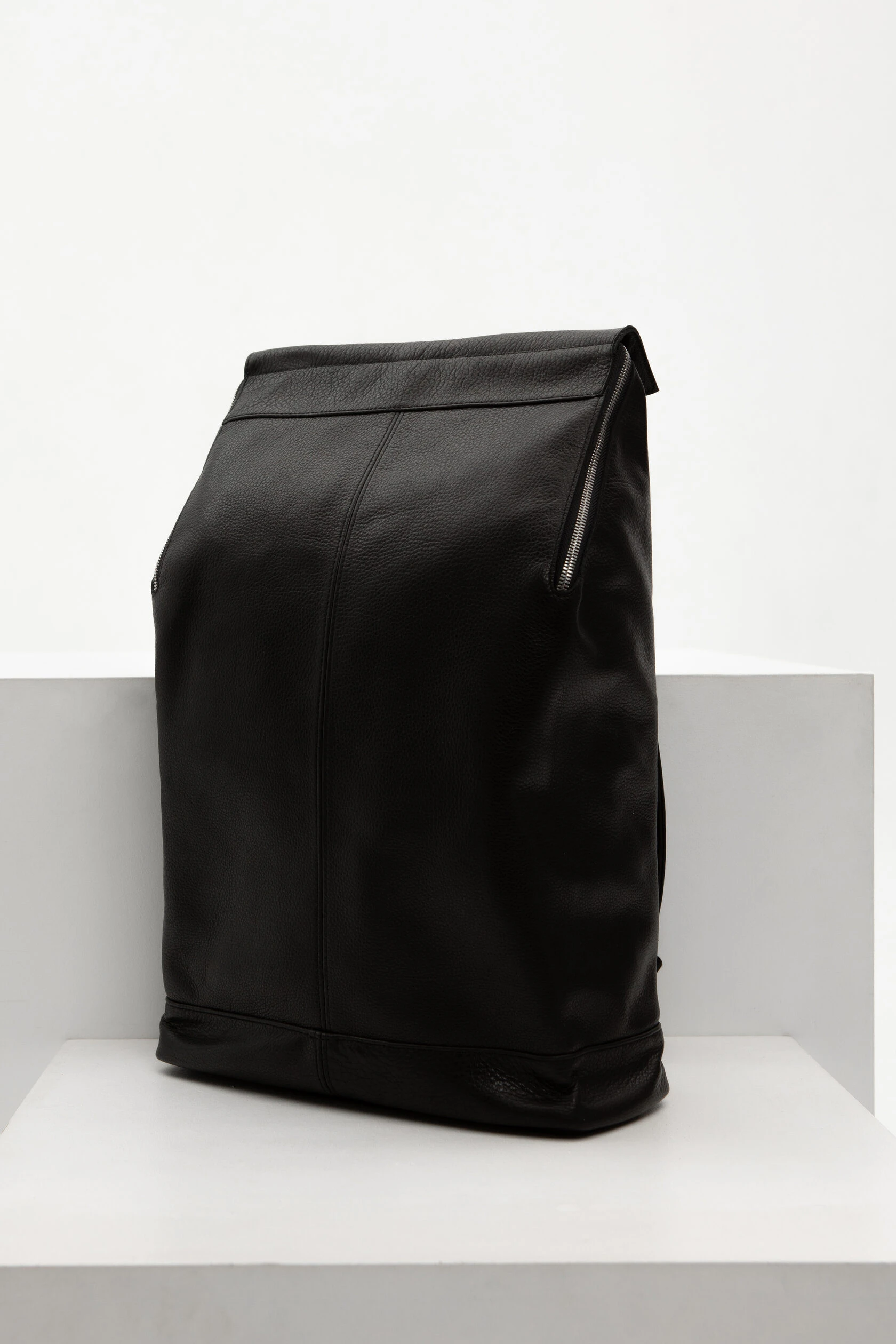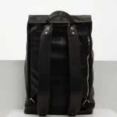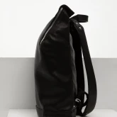 Прямоугольный рюкзак со скошенным верхом и двойной застежкой. Рюкзак плотный и хорошо держит форму, потому что сшит из плотной и достаточно жесткой кожи.