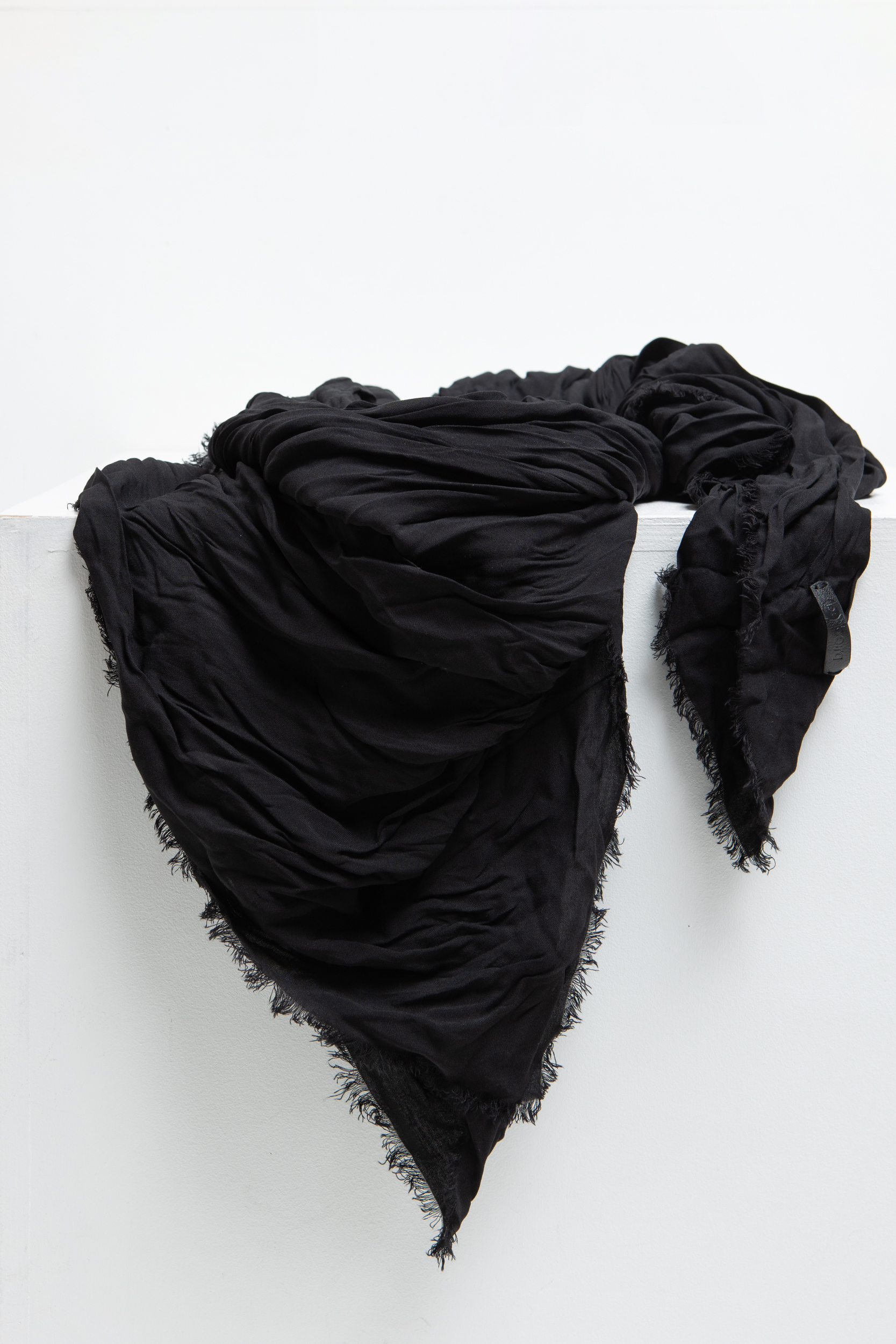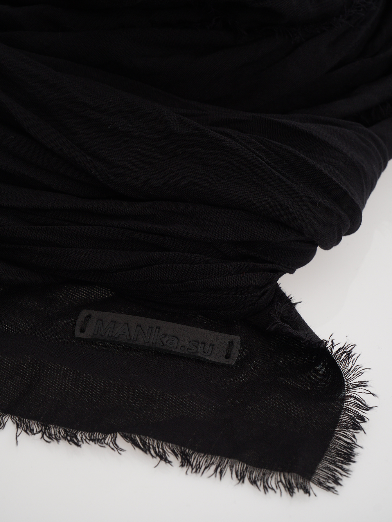 Мягкая вискоза собрана в мелкие складки и даёт эффект натуральной жатости. Край слегка «лохматый», поэтому платок выглядит задумано небрежным и живым, не требует идеальной укладки и смотрится хорошо даже в самом простом узле.