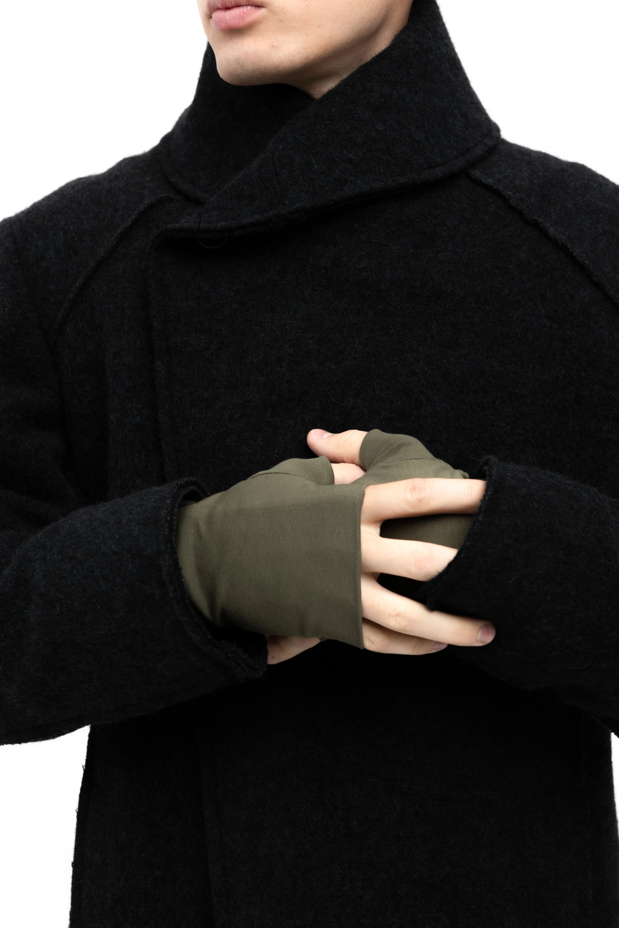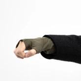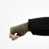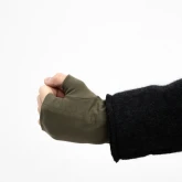Мягкий хлопковый трикотаж с добавлением лайкры плотно, но деликатно облегает кисть, не стягивает и не сползает. Длина митенок уходит под рукав пальто или куртки, закрывая «уязвимое» место между рукавом и перчатками. Зелёный цвет даёт спокойный акцент в образе и хорошо сочетается с тёмным верхом, джинсами, парками и пыльниками.