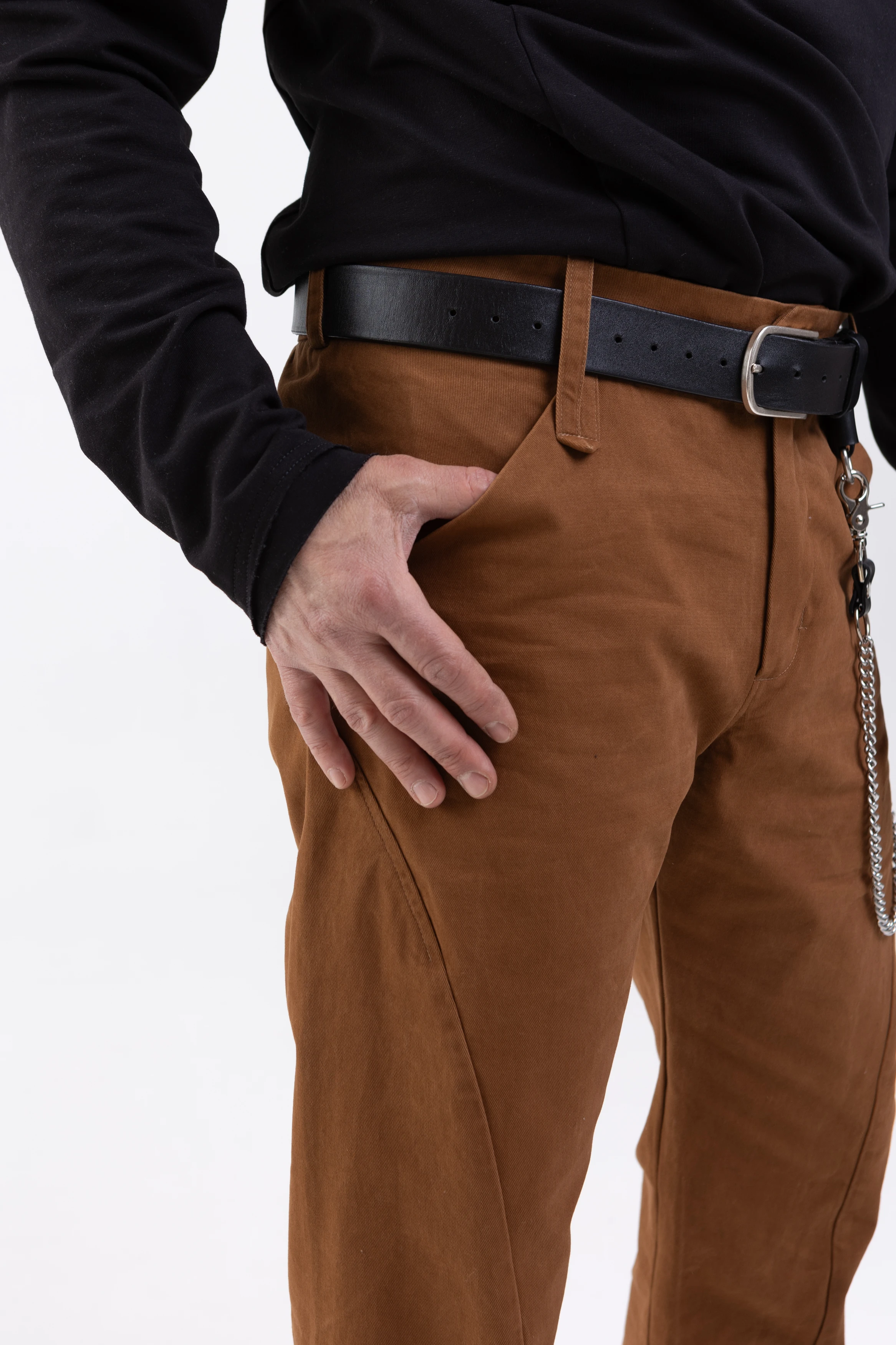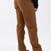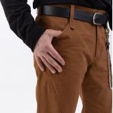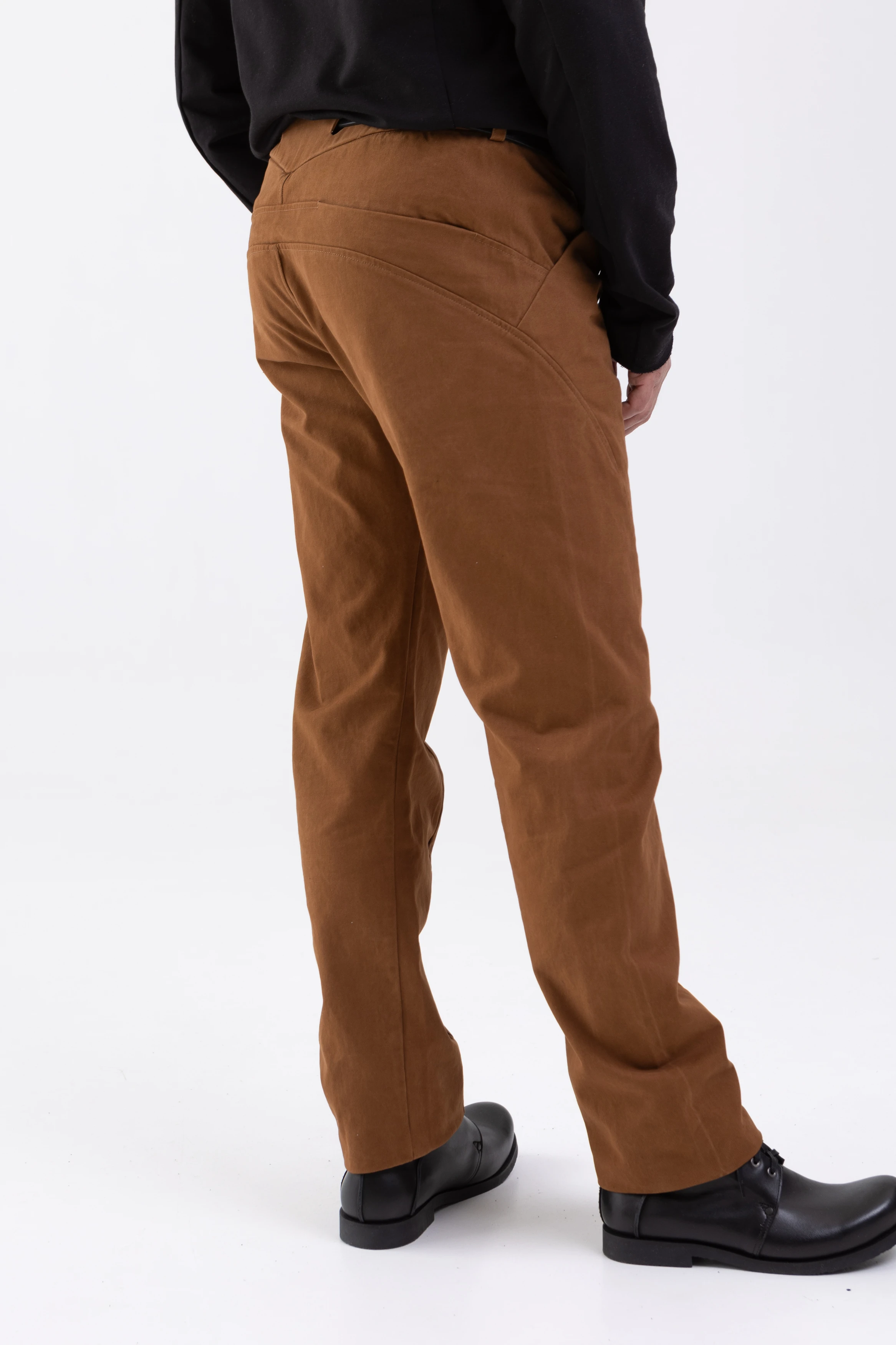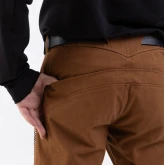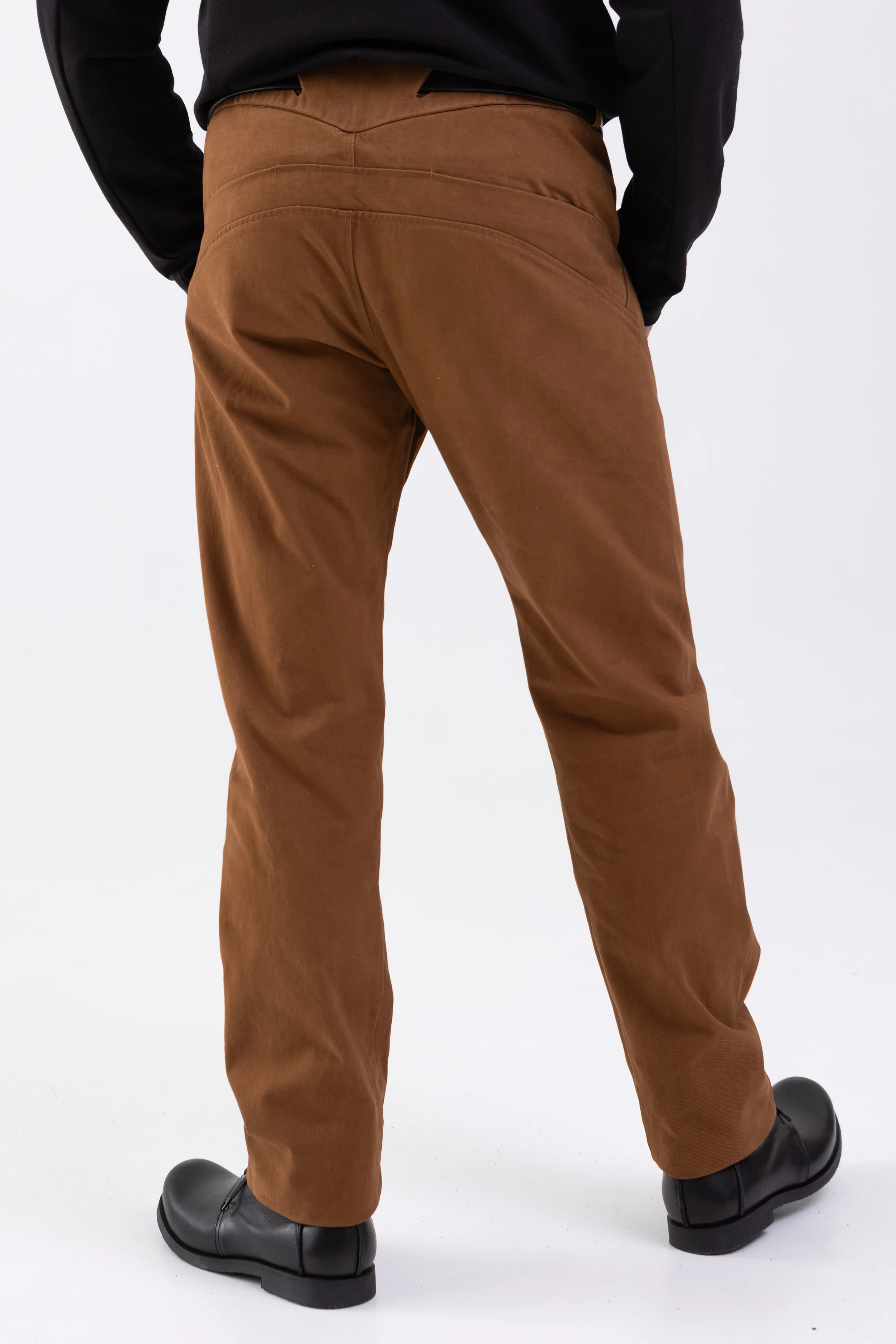 Сзади двойная кокетка для максимально анатомичного прилегания к телу. Боковые швы на штанинах смещены вперед, и по сути представляют один длинный шов, который начинается снизу на одной штанине, проходит вверх через большую ягодичную мышцу и спускается вниз по второй штанине.