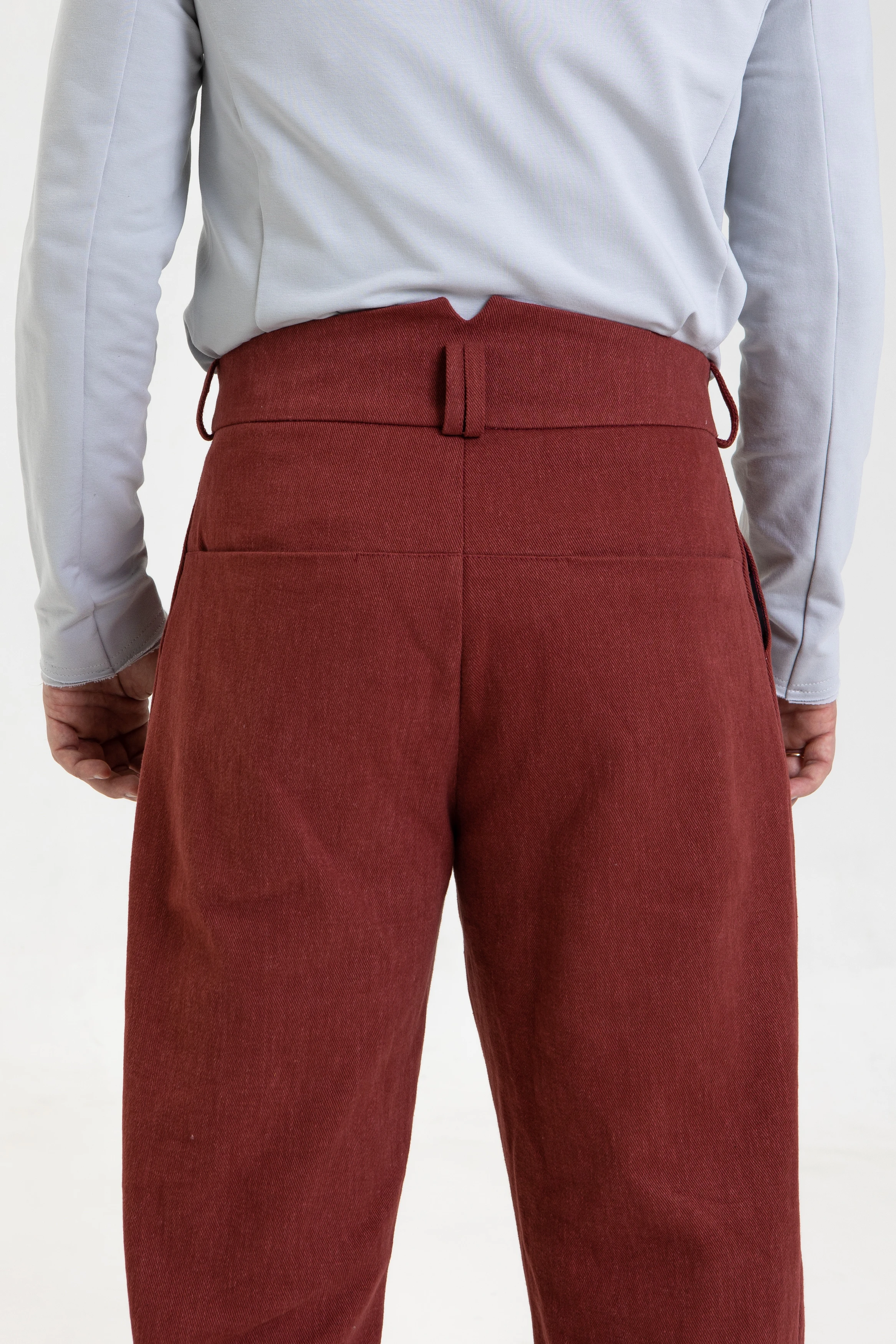 Мы снова используем вертикальные швы, которые сверху прячутся в складке, а дальше проходят через колено. Они создают форму штанины и не дают вытягиваться коленям.