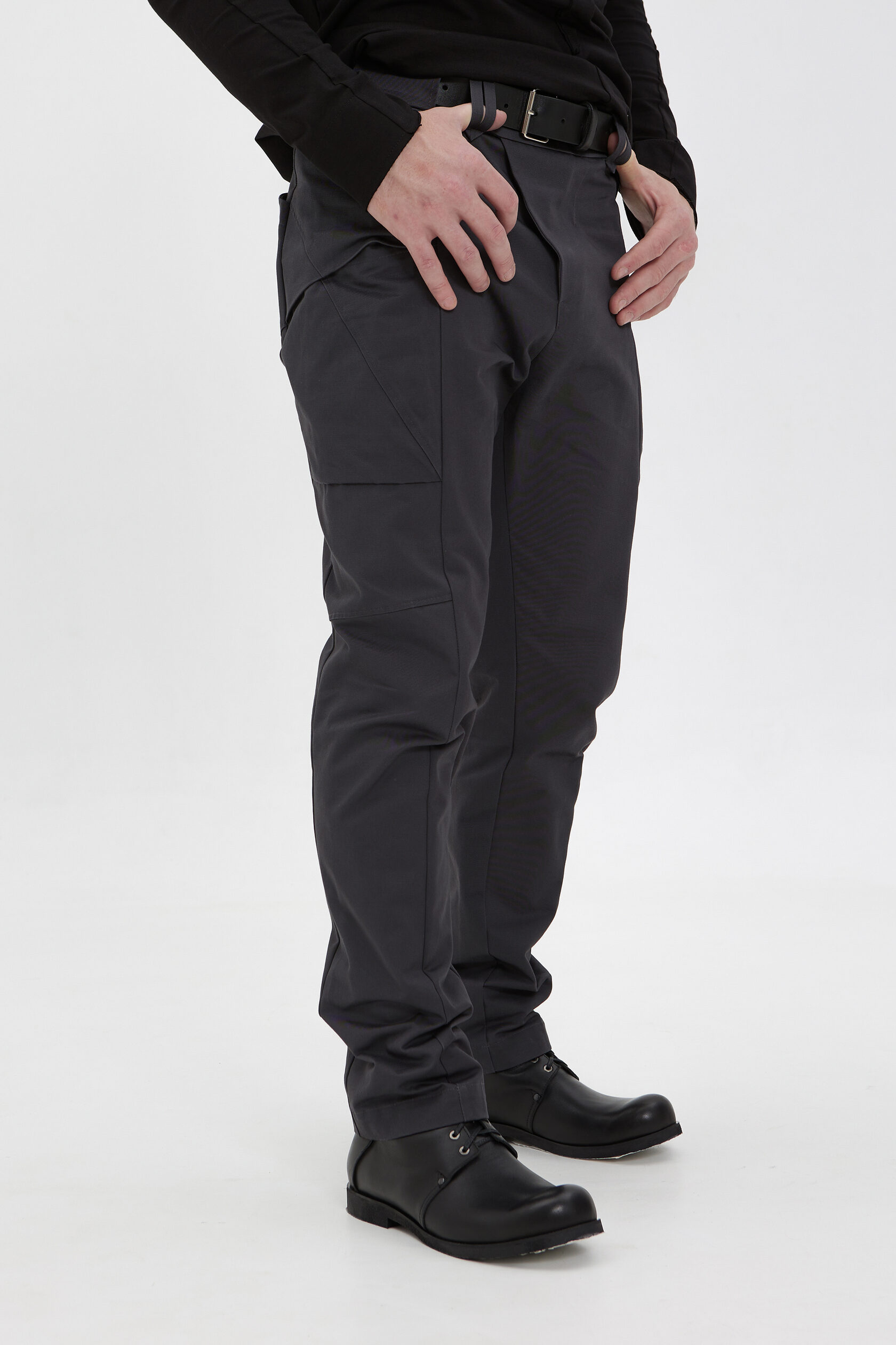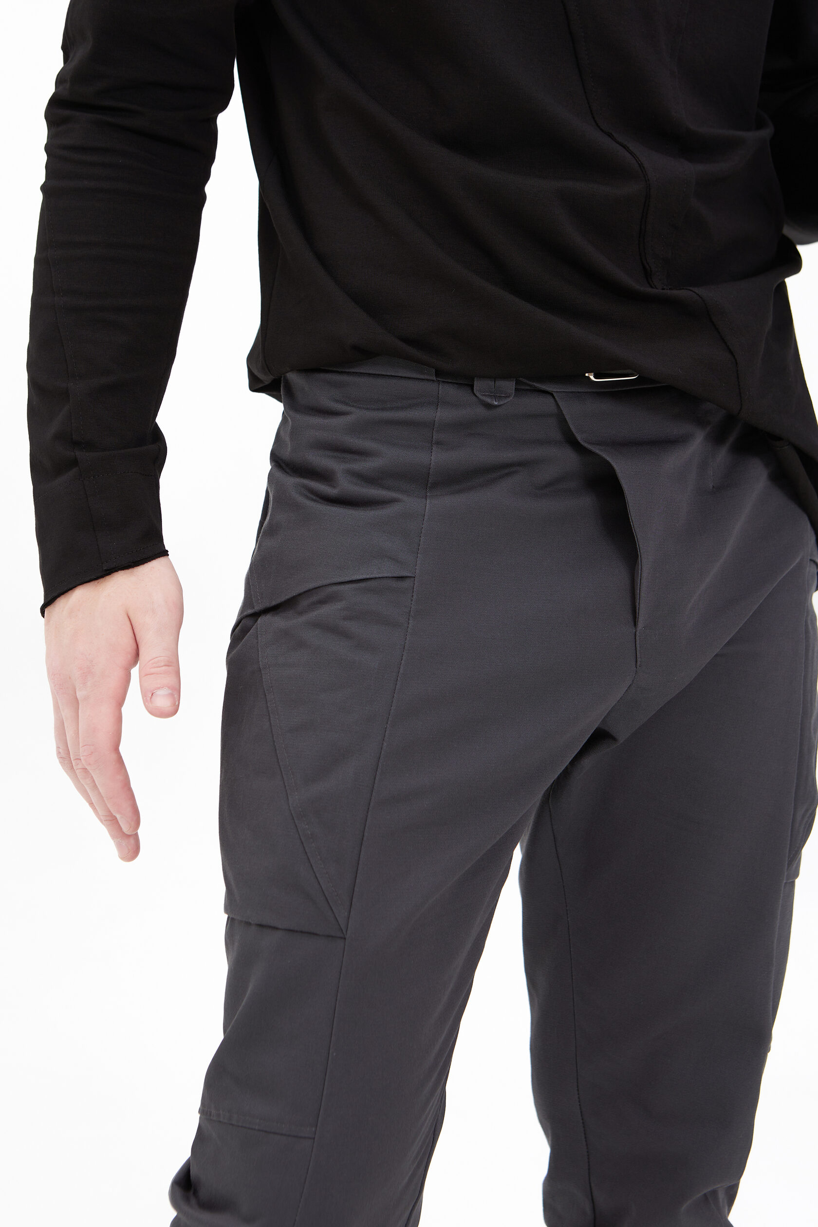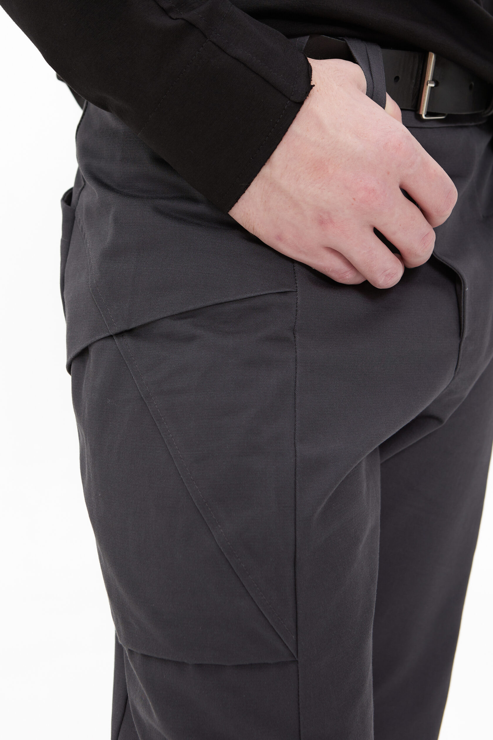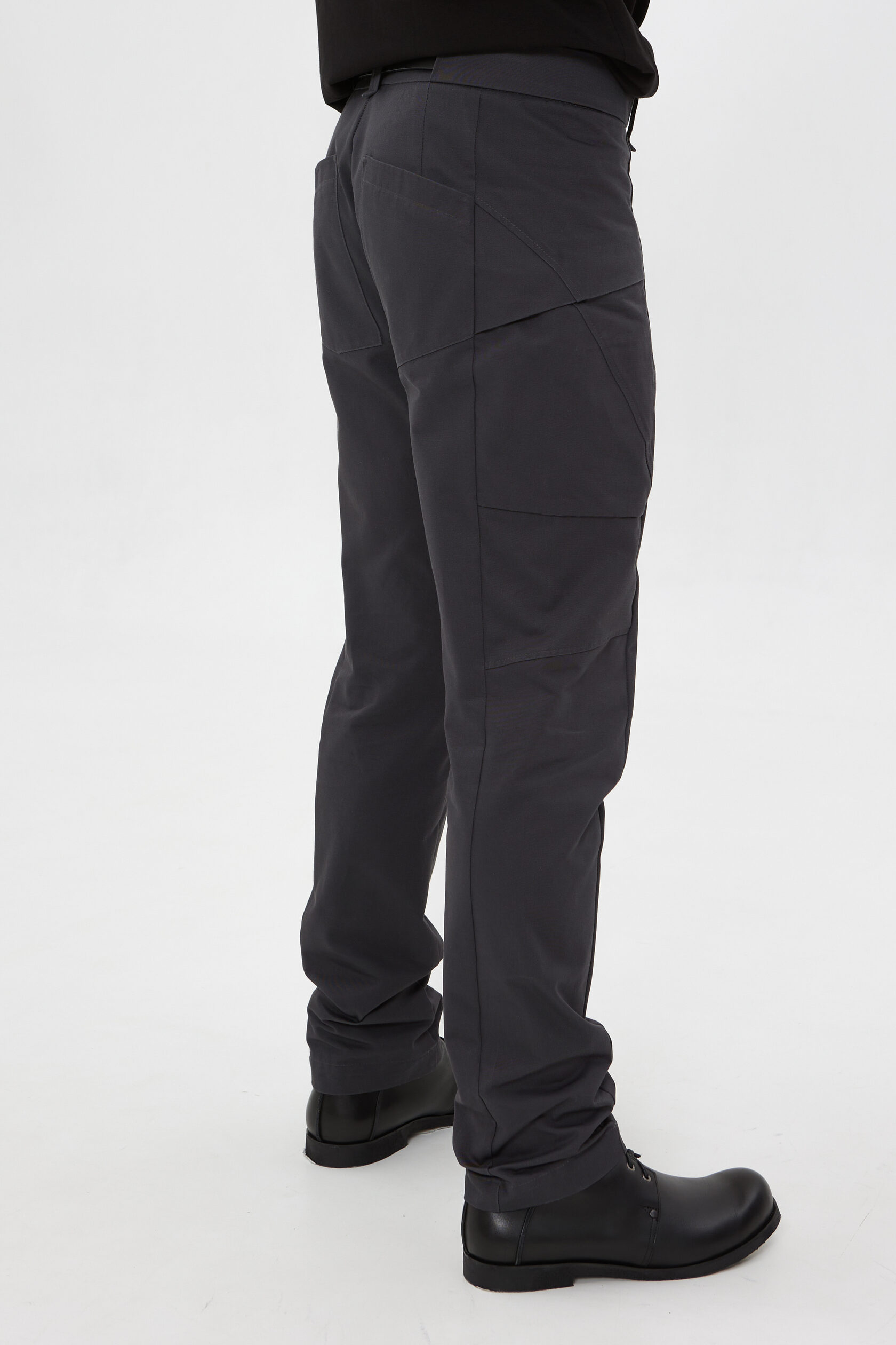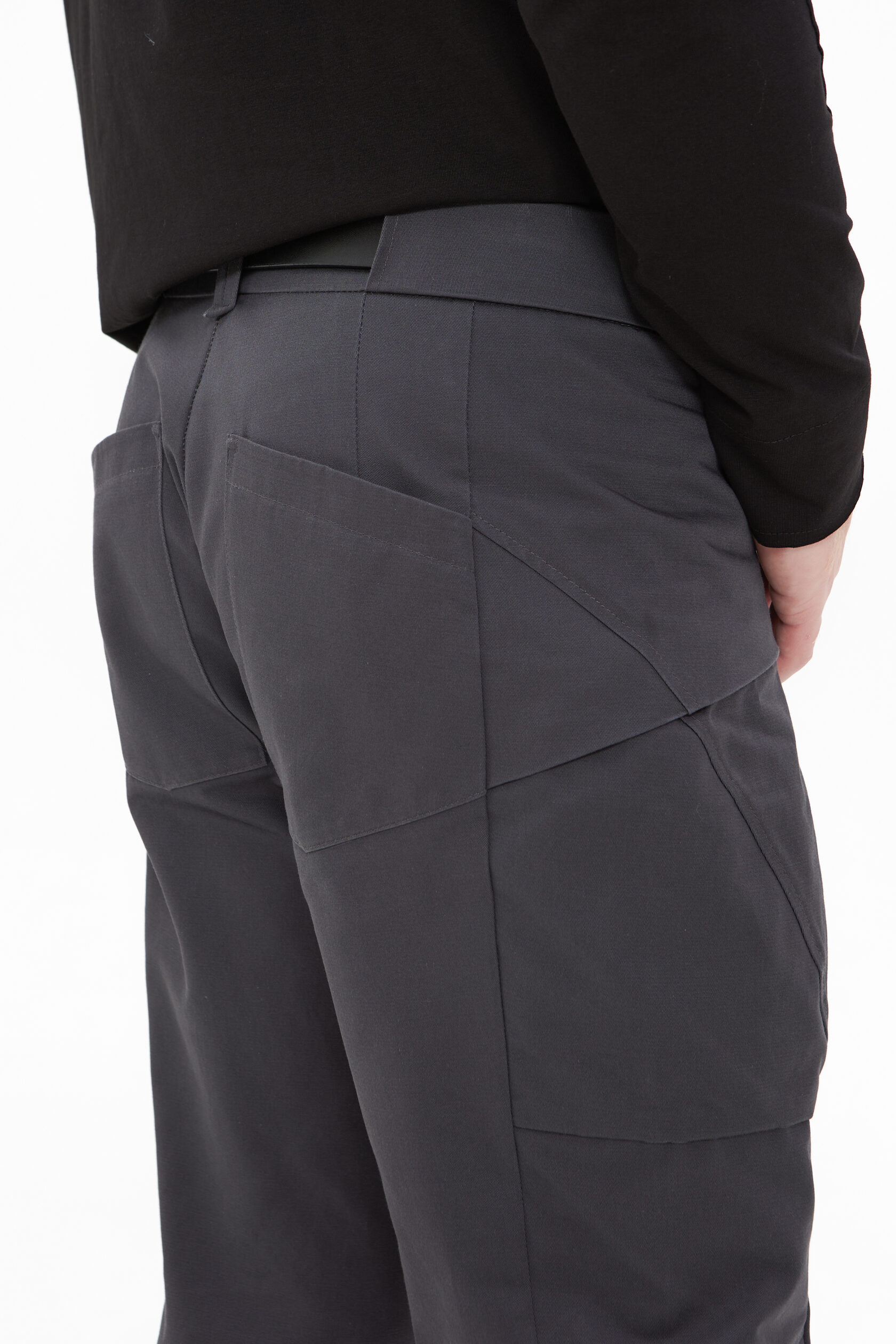 По передней части ноги идёт шов, который не даёт вытягиваться коленям. И в этот же шов мы заложили небольшой анатомический объём на коленный выступ. У штанов нет бокового шва — мы его заменили на "бочок" — целую боковую деталь, которая обеспечивает лучшую посадку по фигуре.