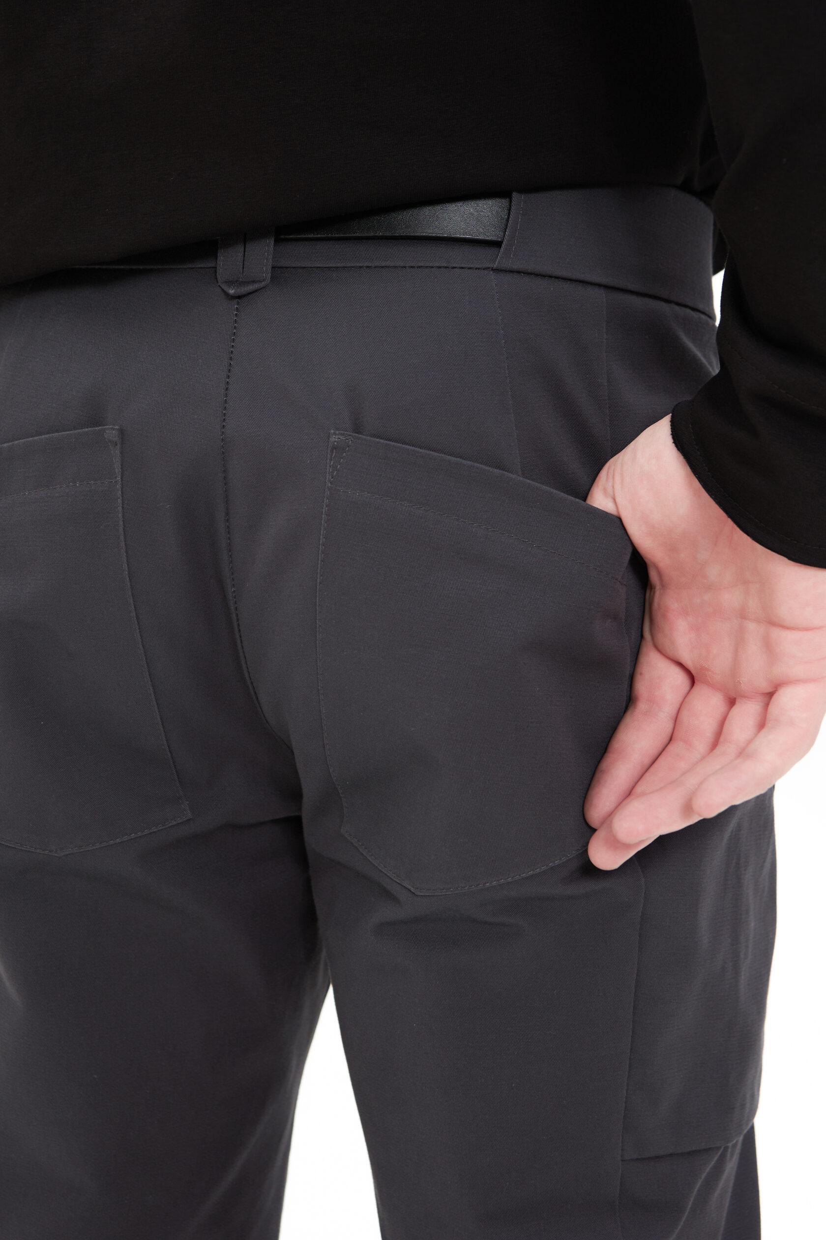 Привычных боковых карманов у этих штанов нет, а вот задние остались. Они хитро настрочные и чуть меньше привычных брючных карманов, но функциональные.