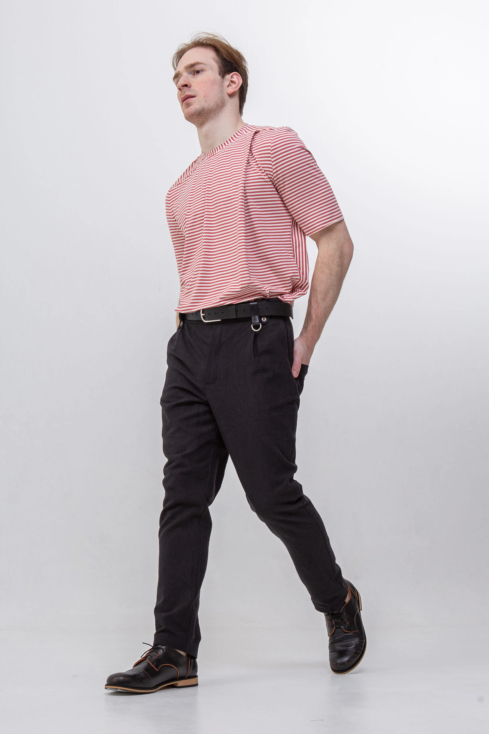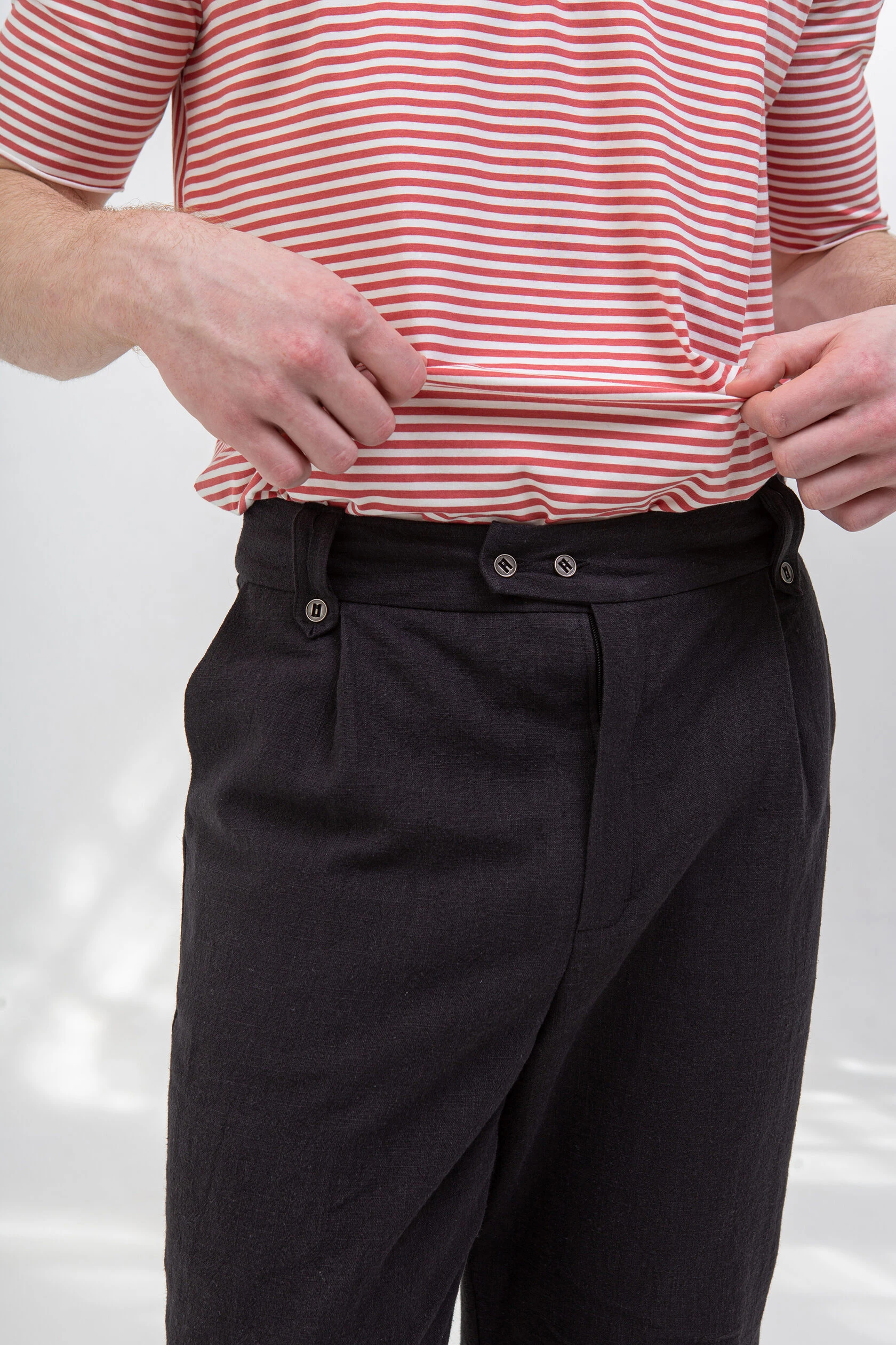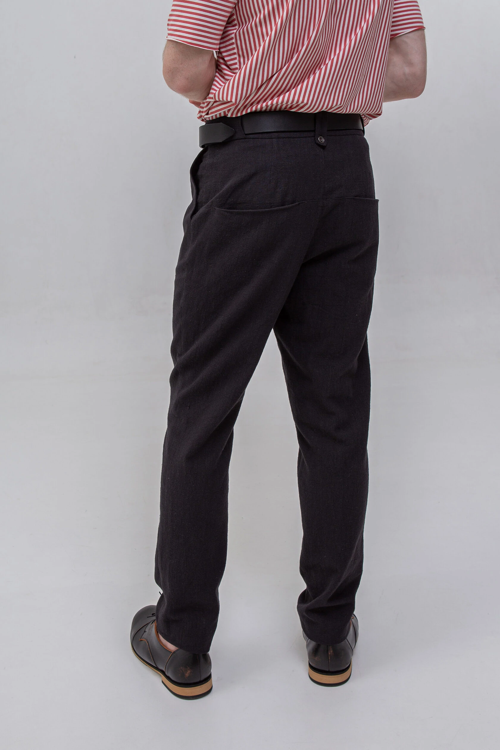 Пояс с нашими фирменными тоннелями для ремня. Привычные шлёвки расположены только сзади по центру, и две шлёвки — на входе в тоннели. Тоннели лучше держат ремень, не деформируют его и не дают штанам вылезать из-под ремня.