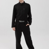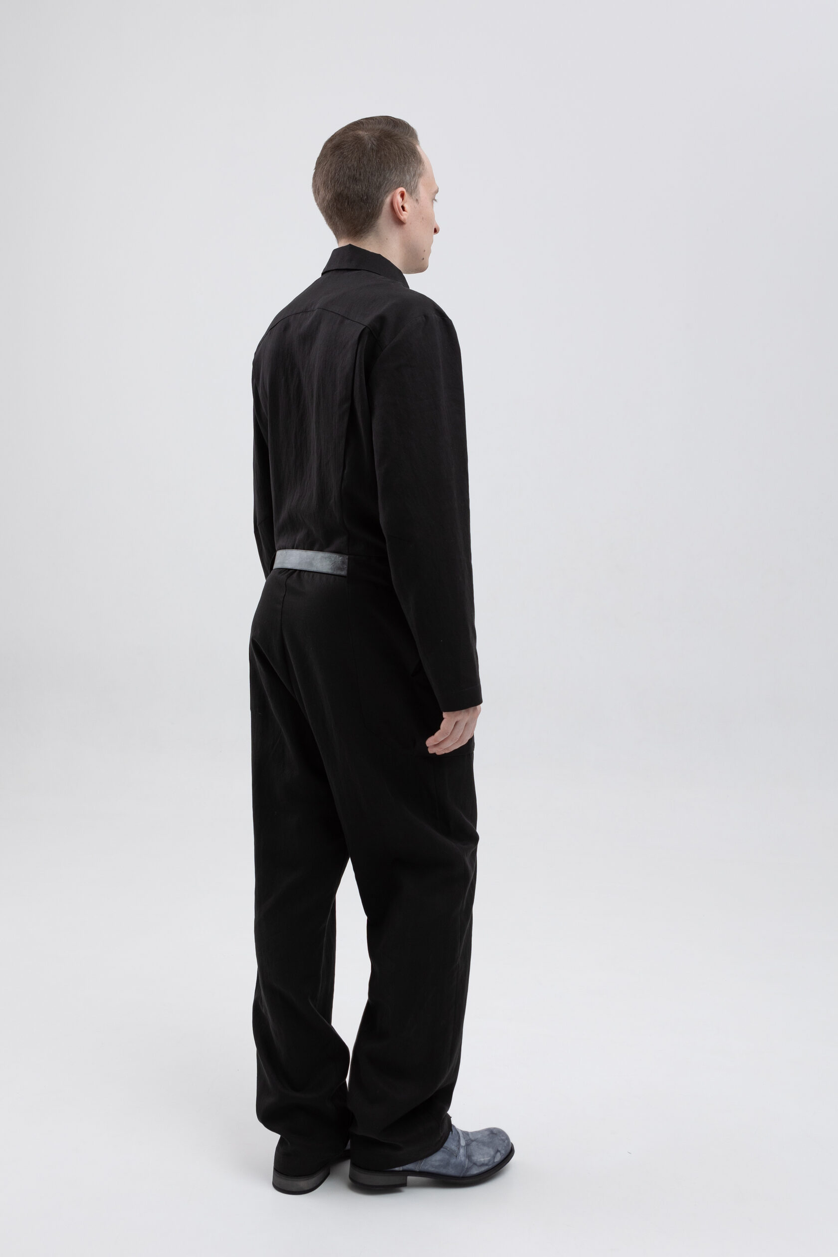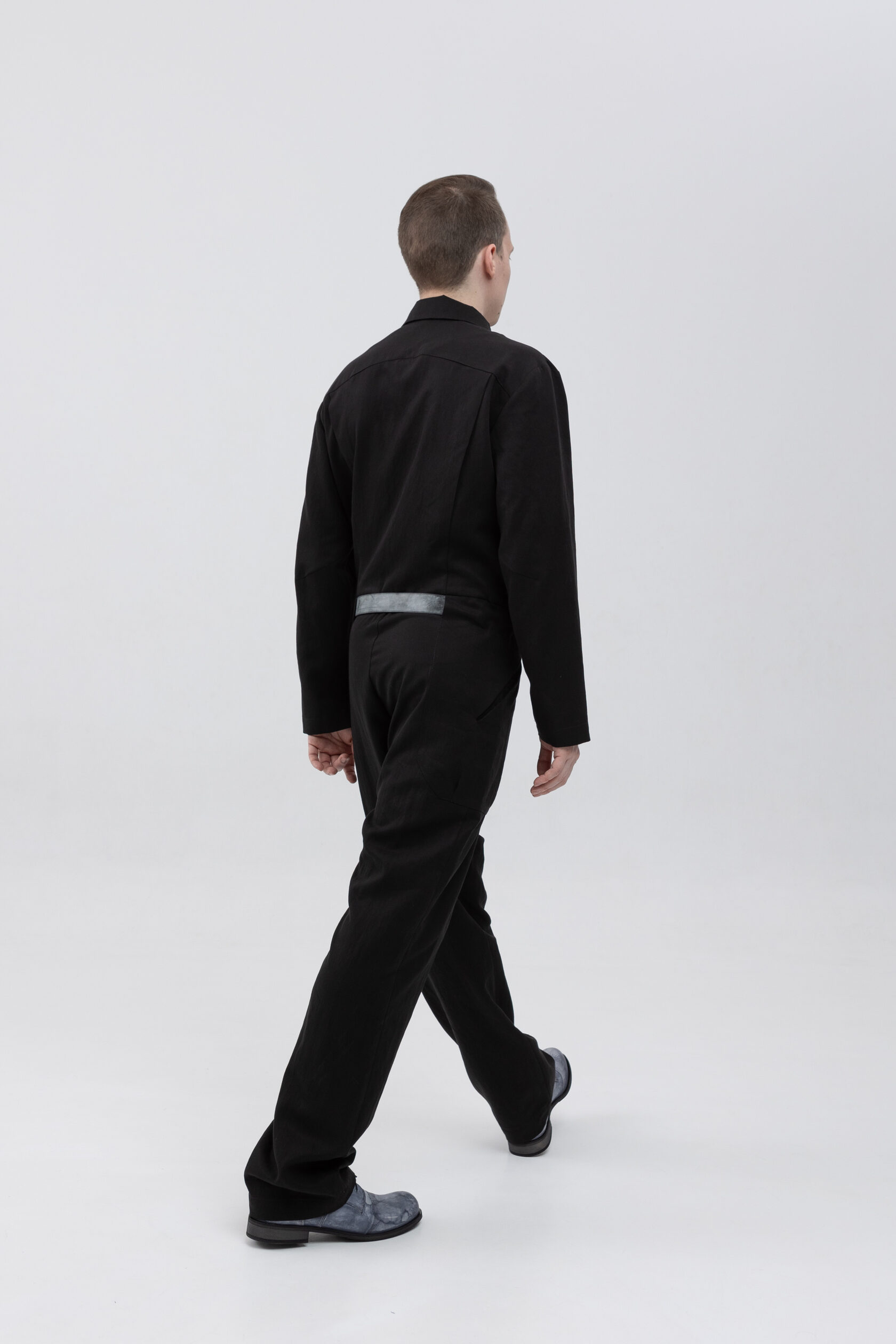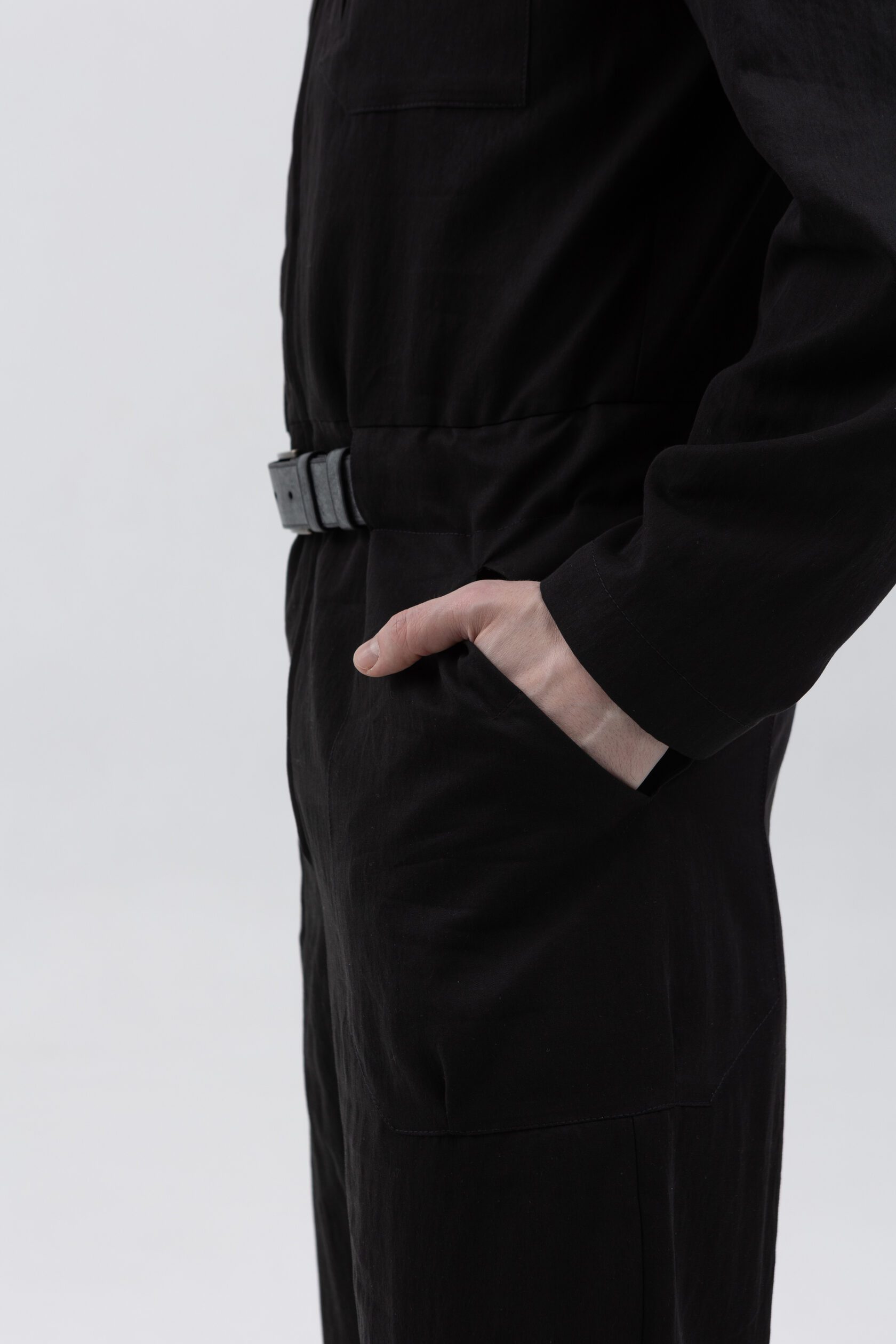У комбинезона — втачной рукав с диагональной локтевой вытачкой для пущей анатомичности и пластичности. Рукава без манжета, с широкой подгибкой — так их удобно закатывать.