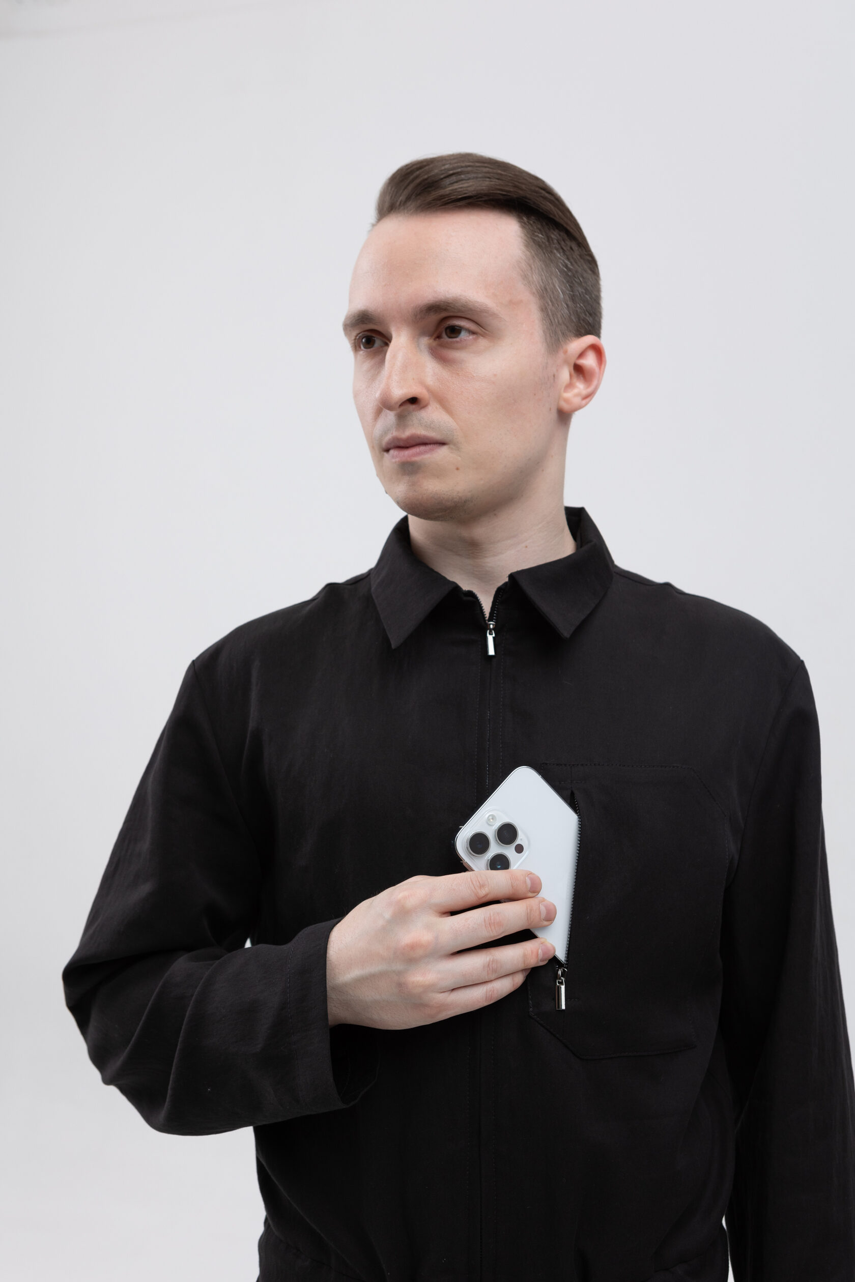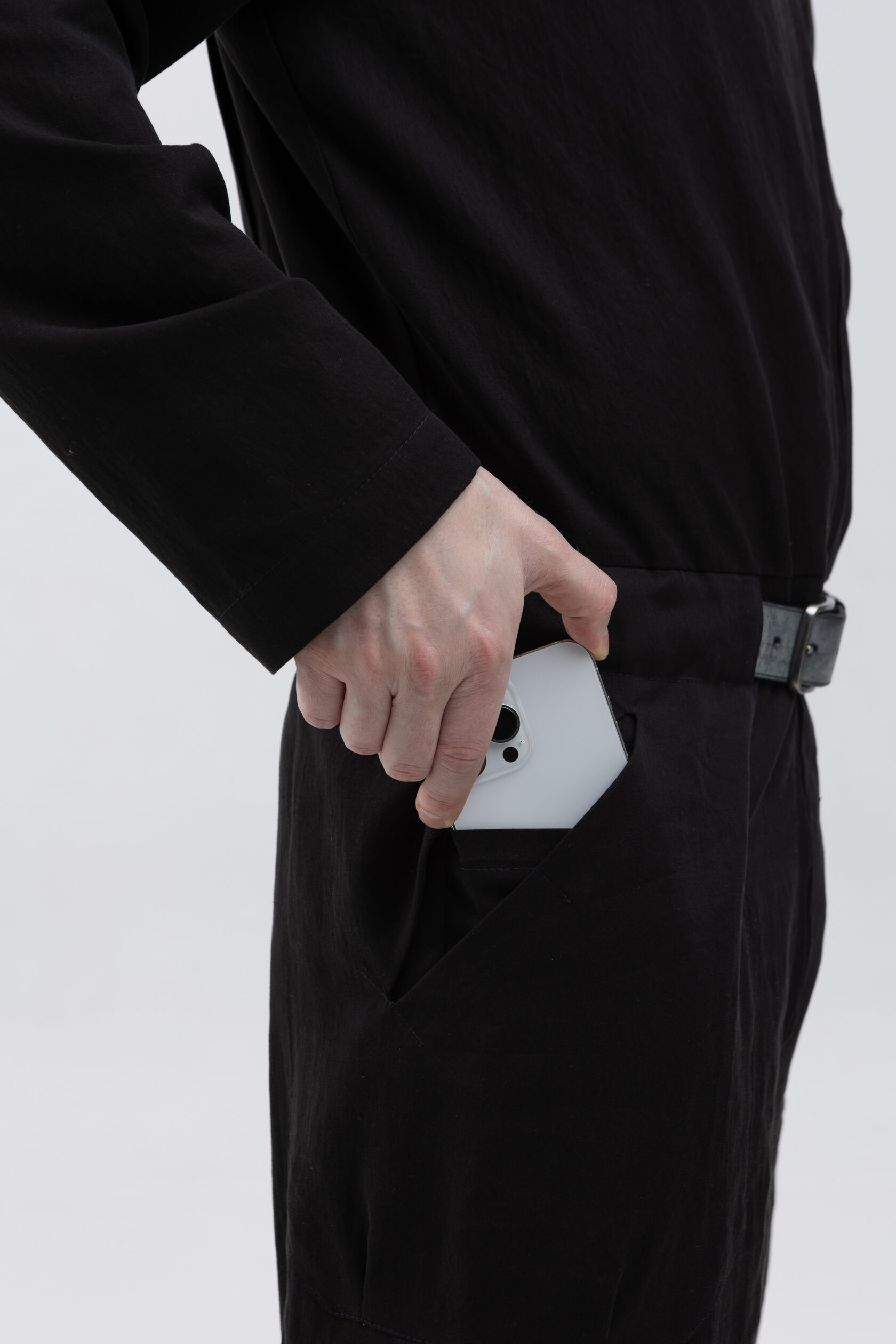 Внутренние карманы пришлось сделать из-за тенсела: он мягкий и пластичный, и всё, что будет лежать в обычных накладных карманах из тенсела, будет некрасиво провисать и топорщиться. Поэтому мы спрятали функциональные карманы внутрь. Они будут провисать и топорщиться внутри объёмных внешних — и не портить внешний вид.