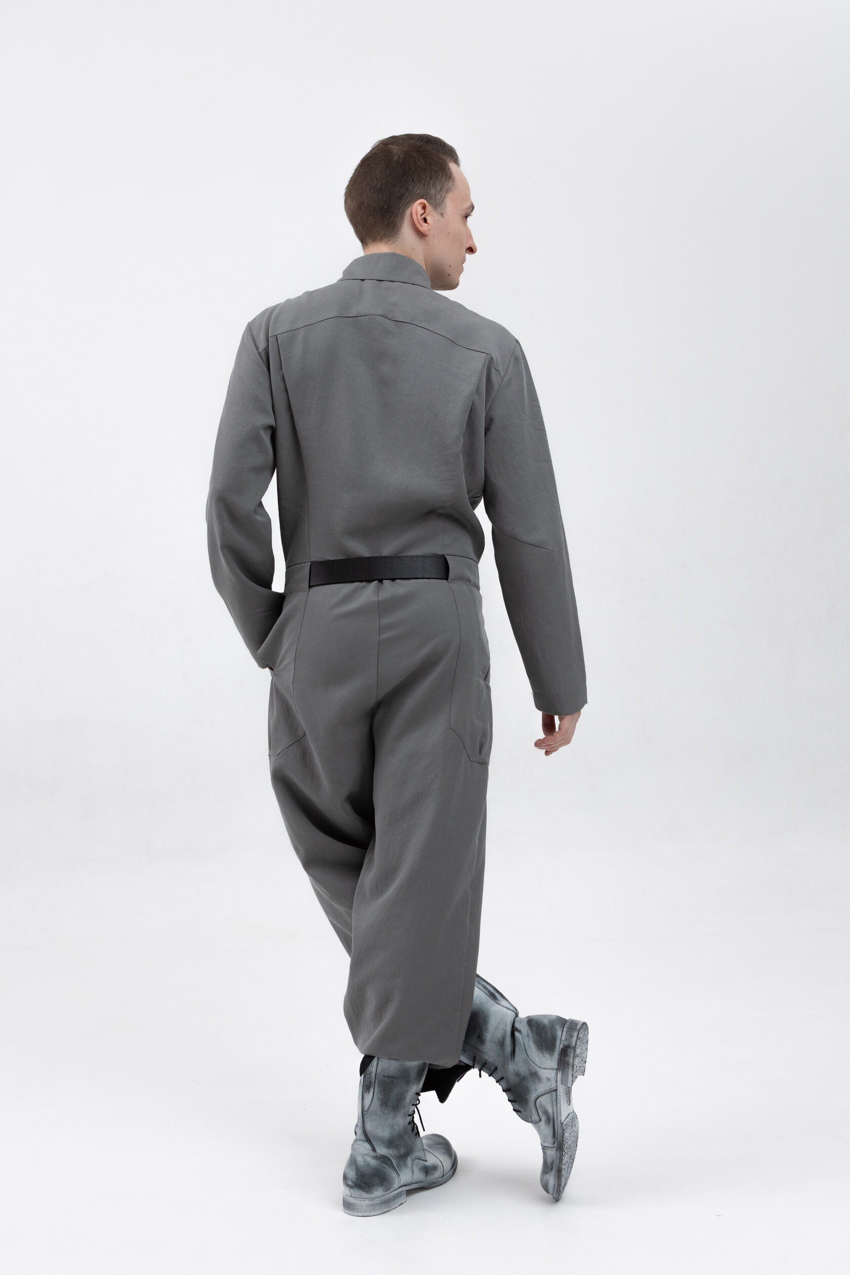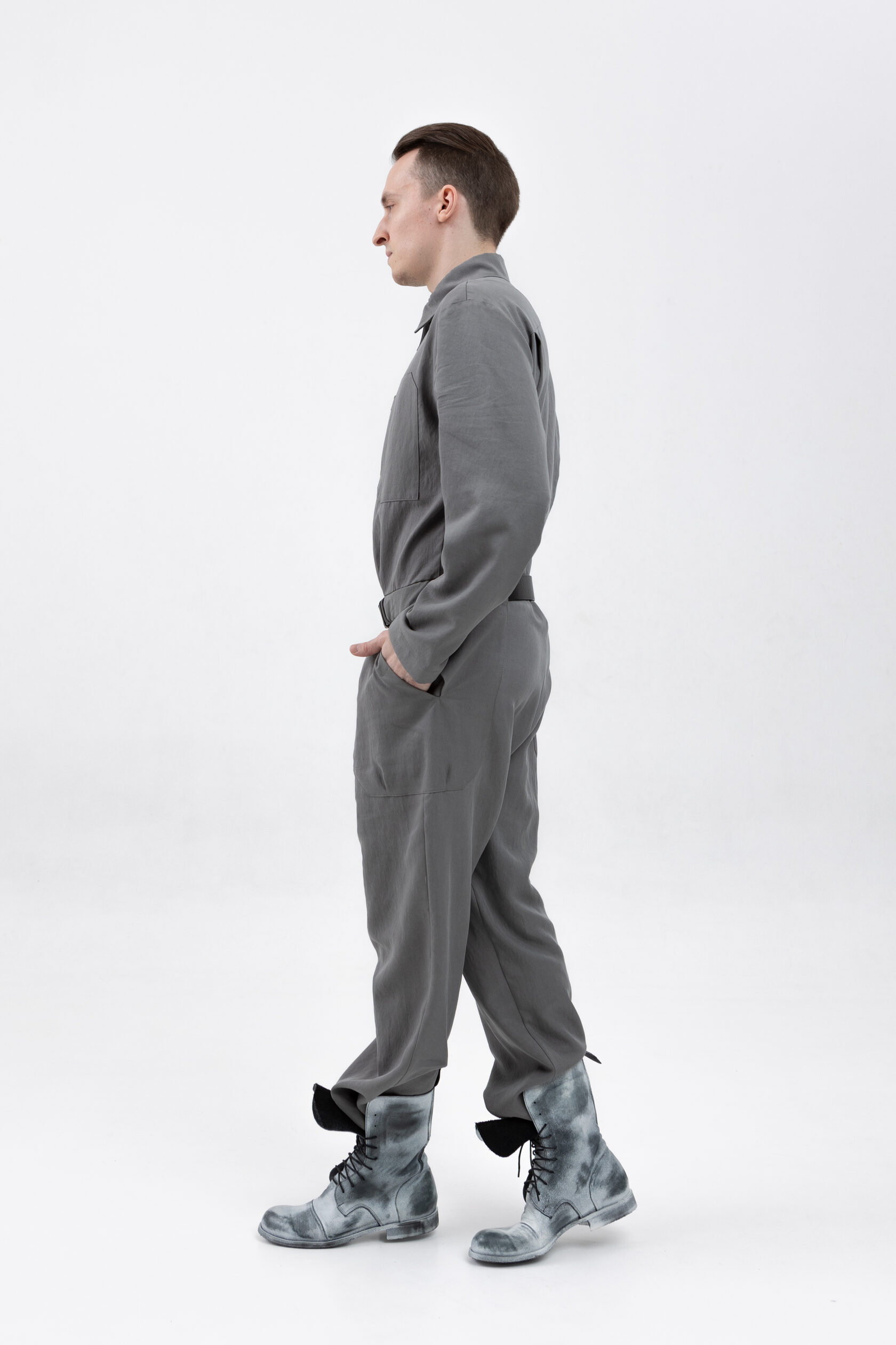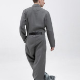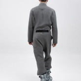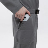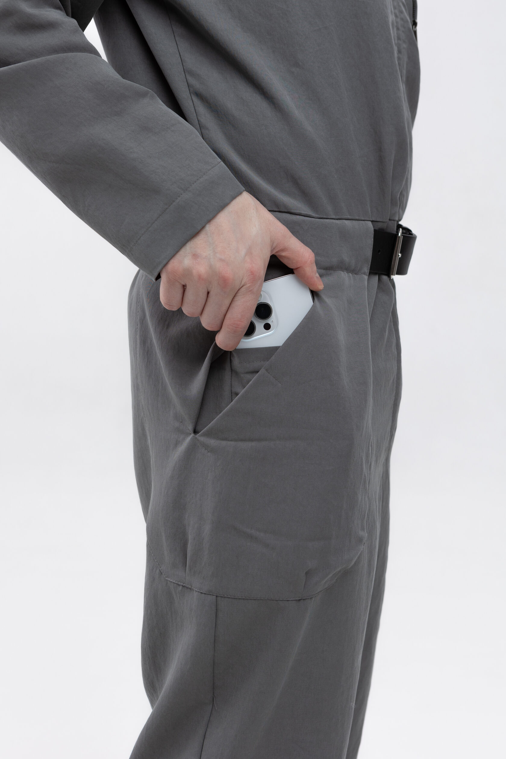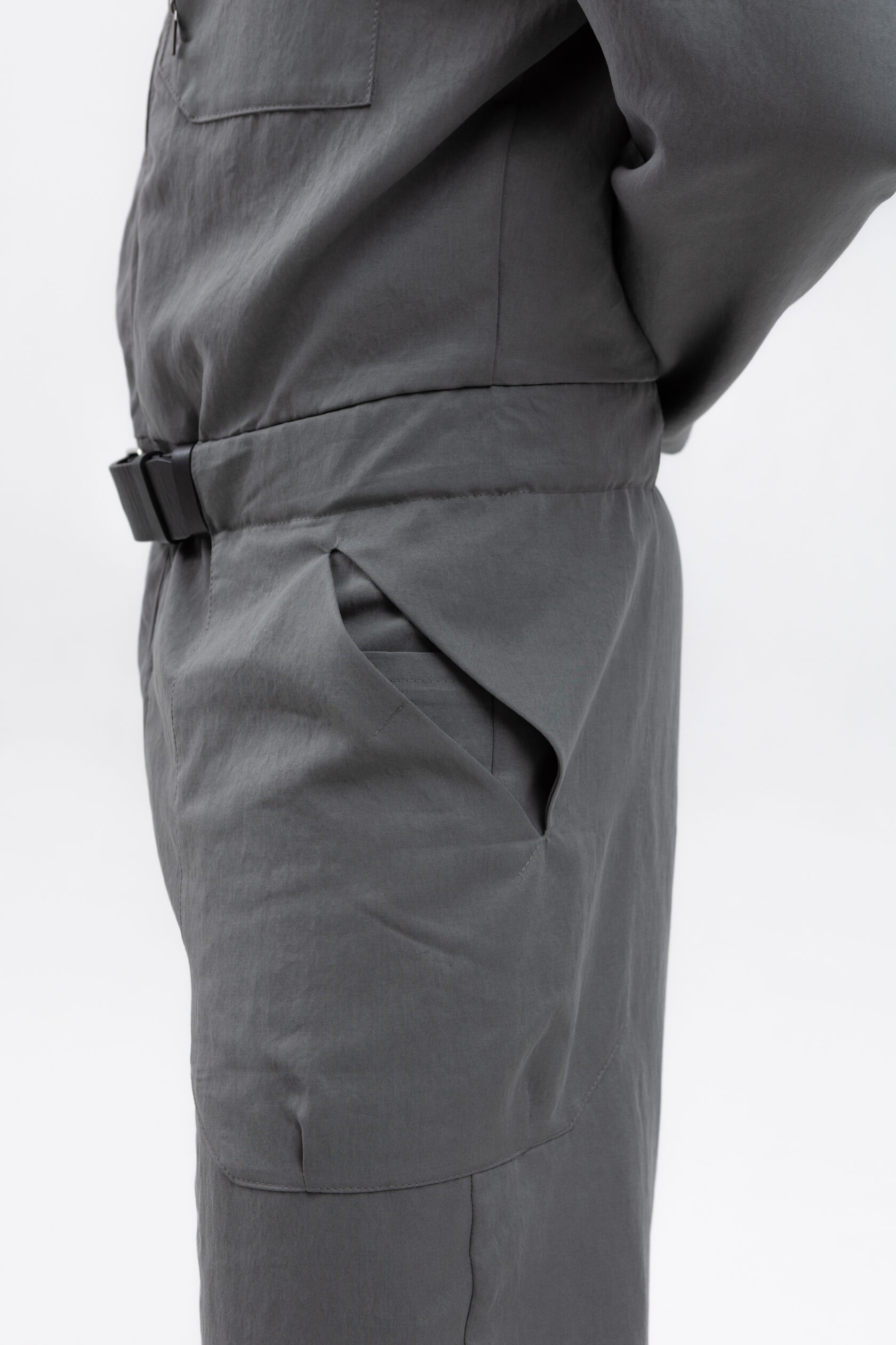 У комбинезона — втачной рукав с диагональной локтевой вытачкой для пущей анатомичности и пластичности. Рукава без манжета, с широкой подгибкой — так их удобно закатывать.