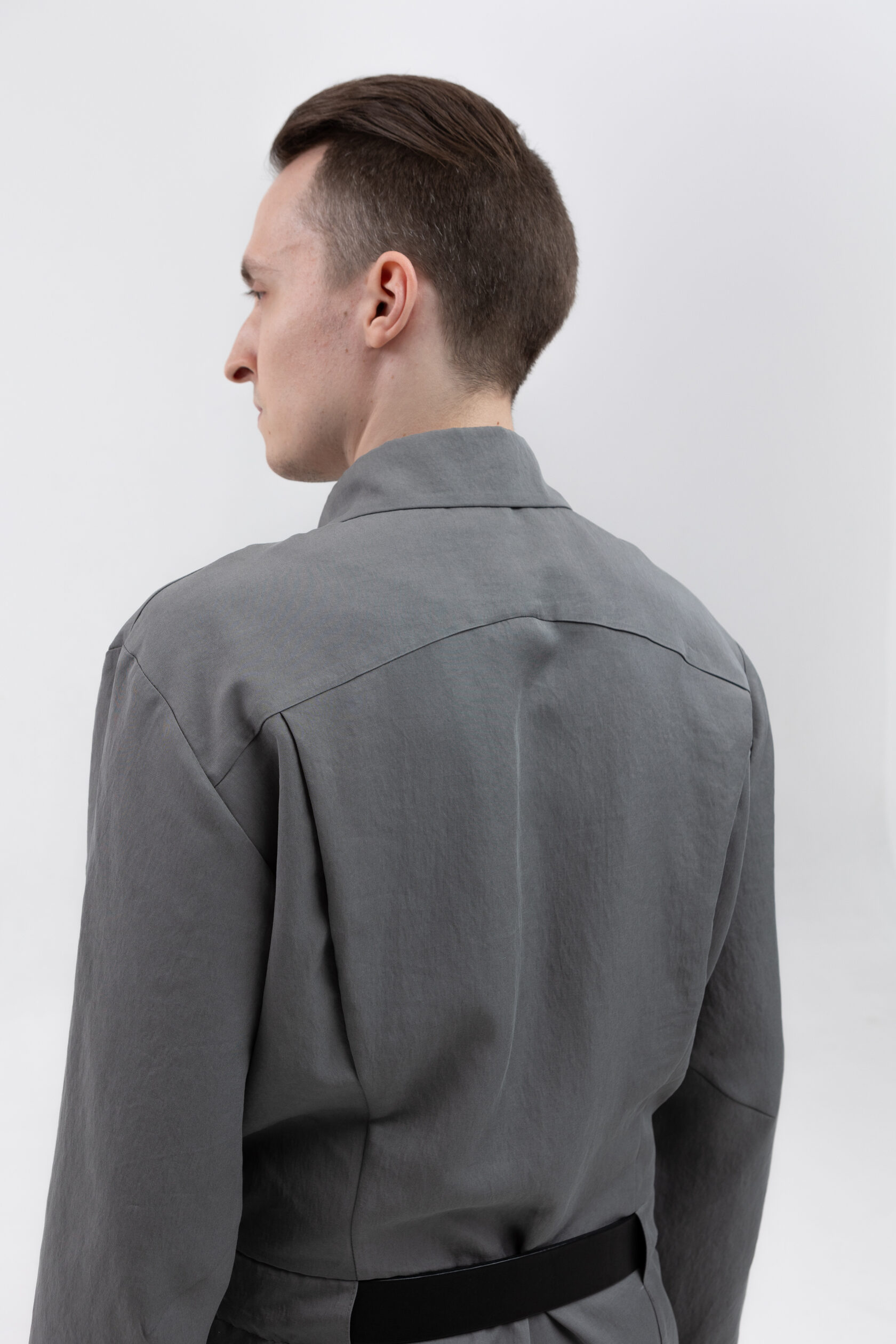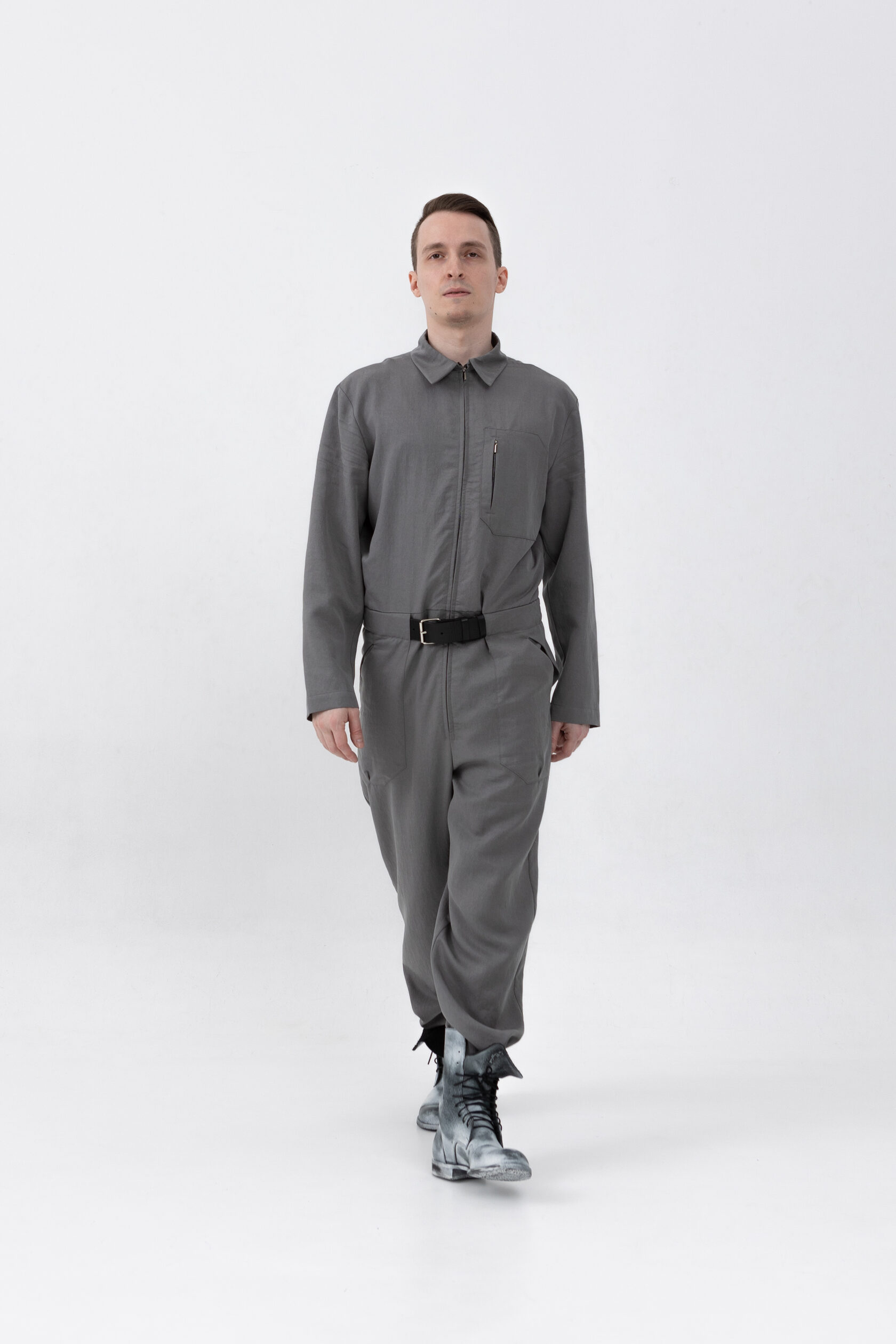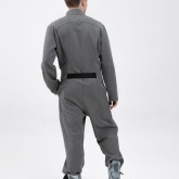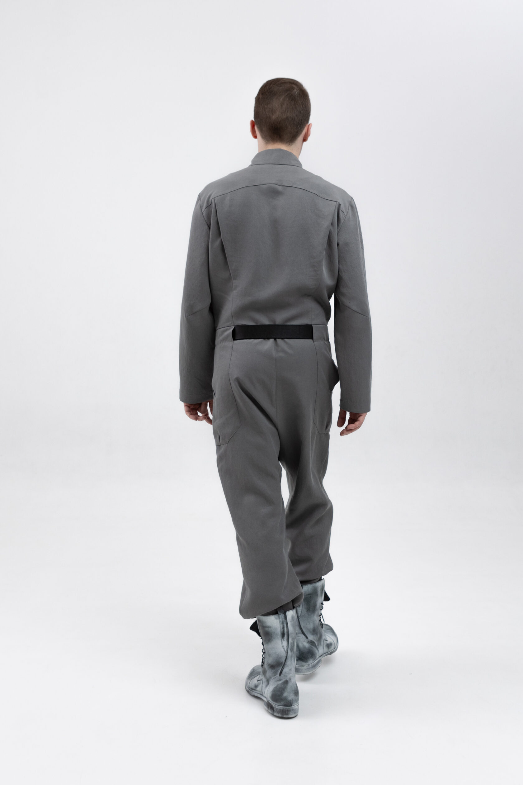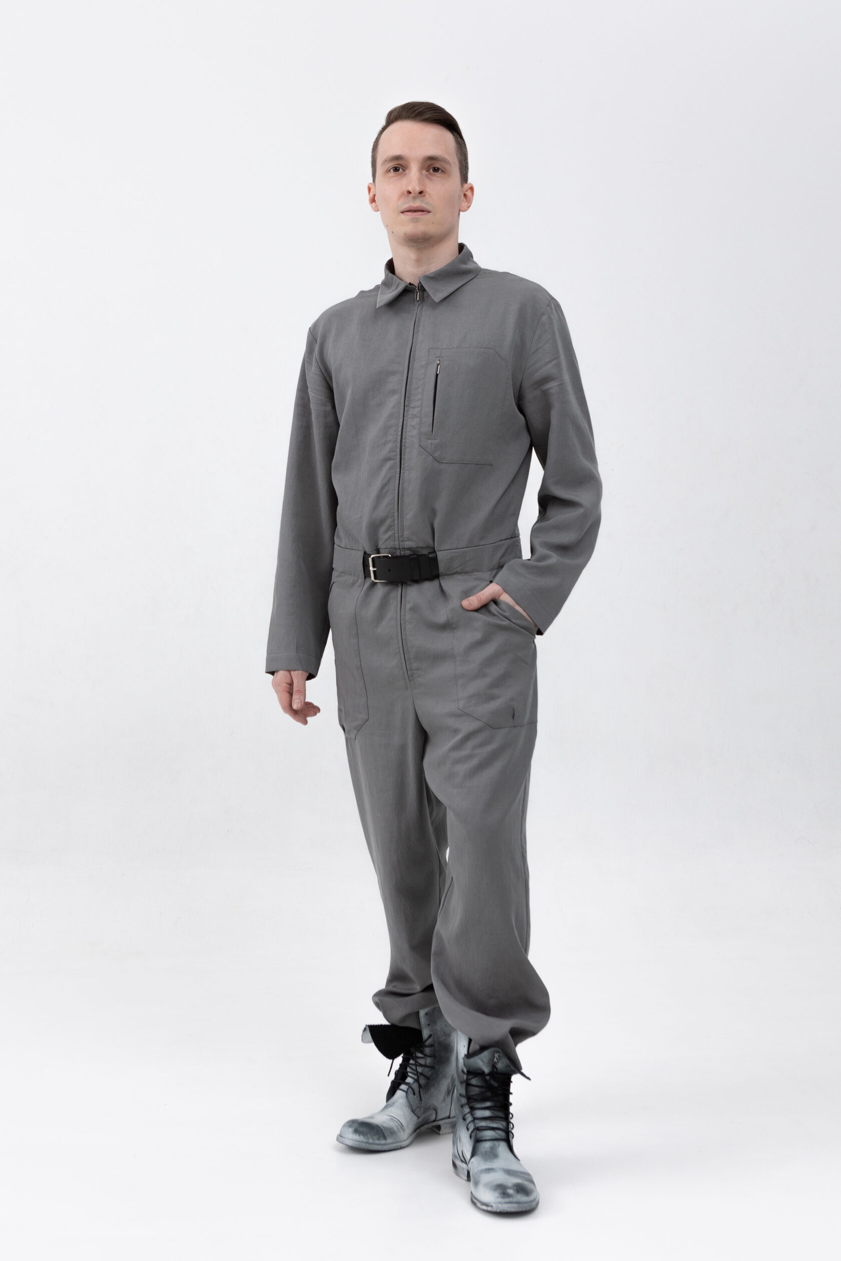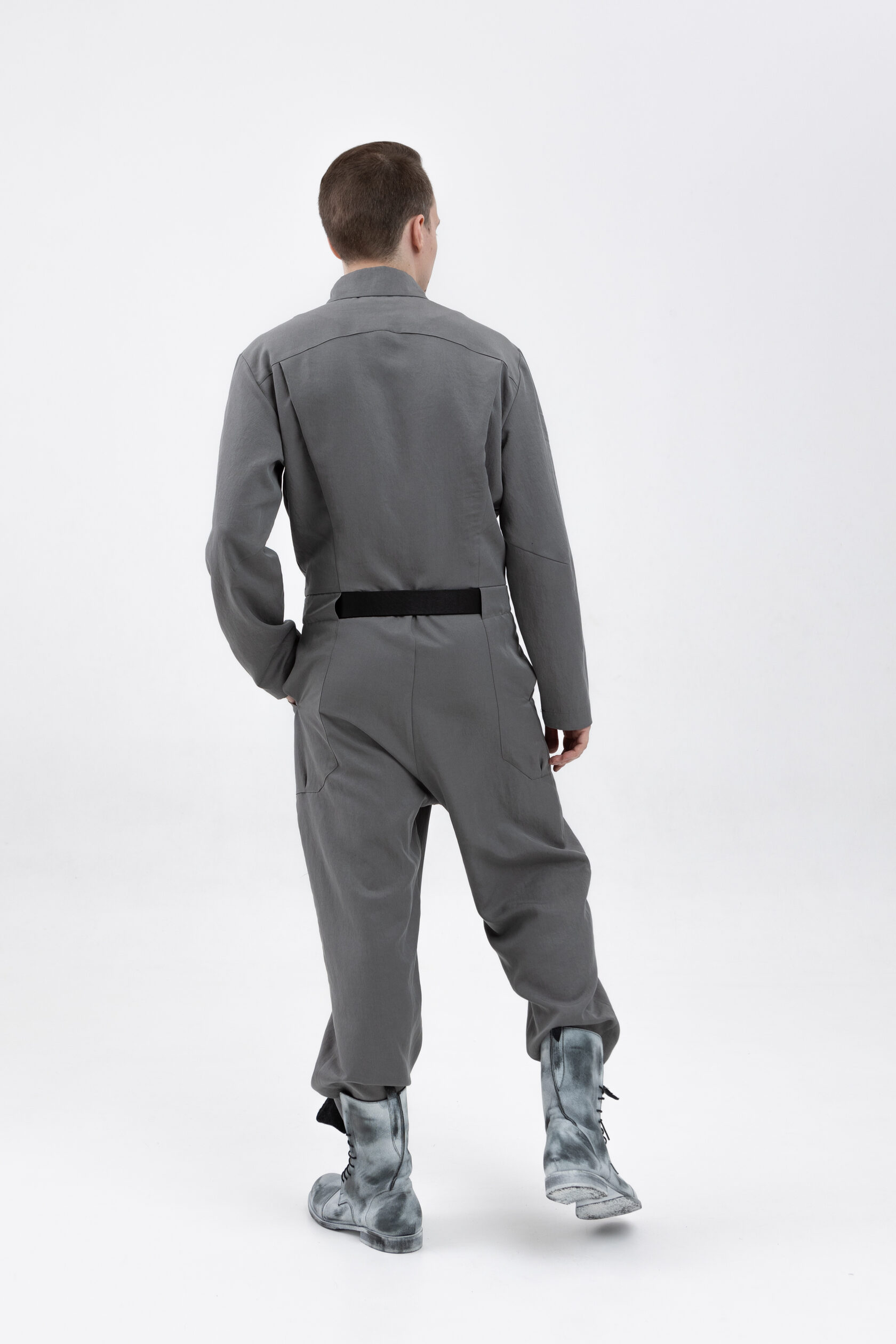 У комбинезона — втачной рукав с диагональной локтевой вытачкой для пущей анатомичности и пластичности. Рукава без манжета, с широкой подгибкой — так их удобно закатывать.