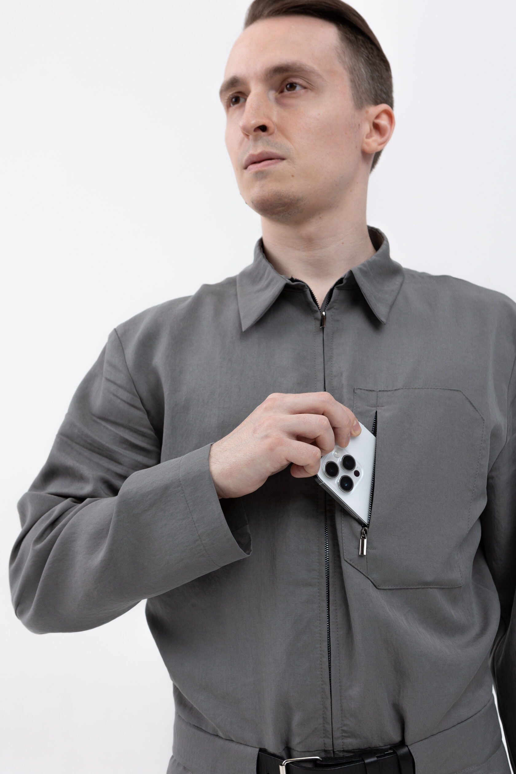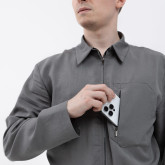 Внутренние карманы пришлось сделать из-за тенсела: он мягкий и пластичный, и всё, что будет лежать в обычных накладных карманах из тенсела, будет некрасиво провисать и топорщиться. Поэтому мы спрятали функциональные карманы внутрь. Они будут провисать и топорщиться внутри объёмных внешних — и не портить внешний вид.