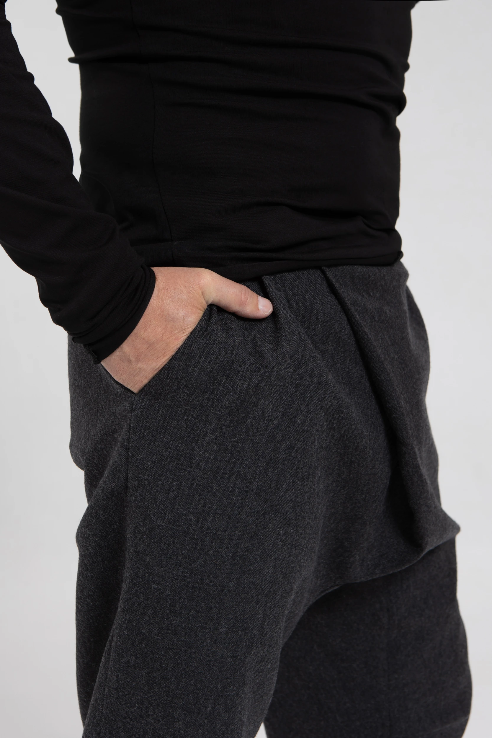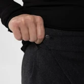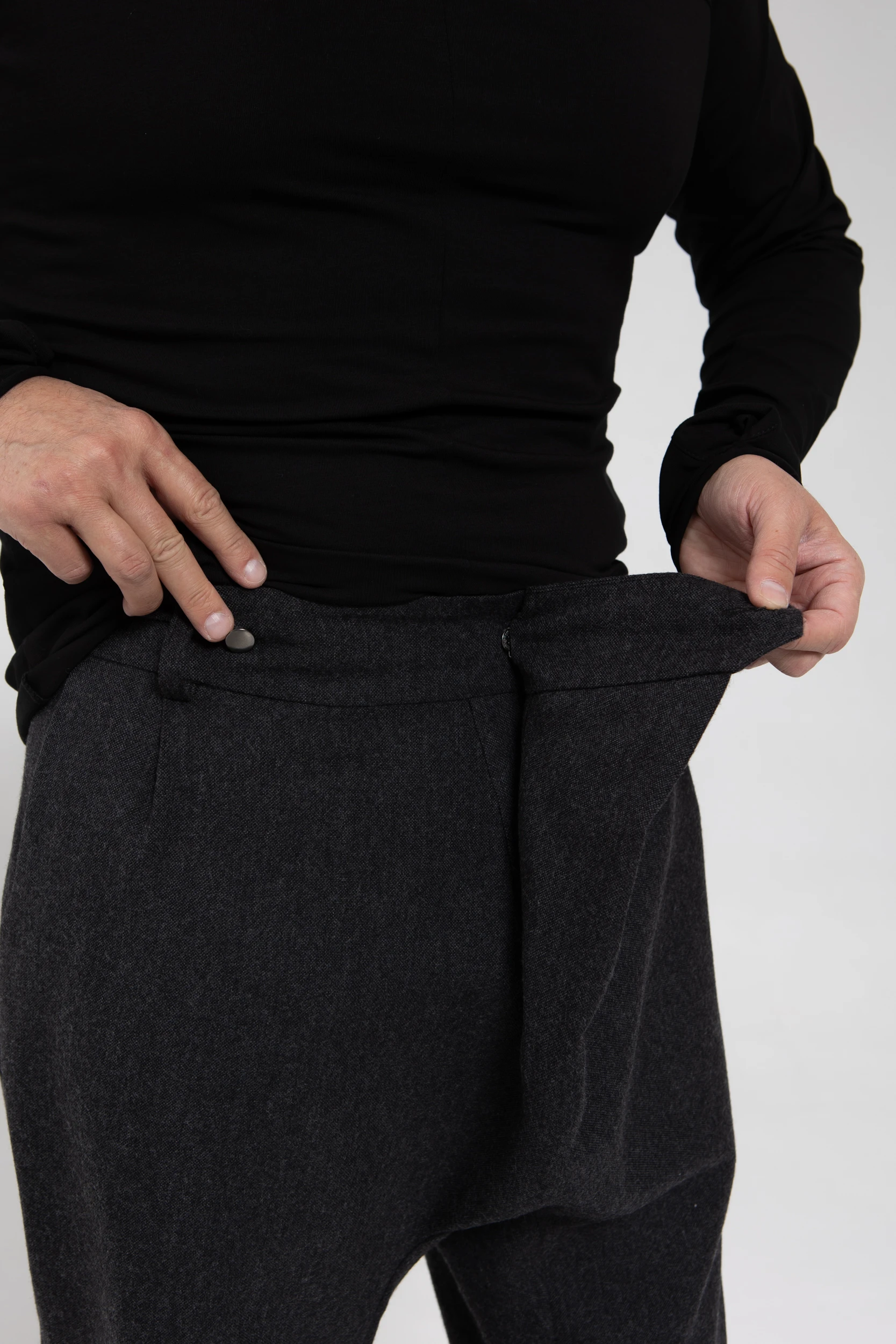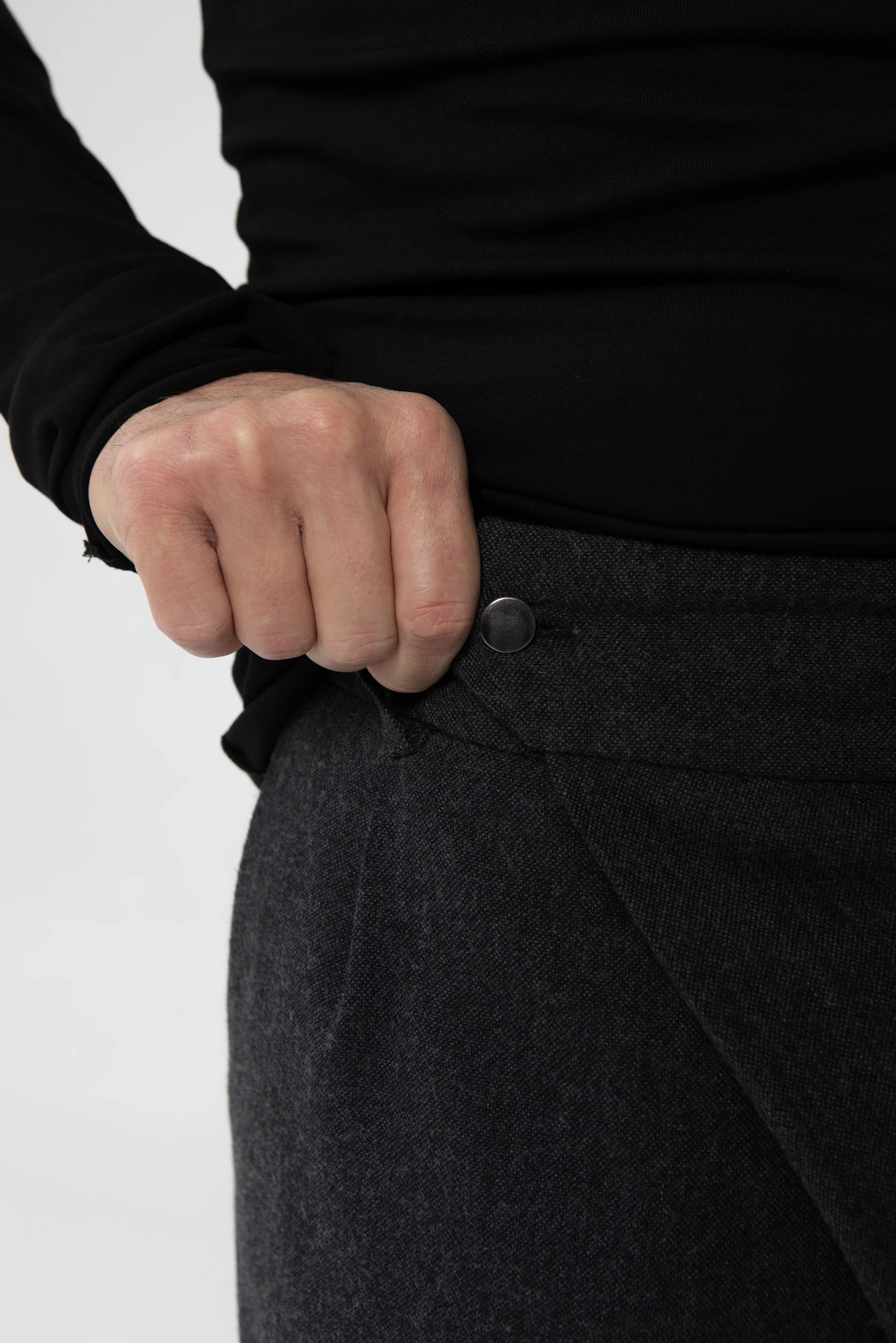У брюк нет переднего шва, зато спереди есть складка, в которой спрятался гульфик. Гульфик — как на нижнем белье, на пуговице. Максимально незаметный. Складка объёмная, но не переходящая в штанину. Мы очень хотели, чтобы штанины остались одинаковыми и не искажались при ходьбе за счёт складки. Поэтому складку в этой модели уместили только в области гульфика.