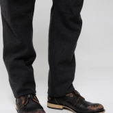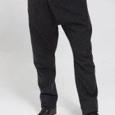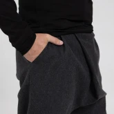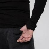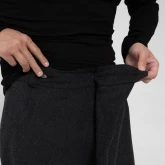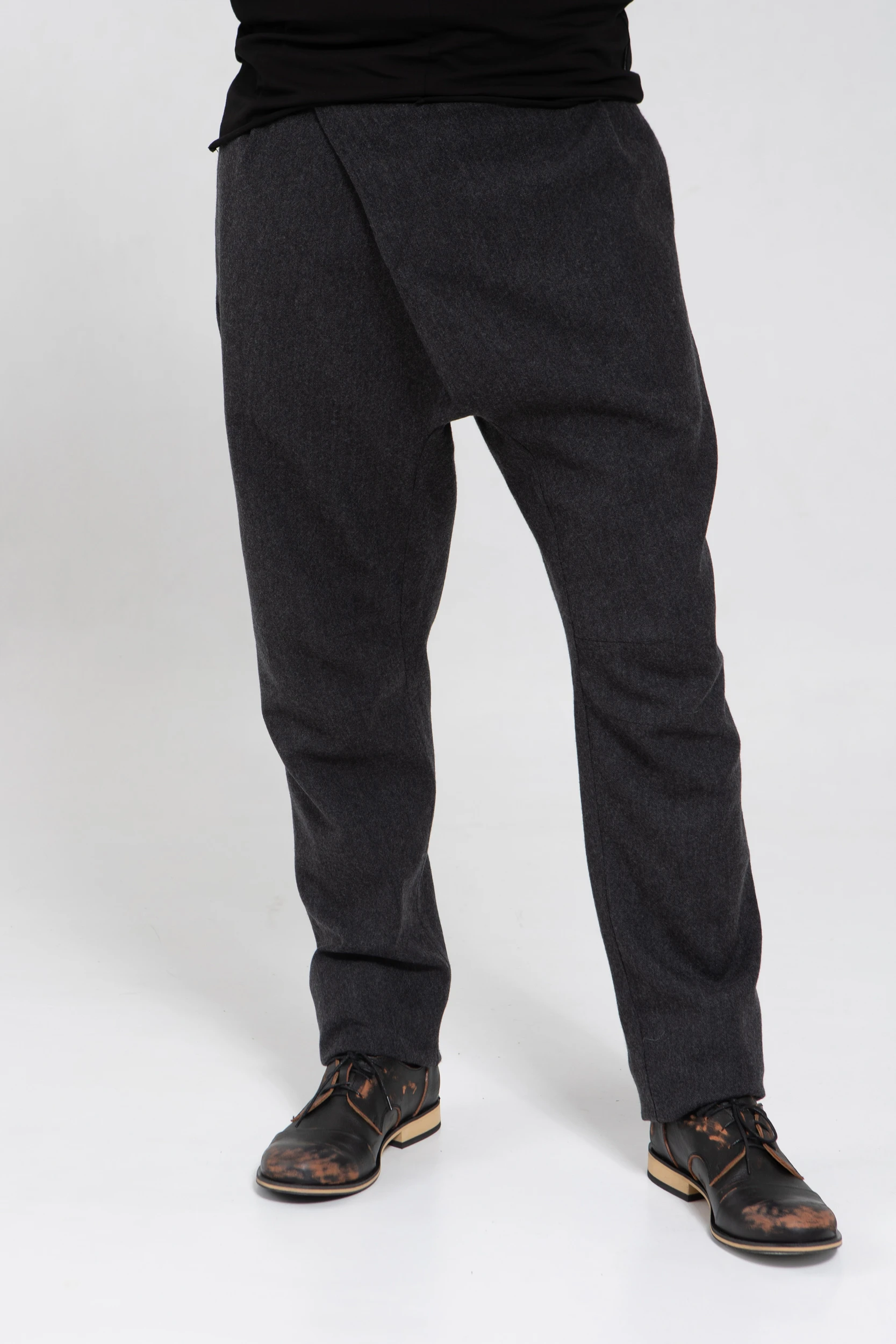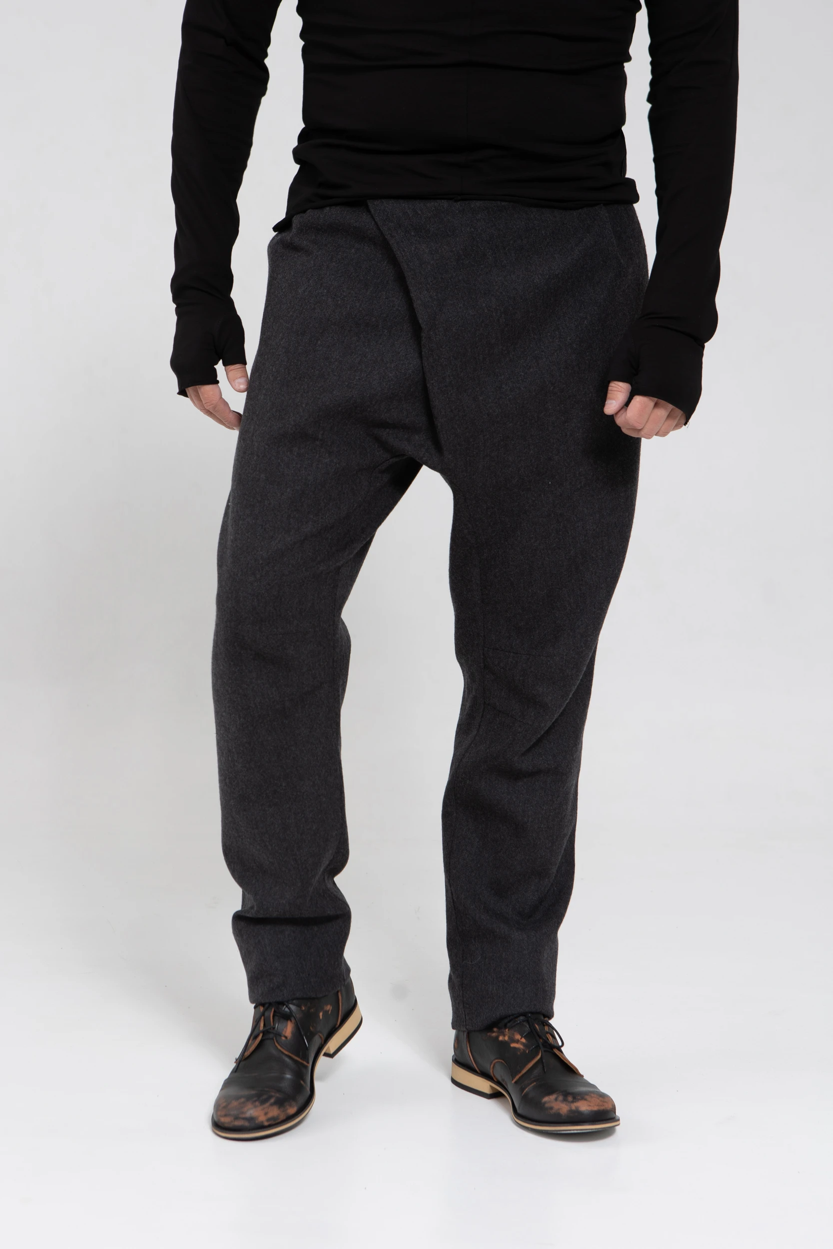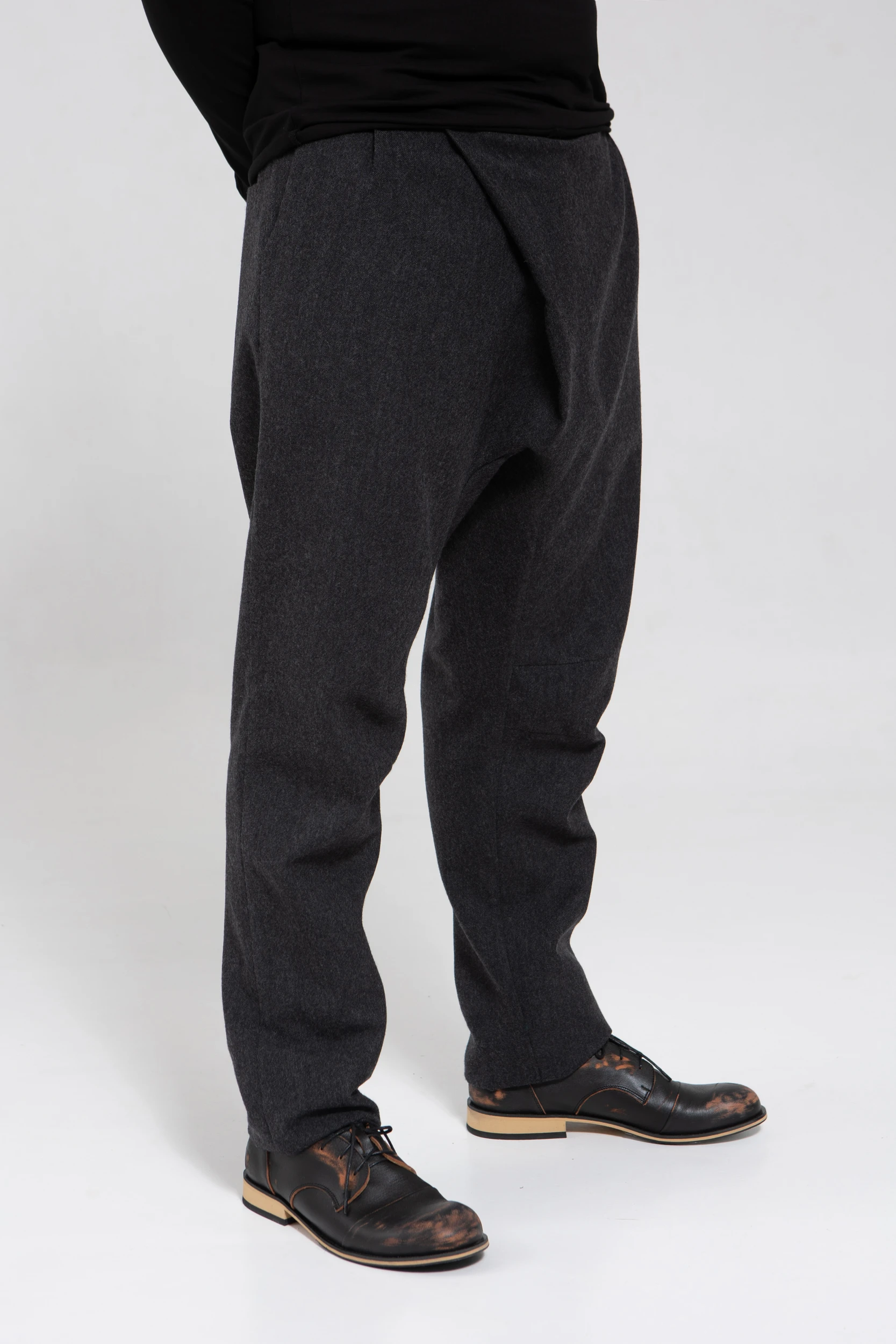 У брюк нет переднего шва, зато спереди есть складка, в которой спрятался гульфик. Гульфик — как на нижнем белье, на пуговице. Максимально незаметный. Складка объёмная, но не переходящая в штанину. Мы очень хотели, чтобы штанины остались одинаковыми и не искажались при ходьбе за счёт складки. Поэтому складку в этой модели уместили только в области гульфика.