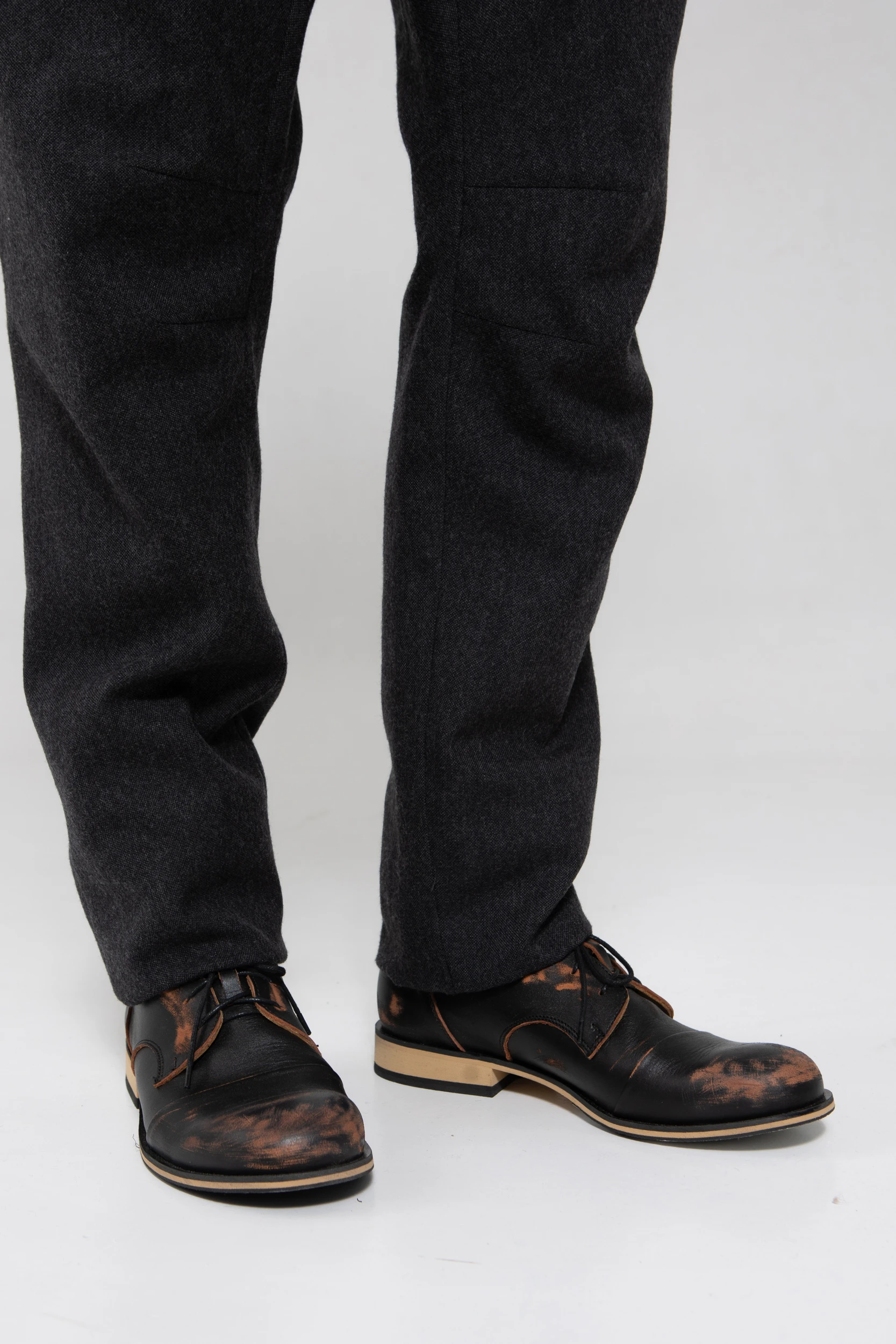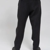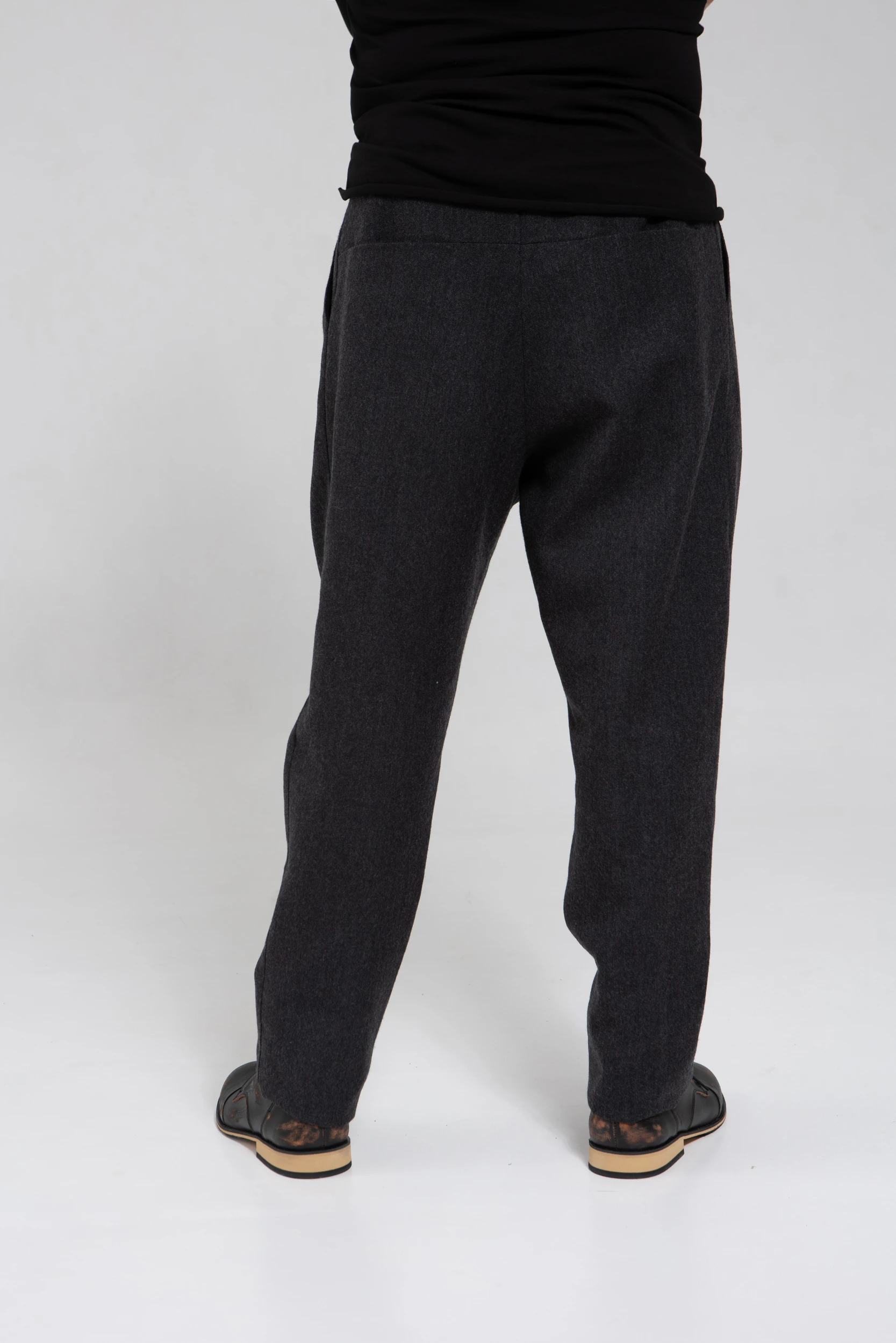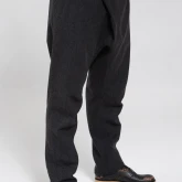 Брюки с посадкой на поясе, но с заниженным шаговым швом. Свободные в области бёдер и слегка зауженные по икрам. У брюк — фирменные be:ra-вские, не провисающие задние карманы и классические боковые. Пояс сзади немного завышен — как на исторических моделях штанов, чтобы не оголялась поясница при наклонах.