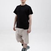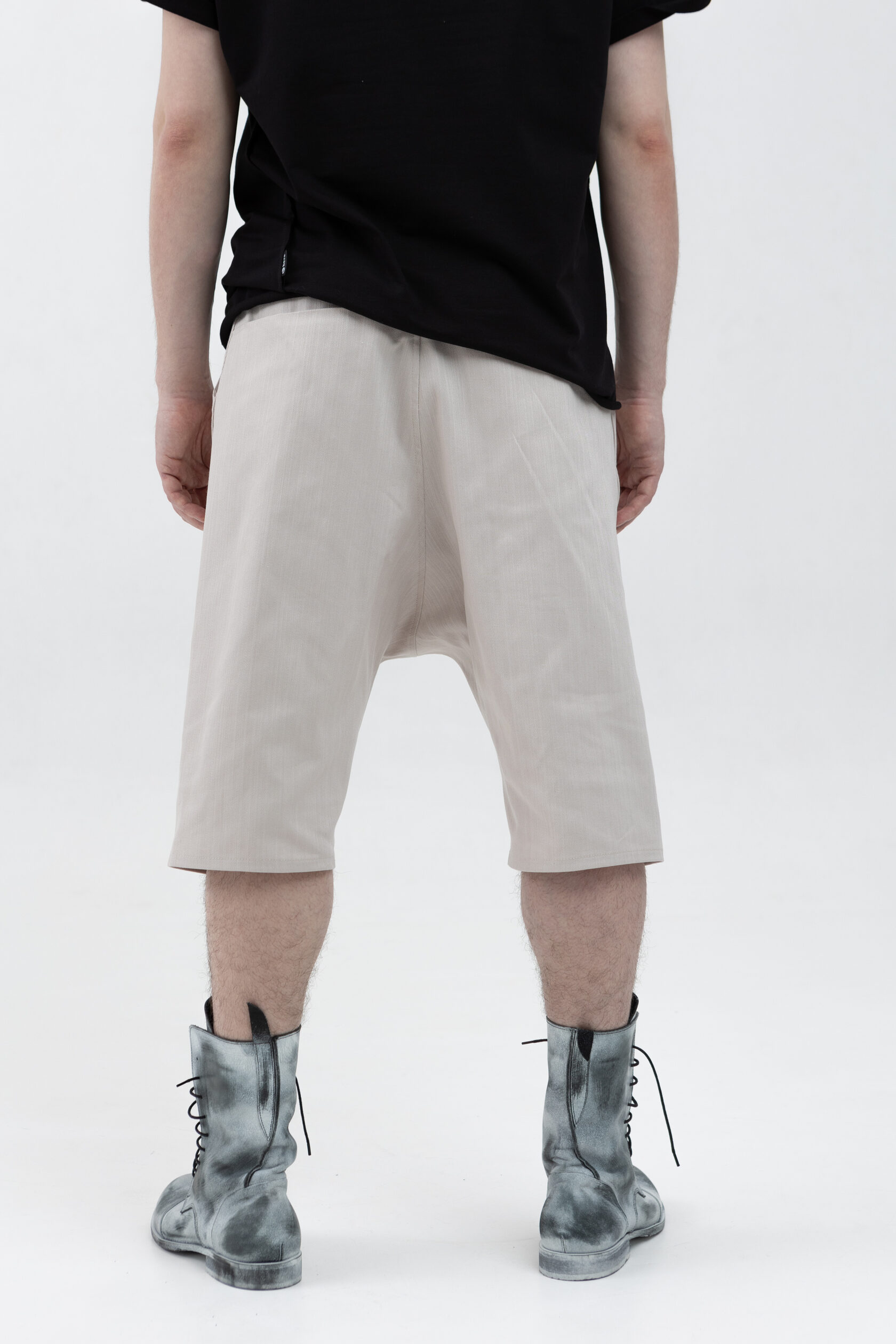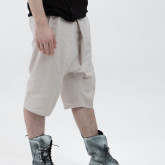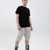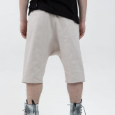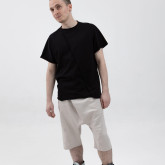 Шорты из тонкого денима — свободные в области бёдер, с посадкой на поясе и заниженным шаговым швом. У шорт — фирменные be:ra-вские, не провисающие задние карманы и классические боковые. Пояс сзади немного завышен — как на исторических моделях штанов, чтобы не оголялась поясница при наклонах.