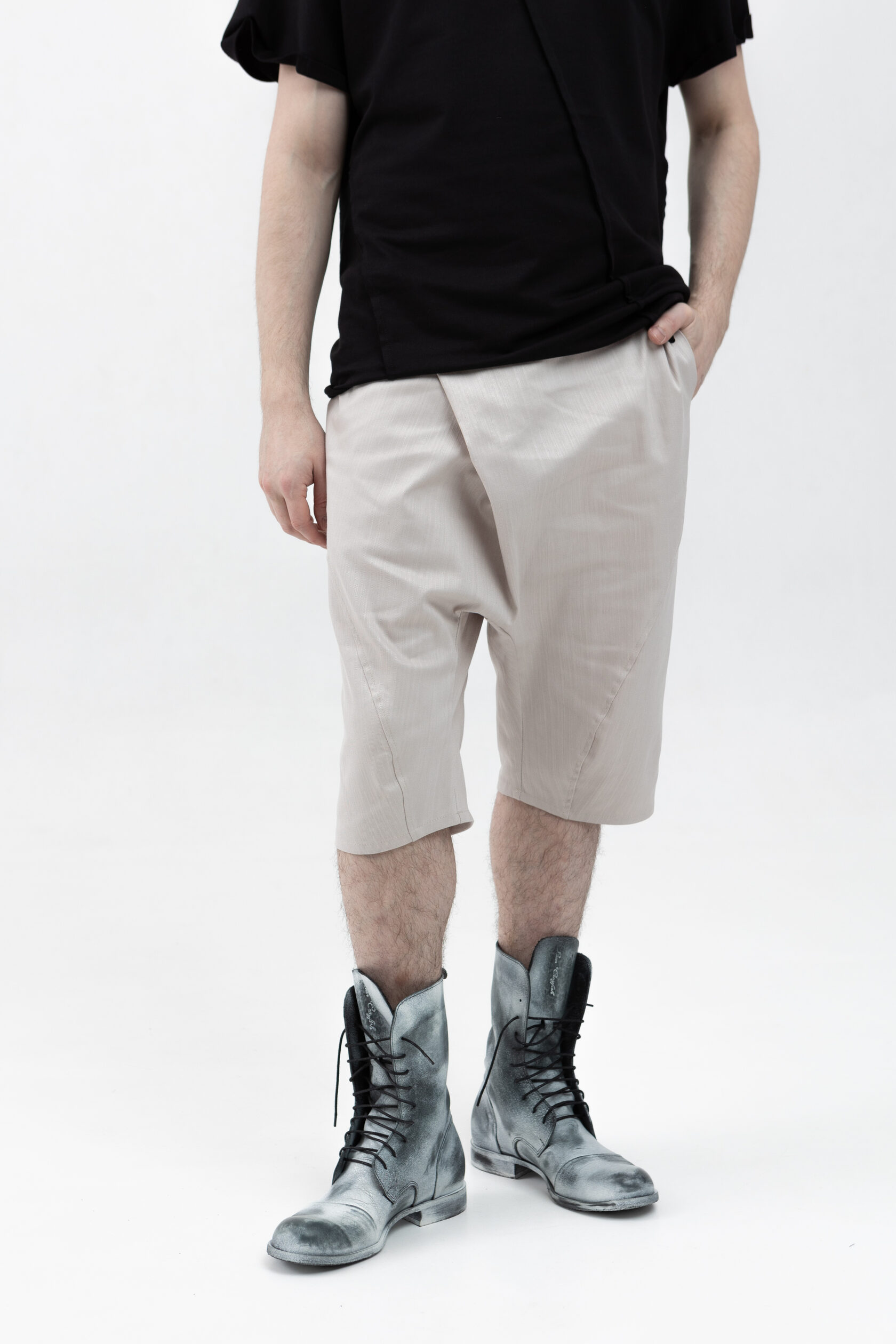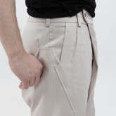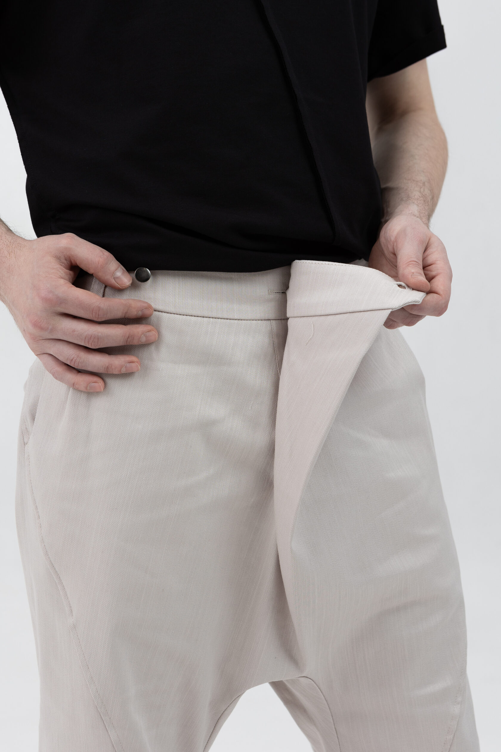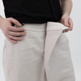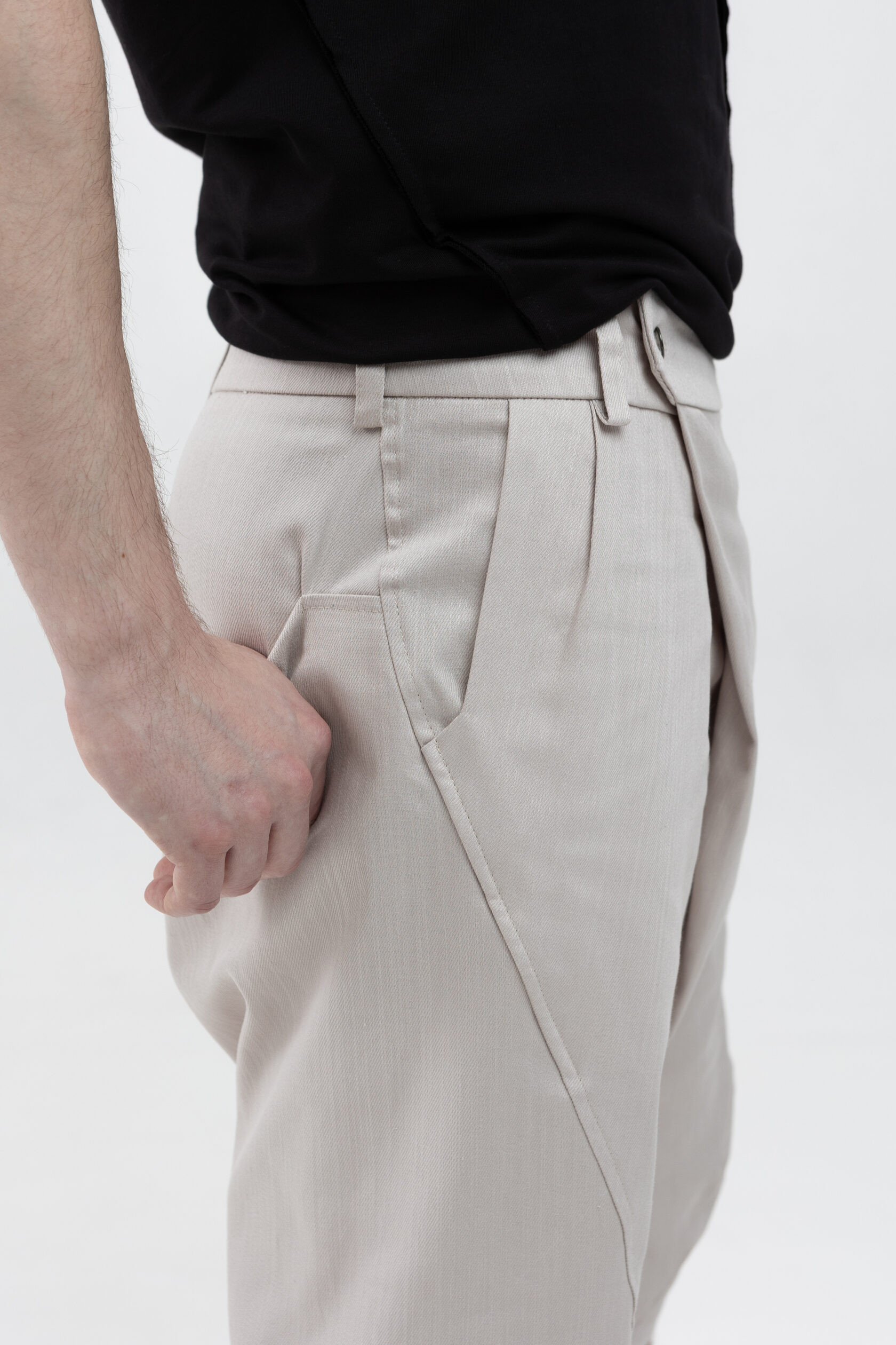 У шорт нет переднего шва, зато спереди есть складка, в которой спрятался гульфик. Гульфик как на нижнем белье — на пуговице. Максимально незаметный. Складка объёмная, но не переходящая в штанину. Мы очень хотели, чтобы штанины остались одинаковыми и не искажались при ходьбе за счёт складки. Поэтому складку в этой модели уместили только в области гульфика.