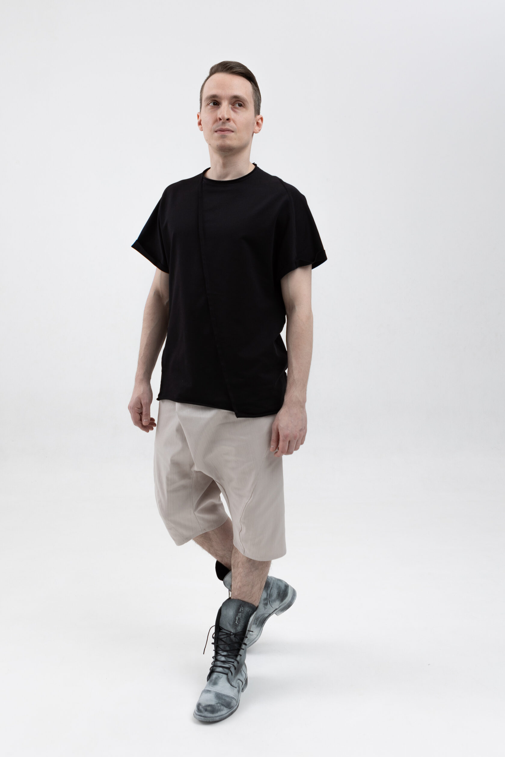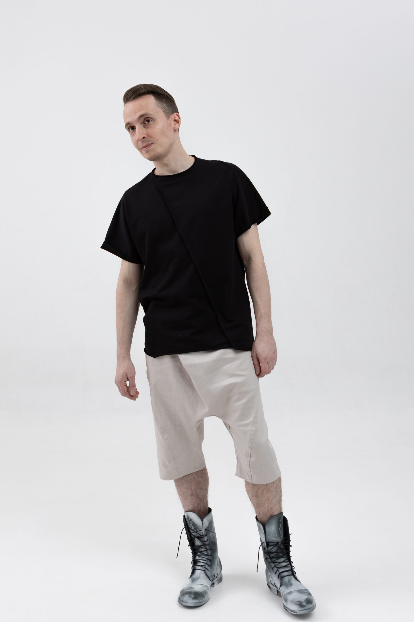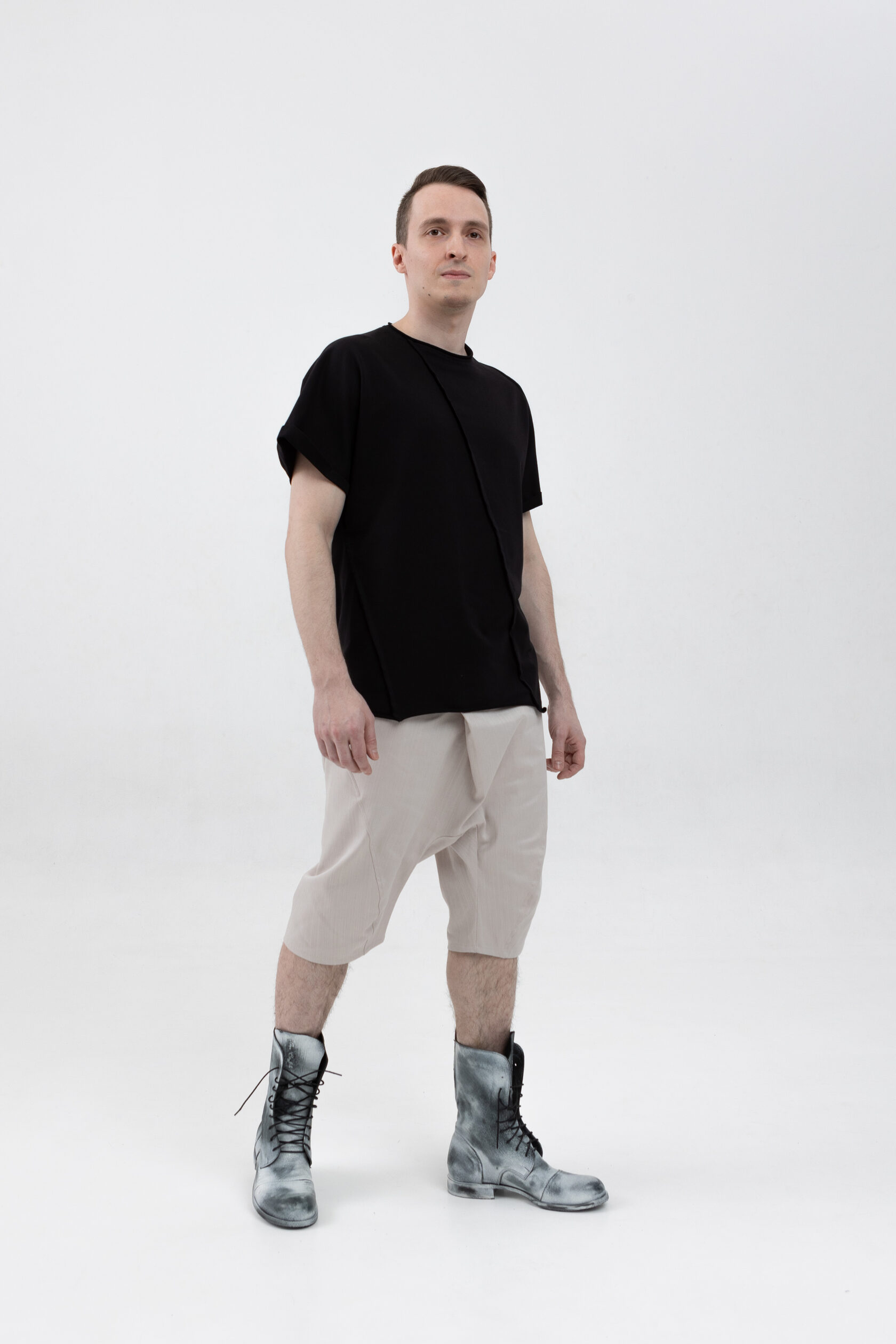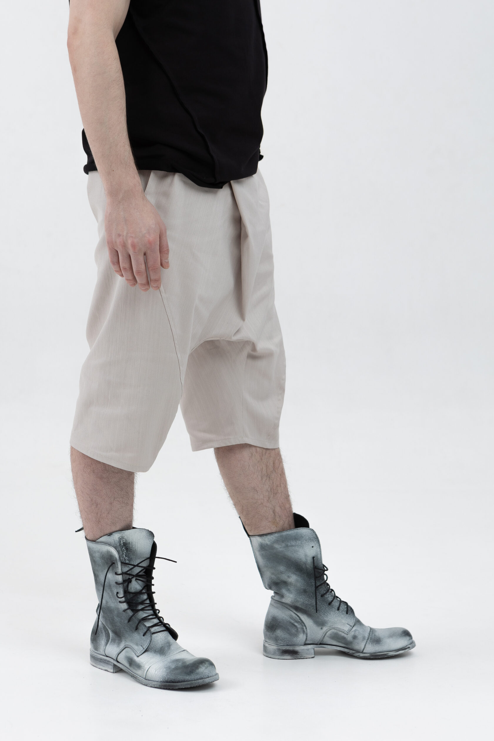 У шорт нет переднего шва, зато спереди есть складка, в которой спрятался гульфик. Гульфик как на нижнем белье — на пуговице. Максимально незаметный. Складка объёмная, но не переходящая в штанину. Мы очень хотели, чтобы штанины остались одинаковыми и не искажались при ходьбе за счёт складки. Поэтому складку в этой модели уместили только в области гульфика.