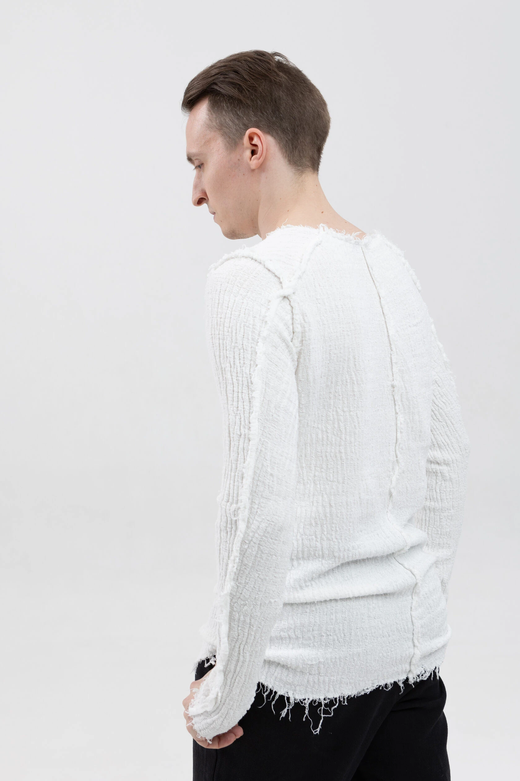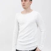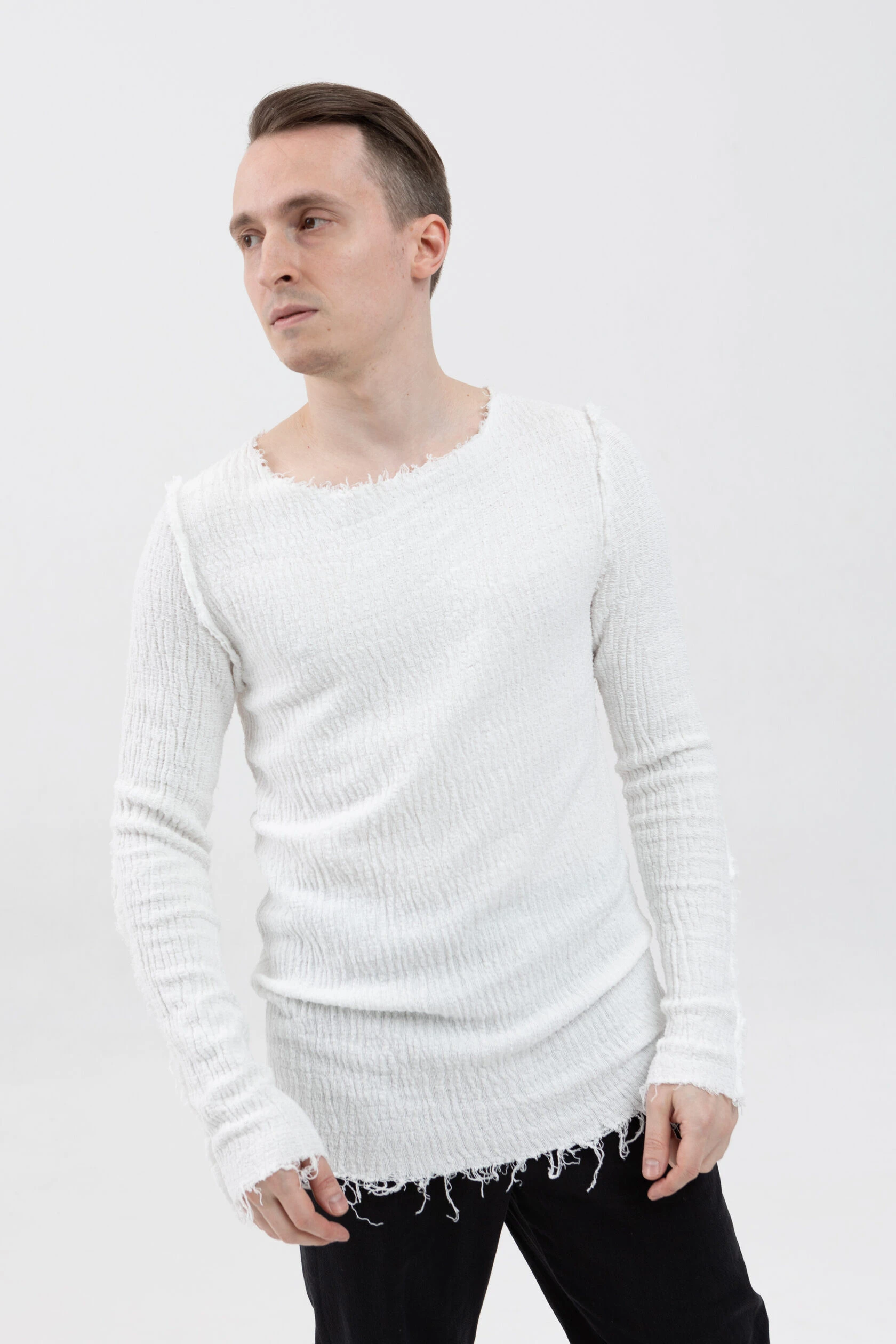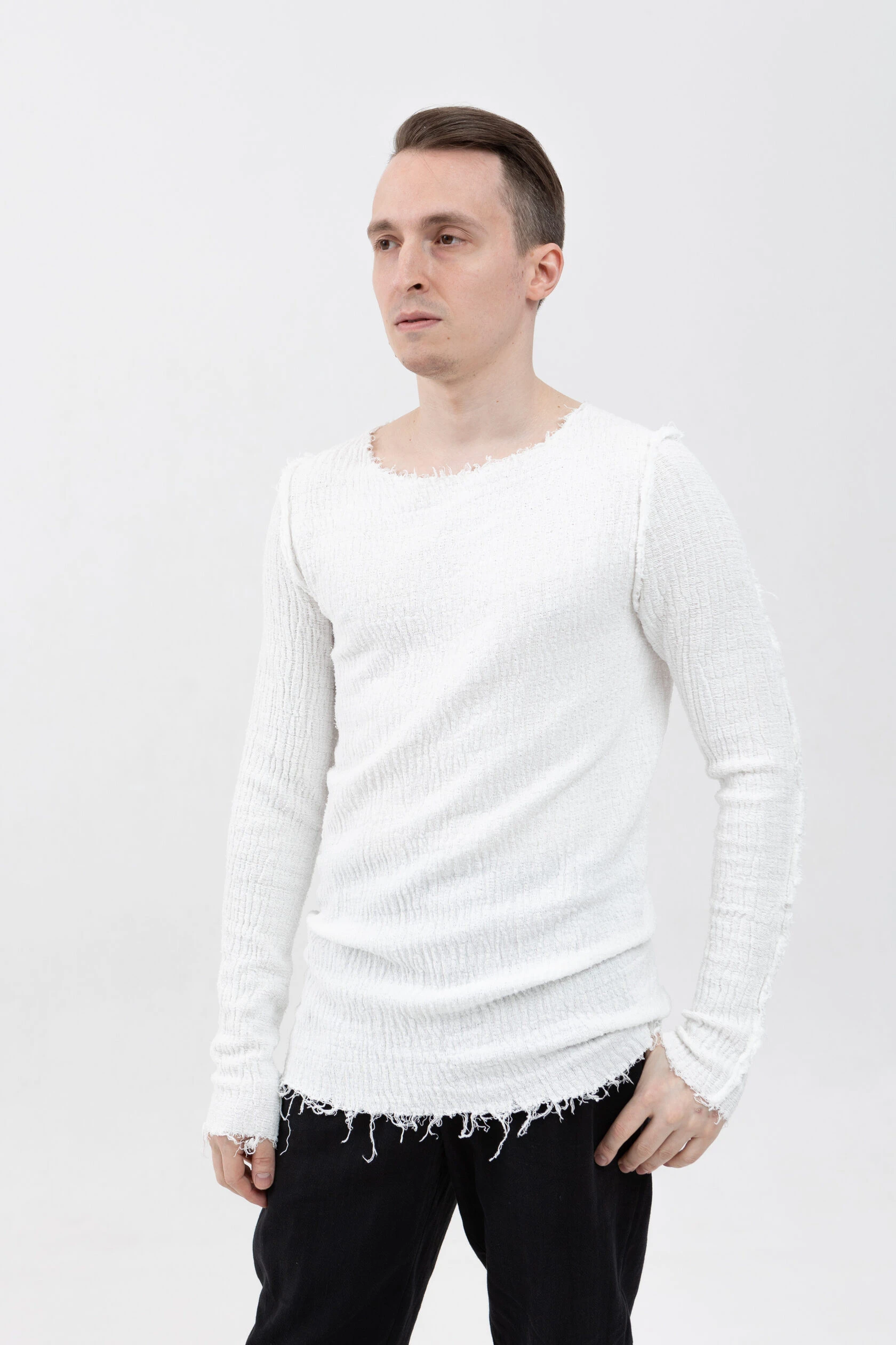 Белый цвет, плетёная фактура, минимум швов. Наденьте её с джинсами — и вы хиппи. С костюмом — и вы уже «креативный художник».