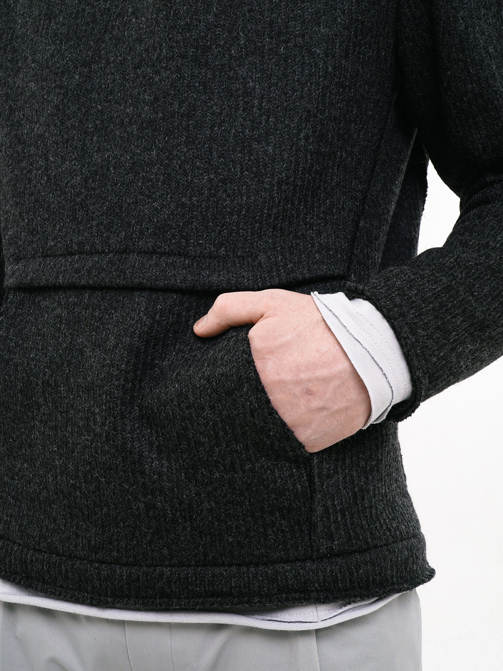 Спереди у свитера — новое прочтение привычного кармана-кенгуру. Вроде спортивный, а вроде и нет. Внутри кармана вы обнаружите трикотажный тонкий подклад, чтобы было мягко рукам и не пухло на животе.