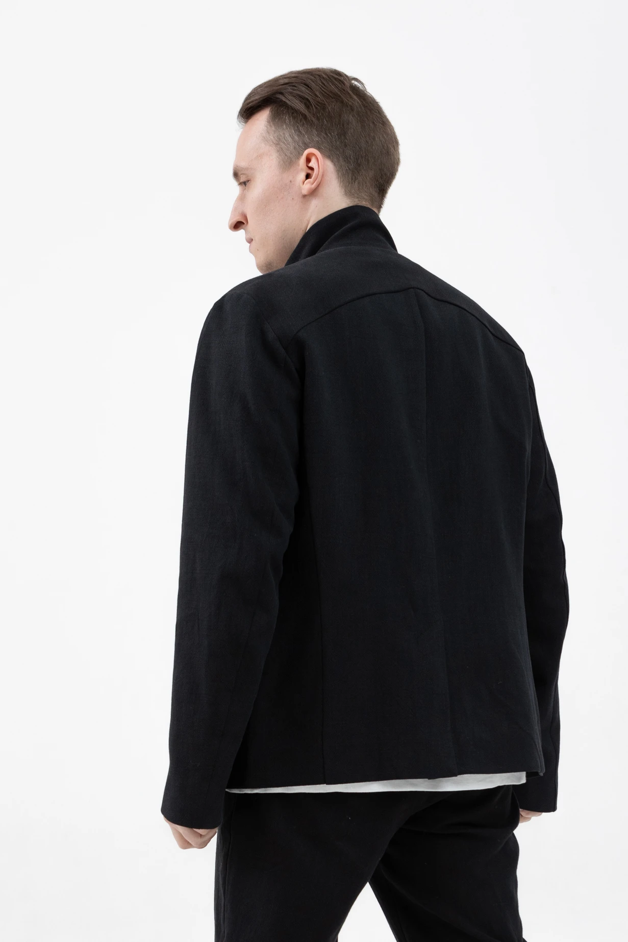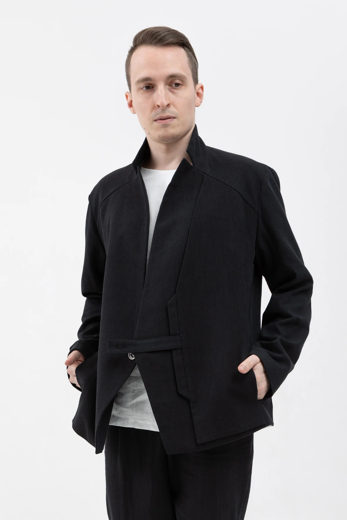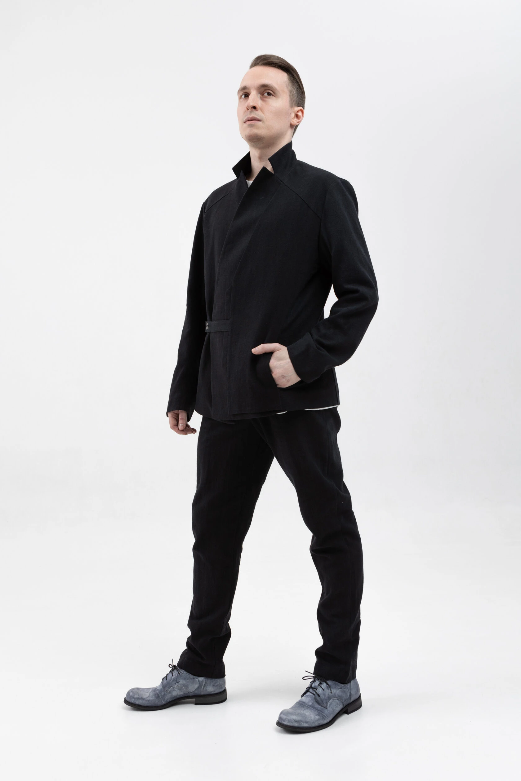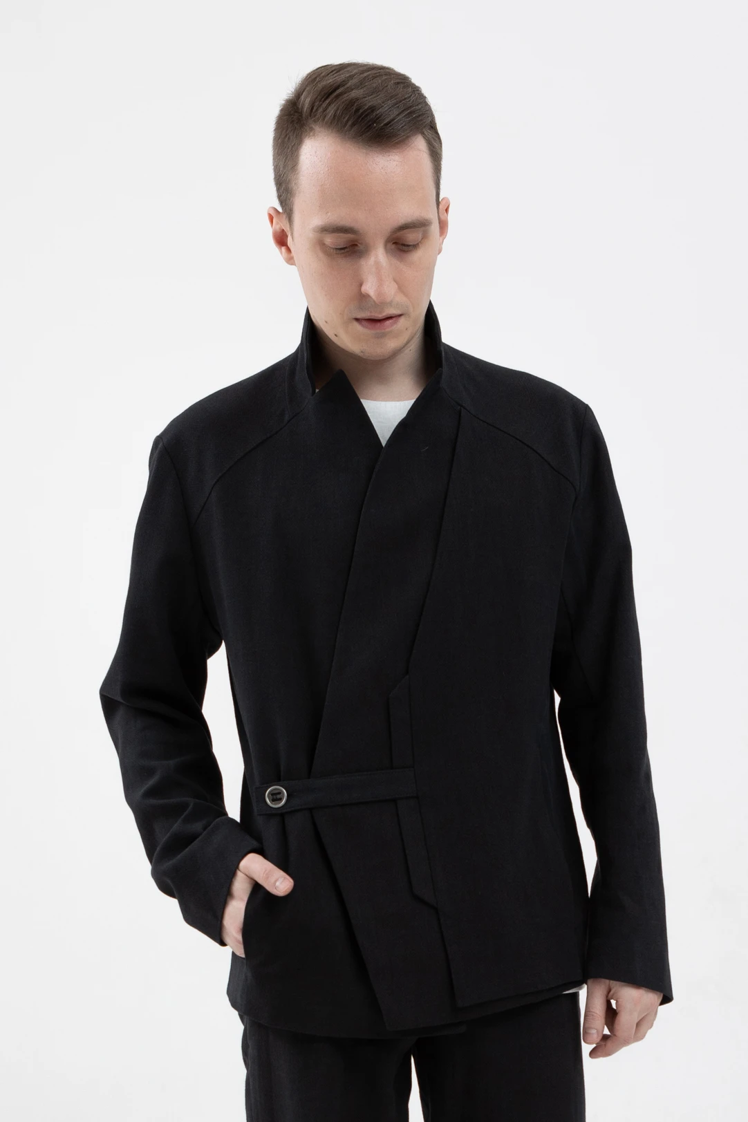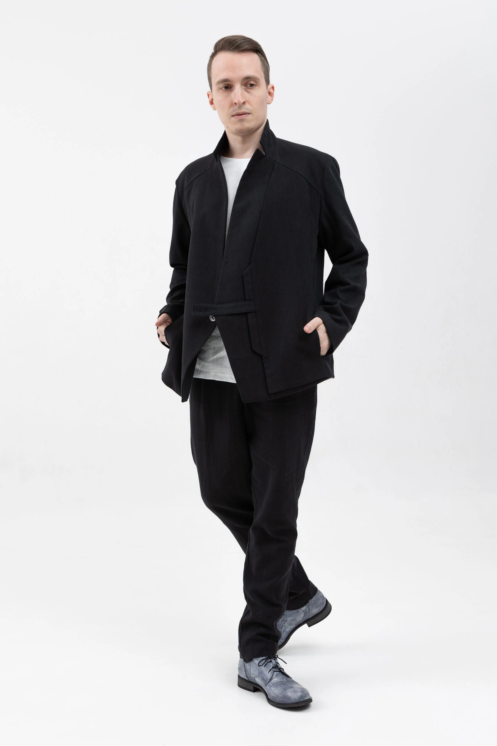 Лёгкая отсылка к мотивам кимоно — за счёт линий лацканов и многослойности, появившейся с асимметричной передней деталью, которая скрывает нагрудный карман.