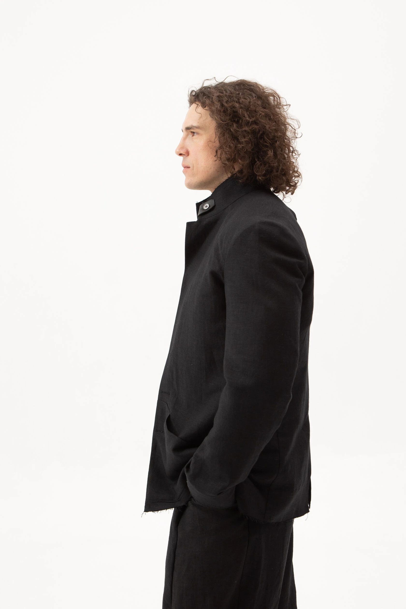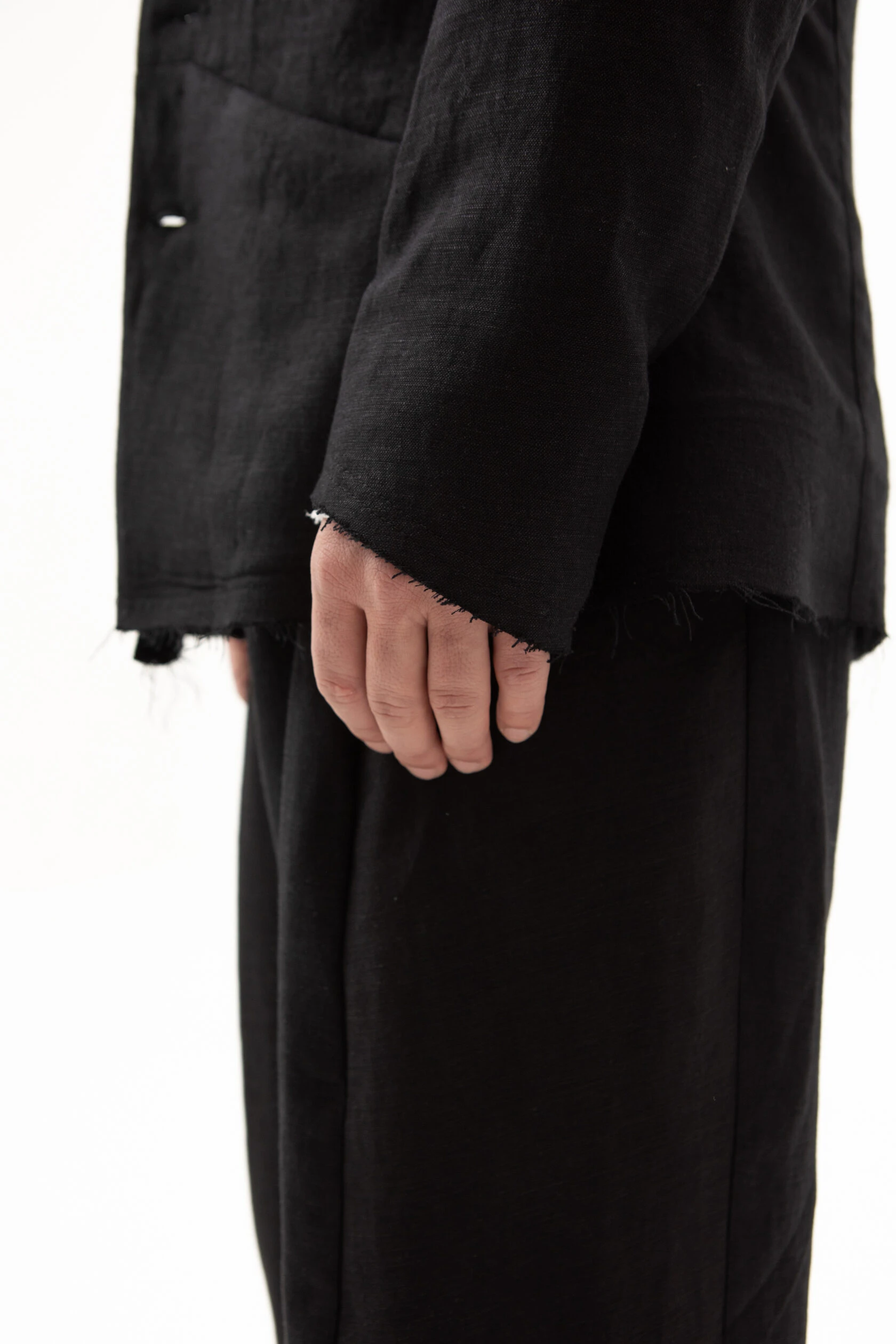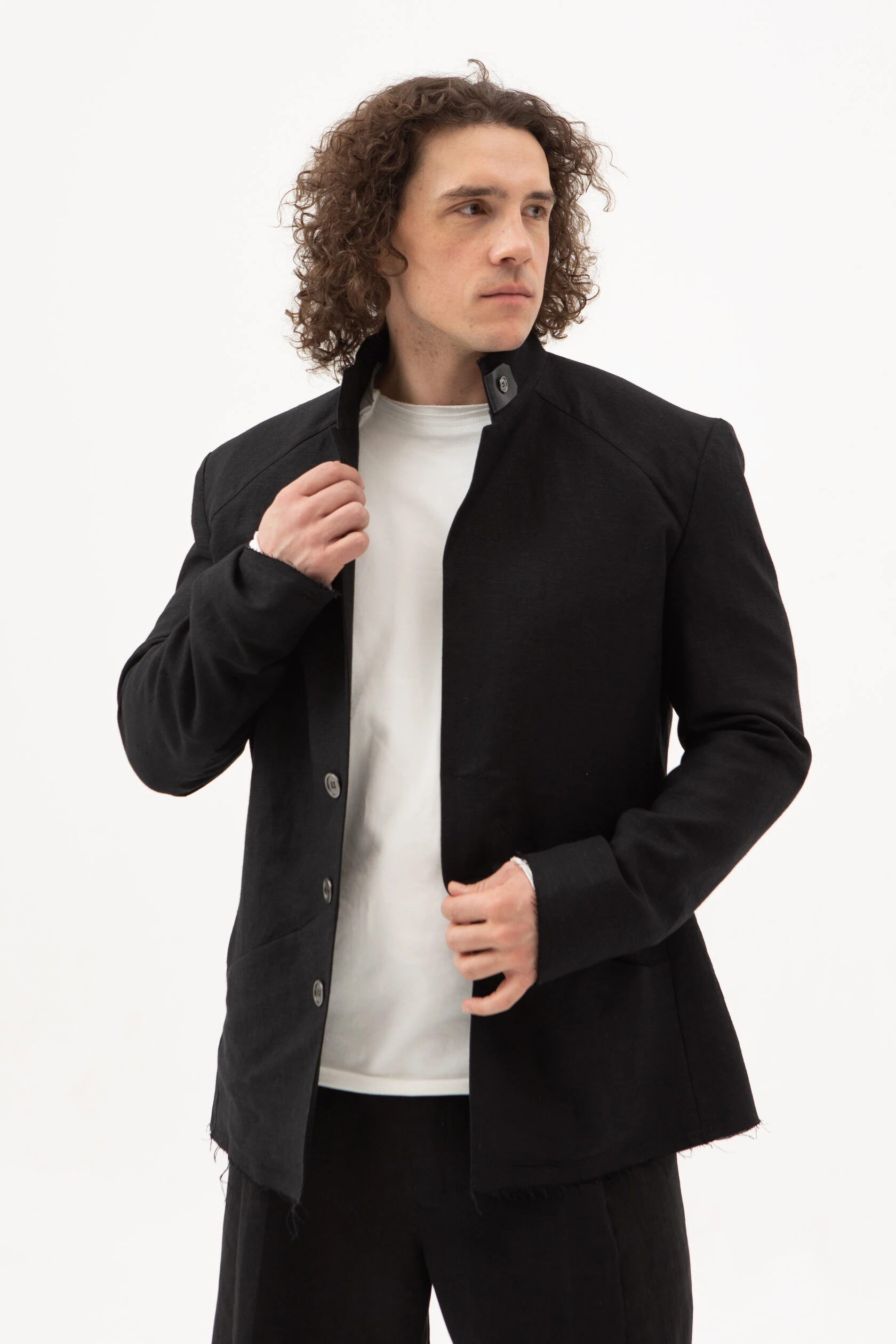 Верхний край воротника, низ рукава и низ жакета обработаны с открытыми срезами.