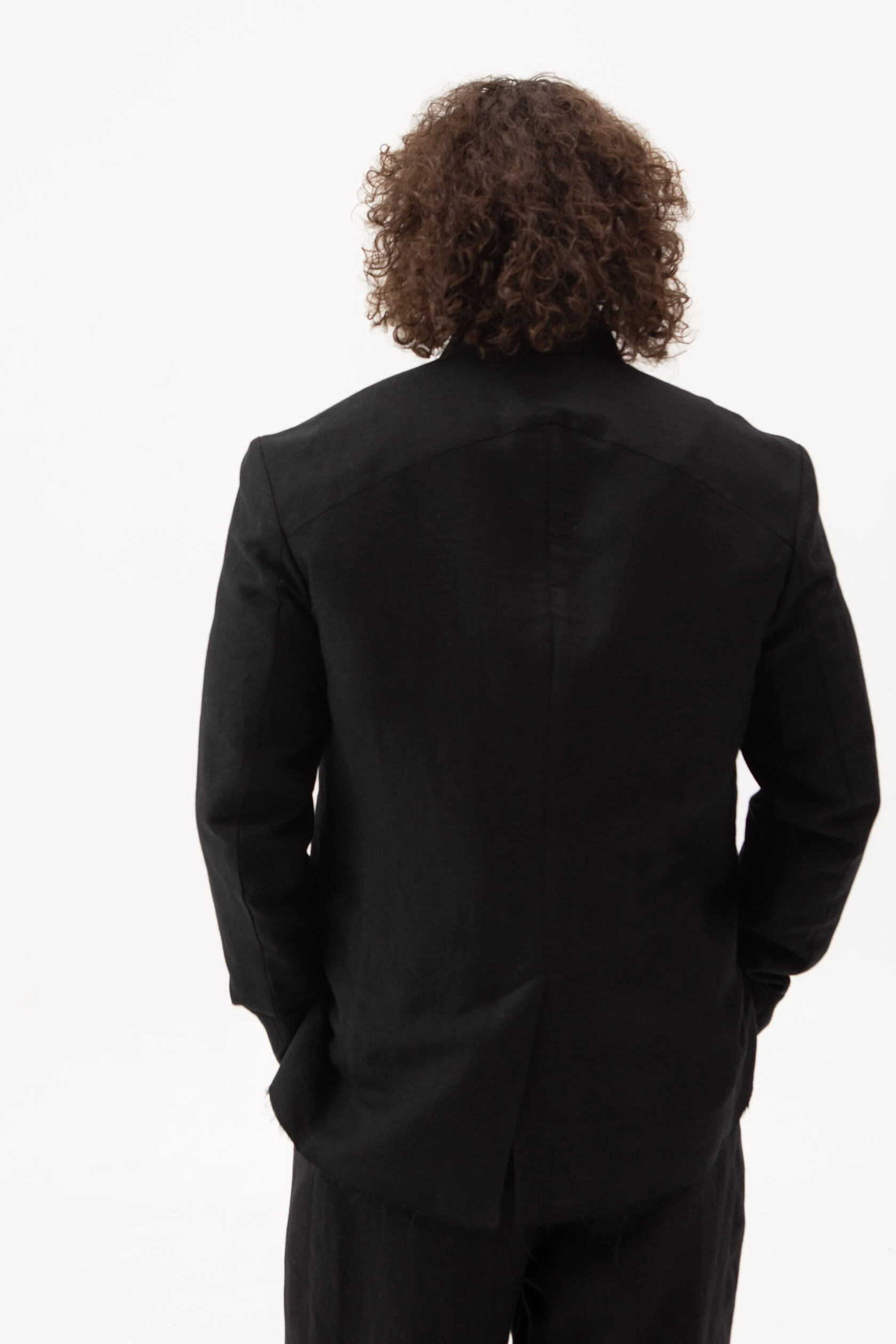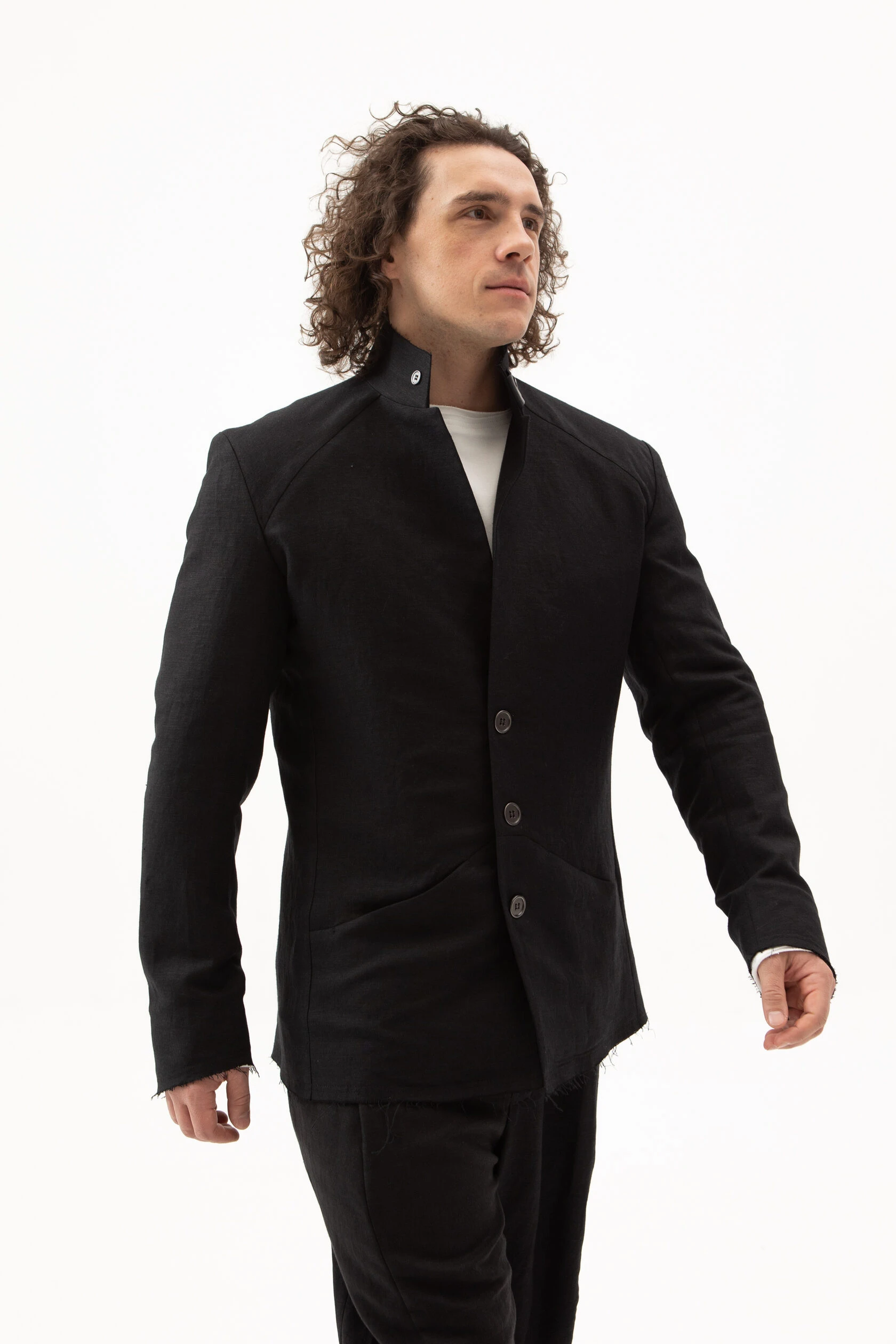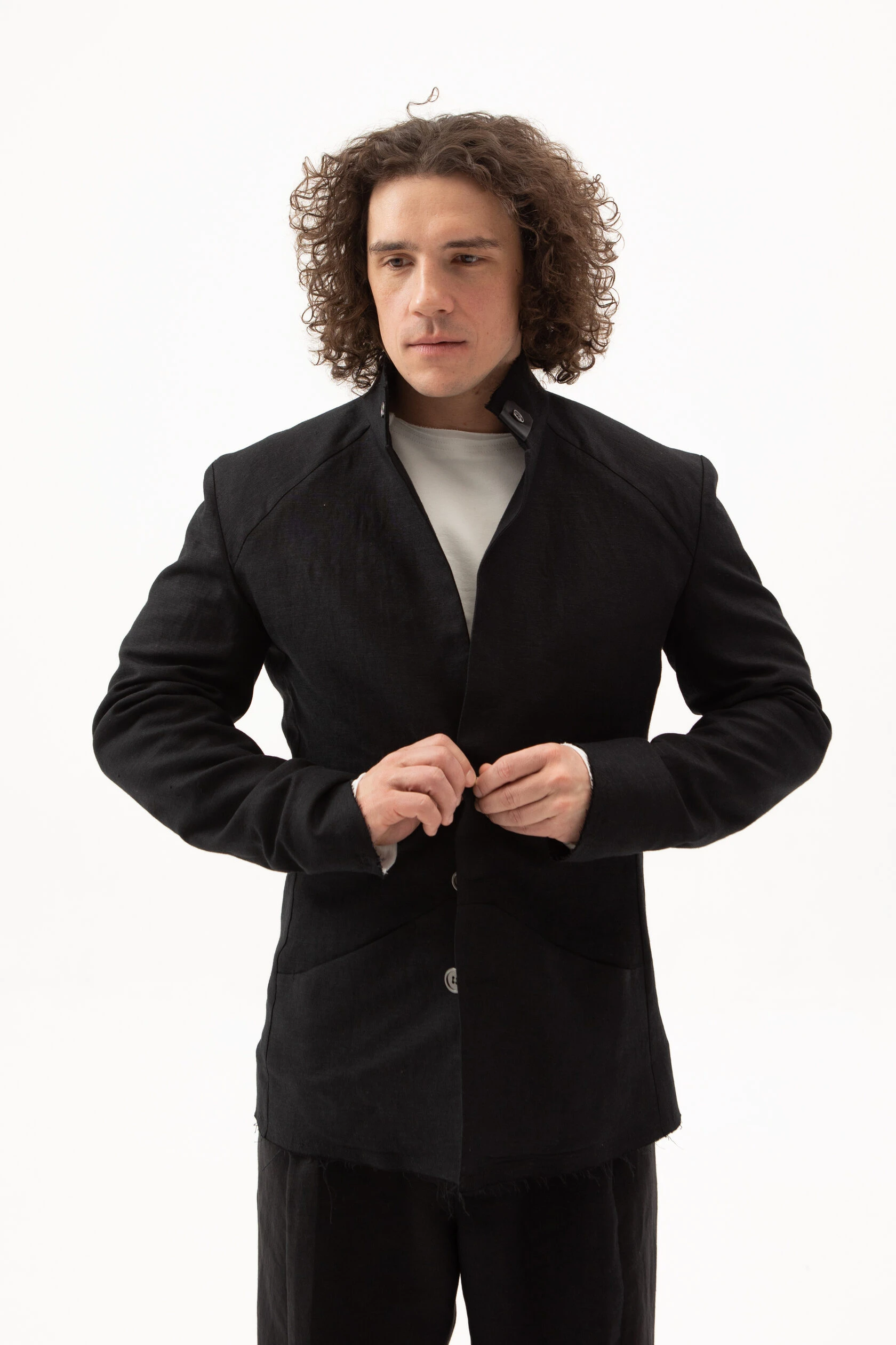 Верхний край воротника, низ рукава и низ жакета обработаны с открытыми срезами.