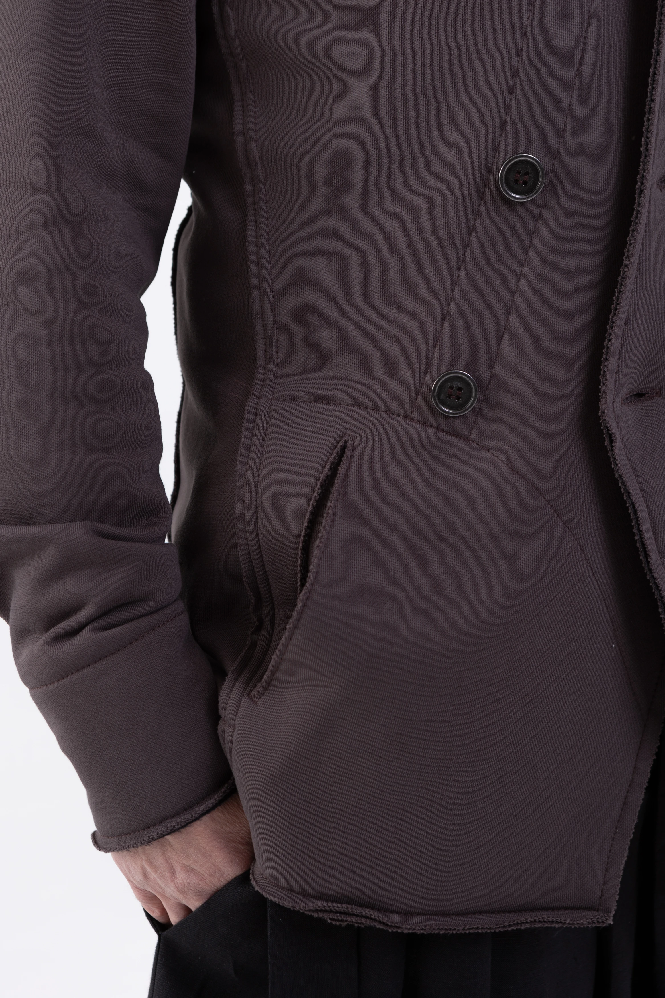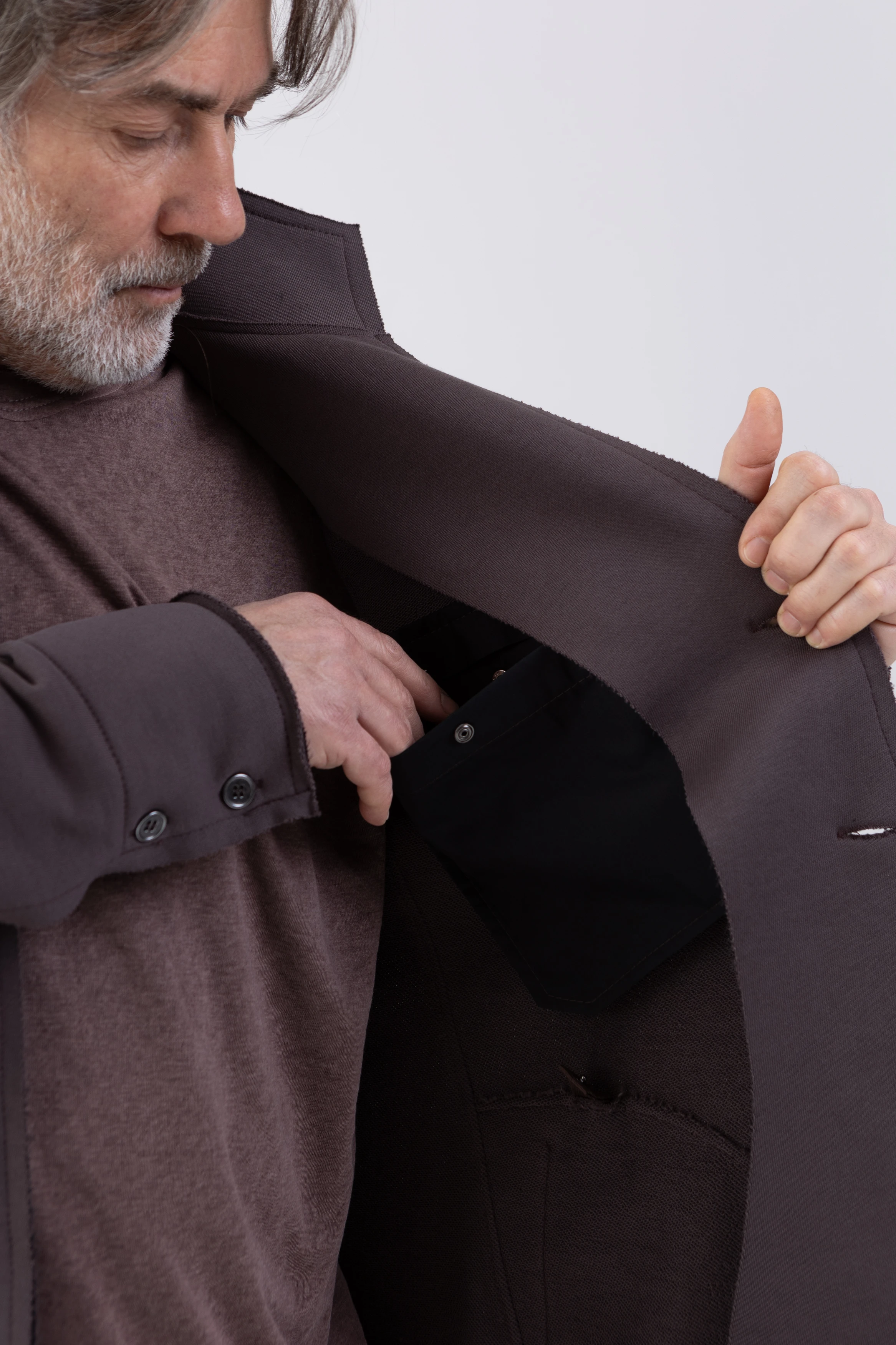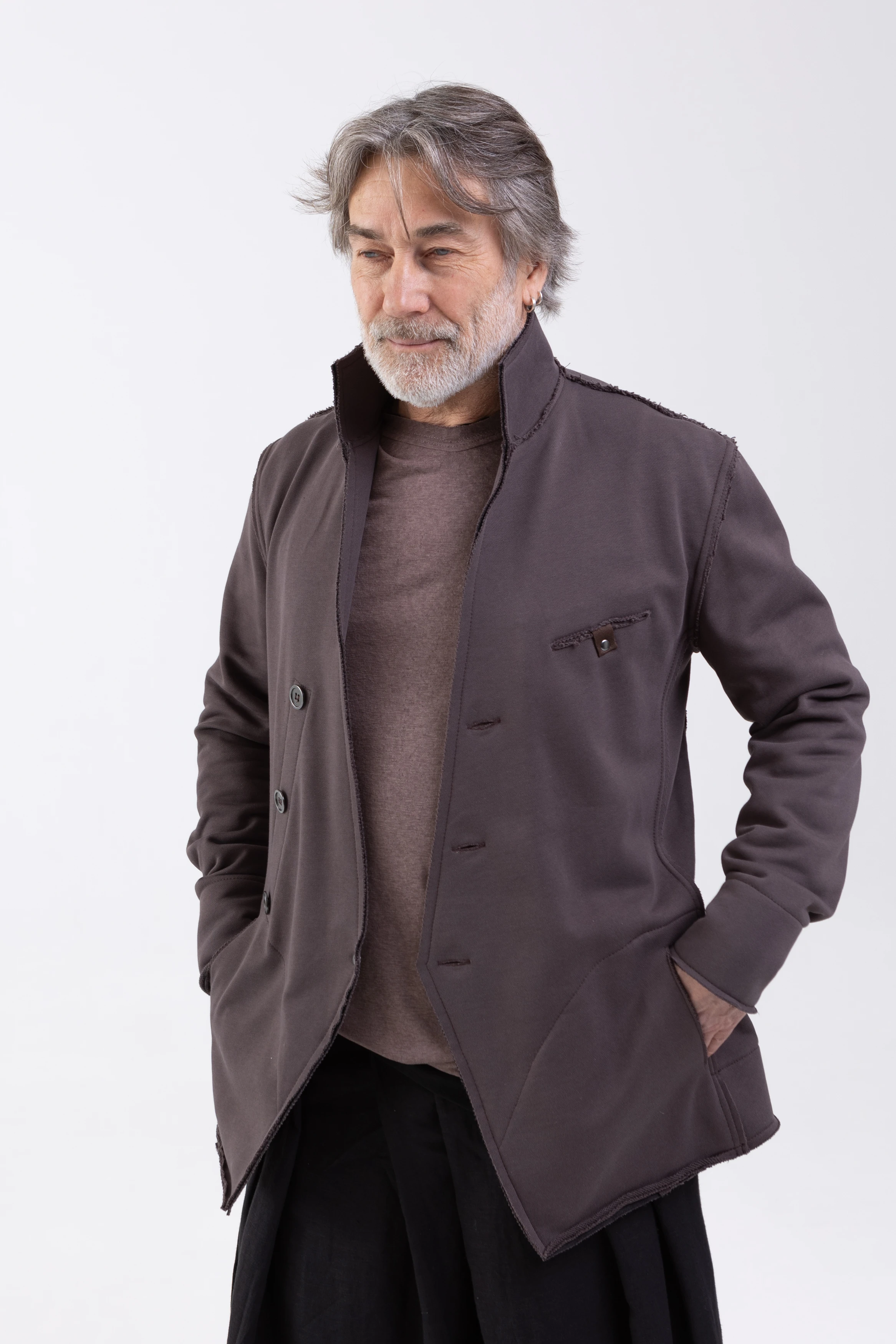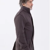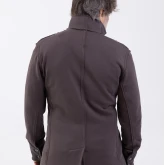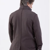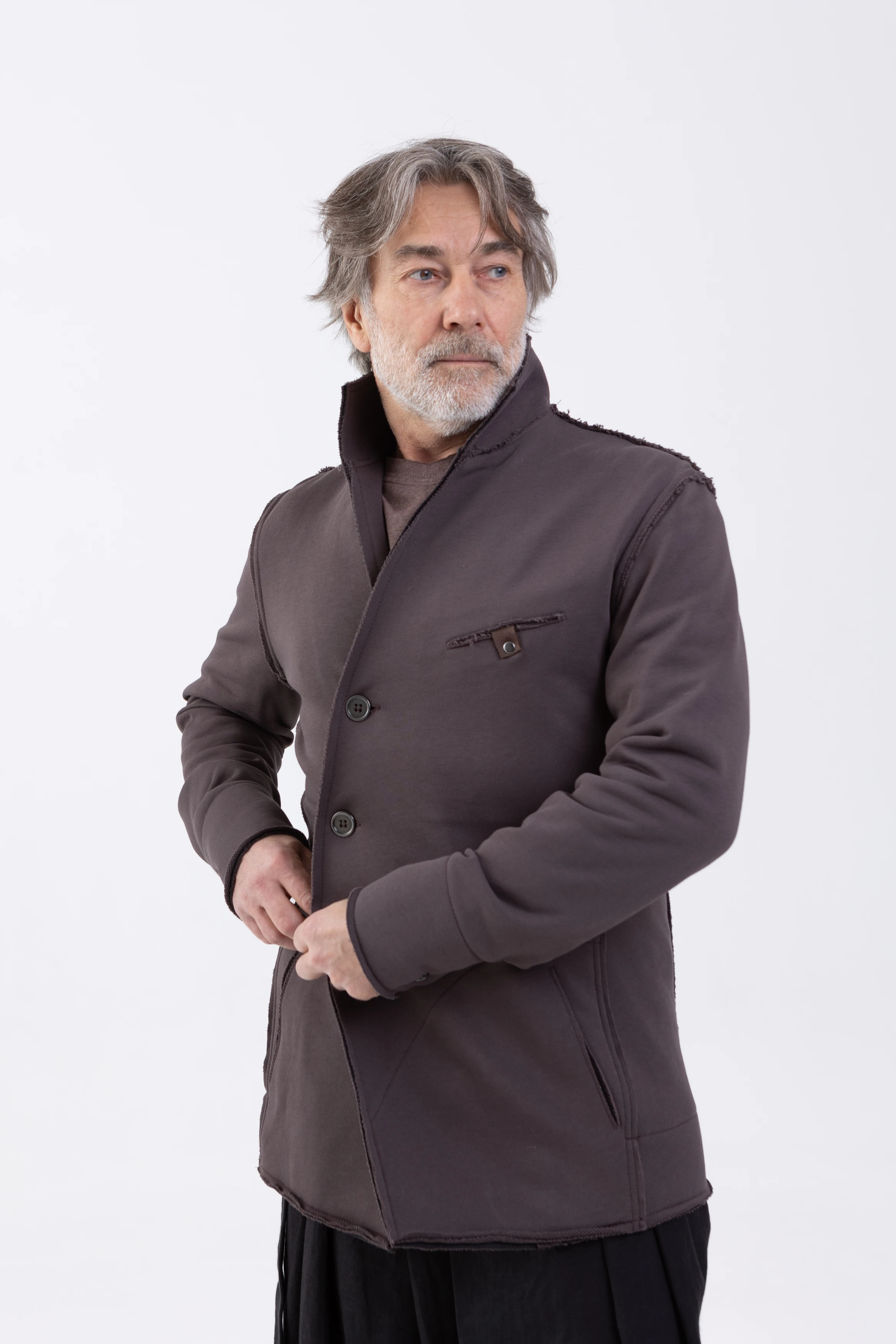 Жакет из плотного трикотажа приталенный, полуприлегающего силуэта. Двубортный, с диагональной застёжкой на пуговицах и дополнительной фиксацией внутреннего борта на маленькую кнопку.